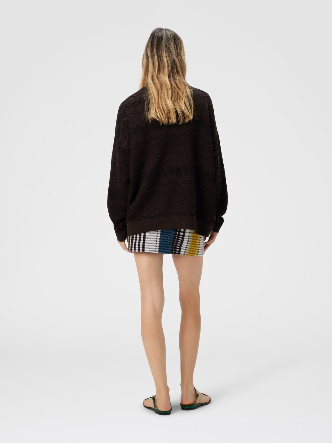 A contemporary homage to Missoni’s identity, this oversized V-neck women’s sweater reinterprets the maison’s iconic chevron in a modern way. Made in solid color in a soft blend of wool and viscose, it combines relaxed volumes and refined workmanship for a bold yet sophisticated look.