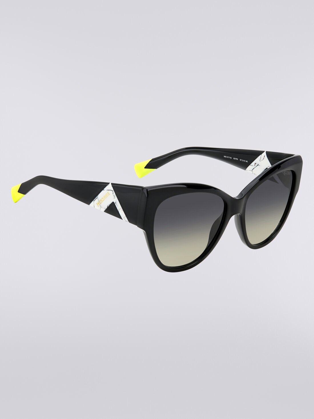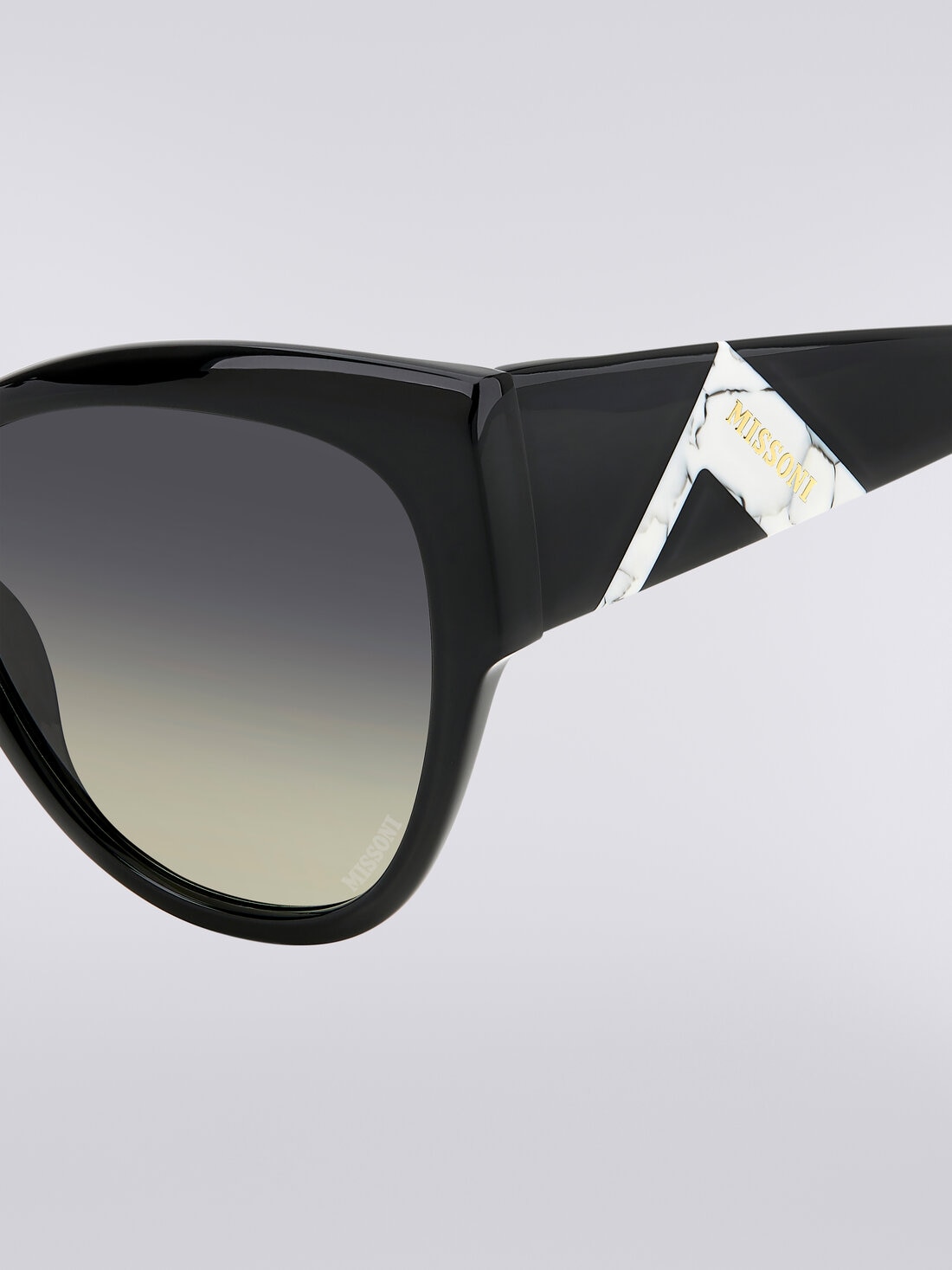 Missoni blends its stylistic codes with the sinuous curves of its rounded shape and the richness of its materials in this bold new model. The acetate frame is enriched by the use of the iconic plate in contrasting shades, engraved with the Missoni logo. Other recognisable brand features include the half-zigzag temple tips and the personalisation on the left lens.