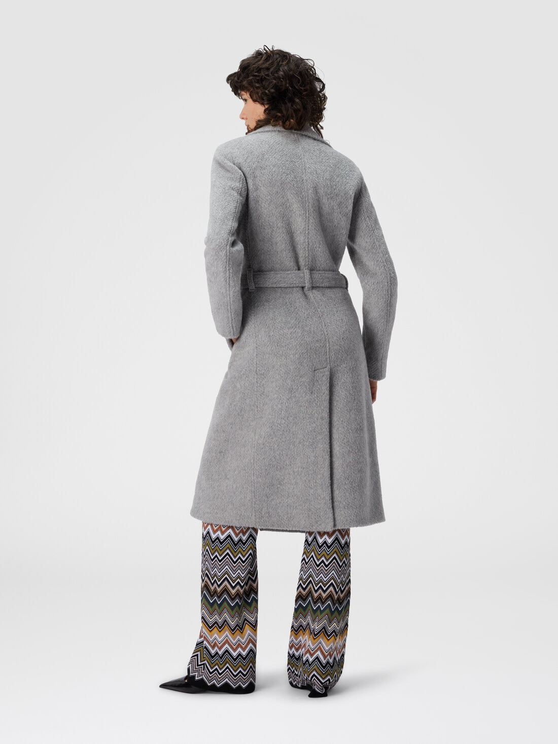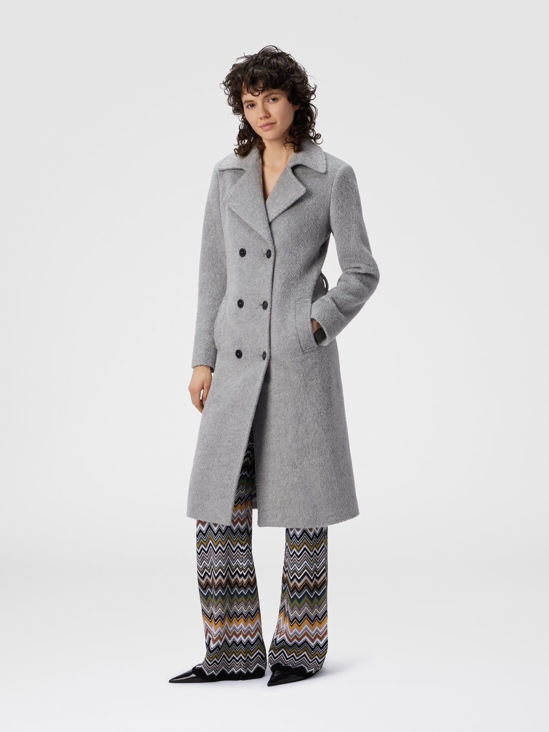 This long slim-fit double-breasted trench coat gently embraces the figure. The tone-on-tone chevron pattern, delicately embedded in an alpaca and wool blend, gives the garment depth and elegance. A distinctive essential coat that reflects Missoni’s sophisticated style.