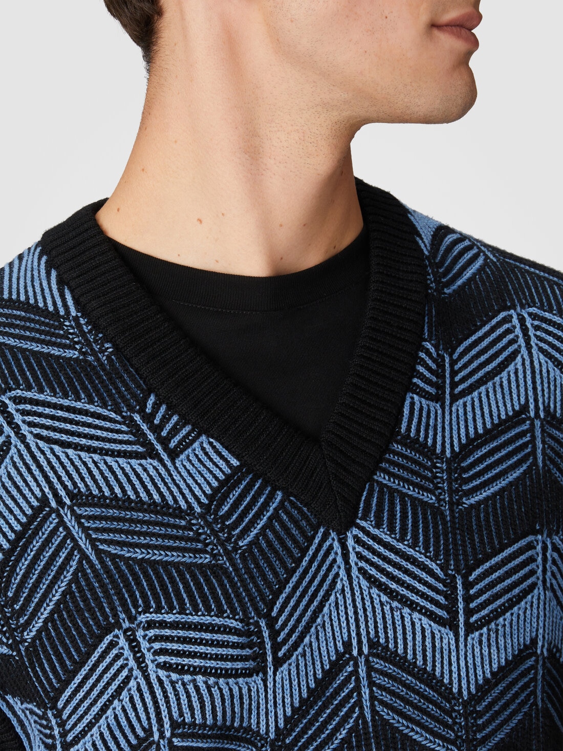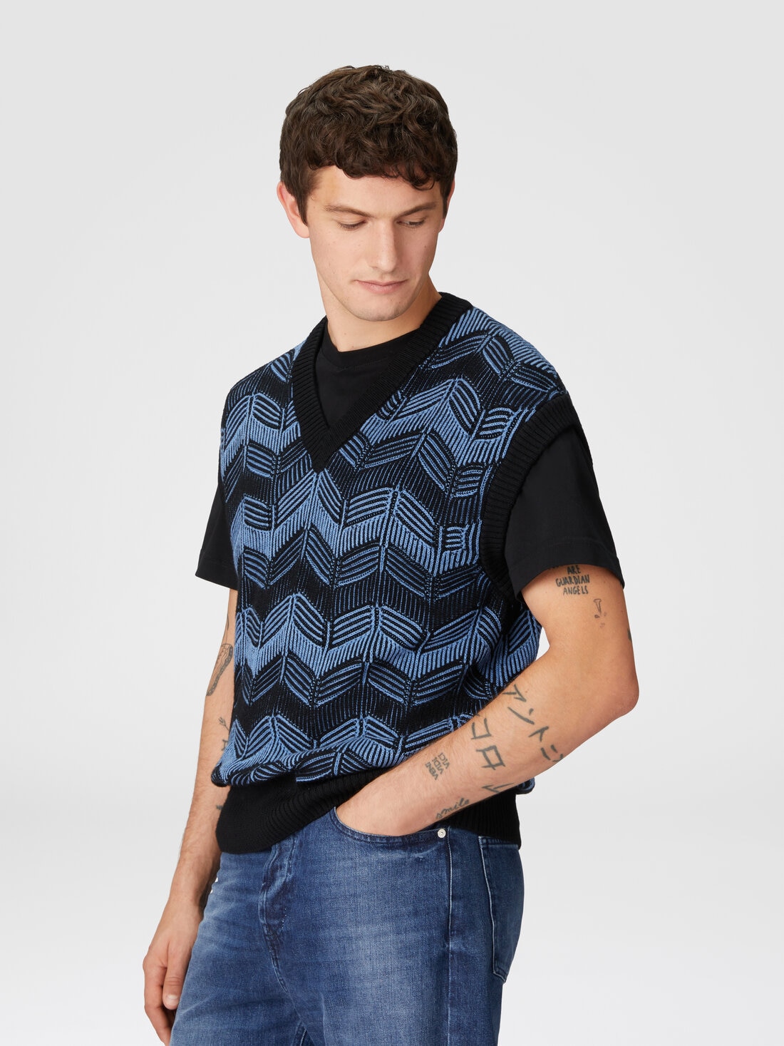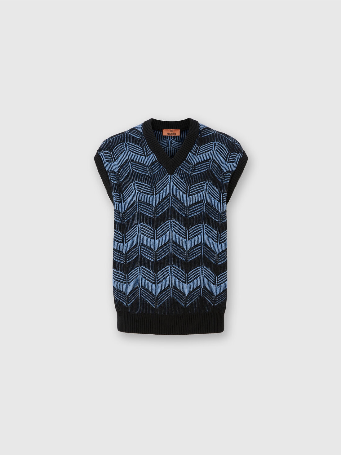 English rib with a zigzag gait for the virgin wool and cotton vest. Highlighted by ribbed piping, the V-neck style is simple yet refined.