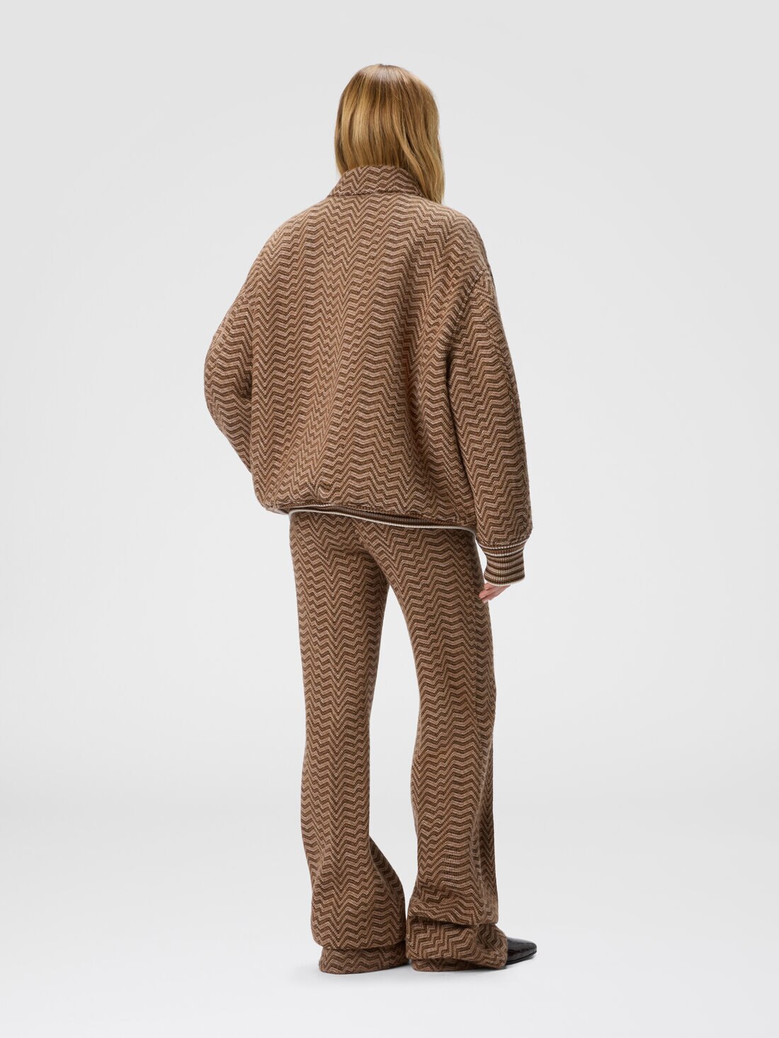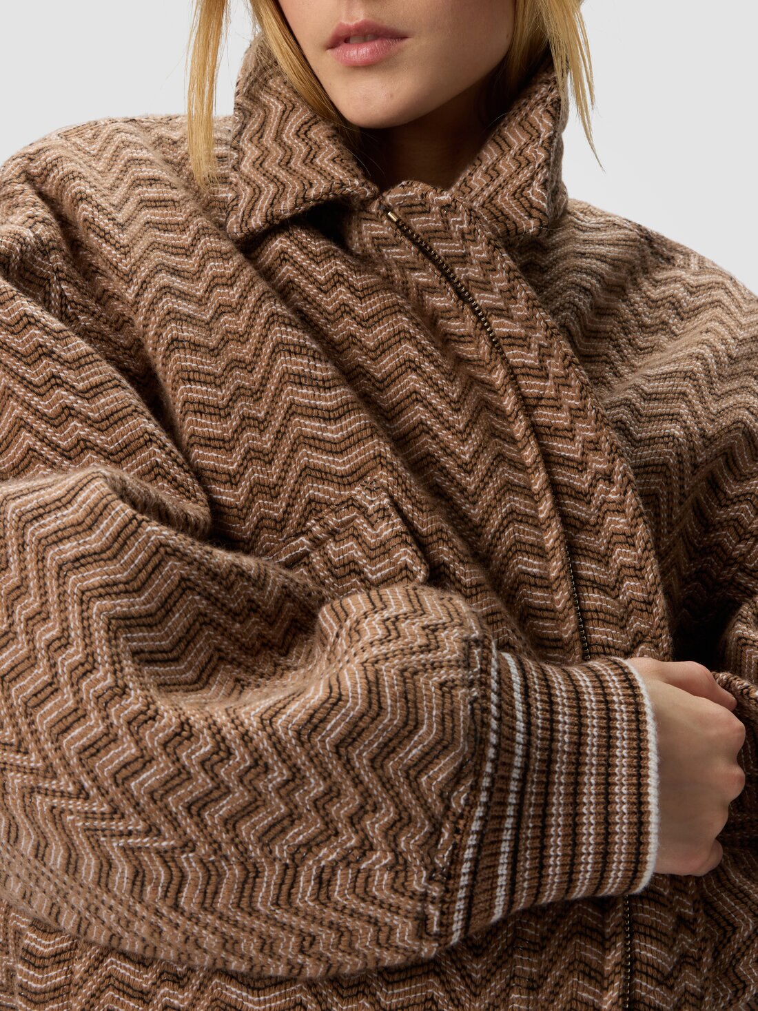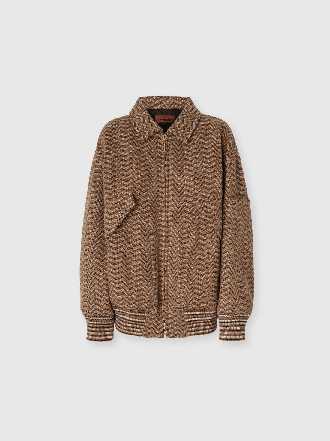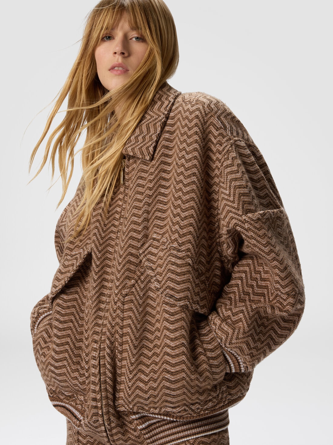 The signature craftsmanship of Missoni takes shape in this women's bomber jacket, made on a Caperdoni loom where an irregular chevron—an emblem of the maison—intertwines in a refined play of textures. The cotton-wool blend fabric provides both comfort and structure, enhancing the graphic design with a material, sophisticated finish. The bomber cut adds a contemporary touch to a garment that effortlessly fuses artisanal tradition with urban flair.