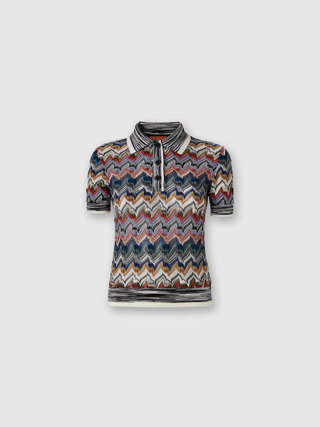An expression of craftsmanship and iconic style, this short-sleeve polo shirt with collar for women is made with refined raschel lacework that reinterprets Missoni’s iconic zigzag in a sophisticated way. Lamé threads provide a light and precious brightness, enhancing a design that unites modern elegance and the maison’s distinctive identity.