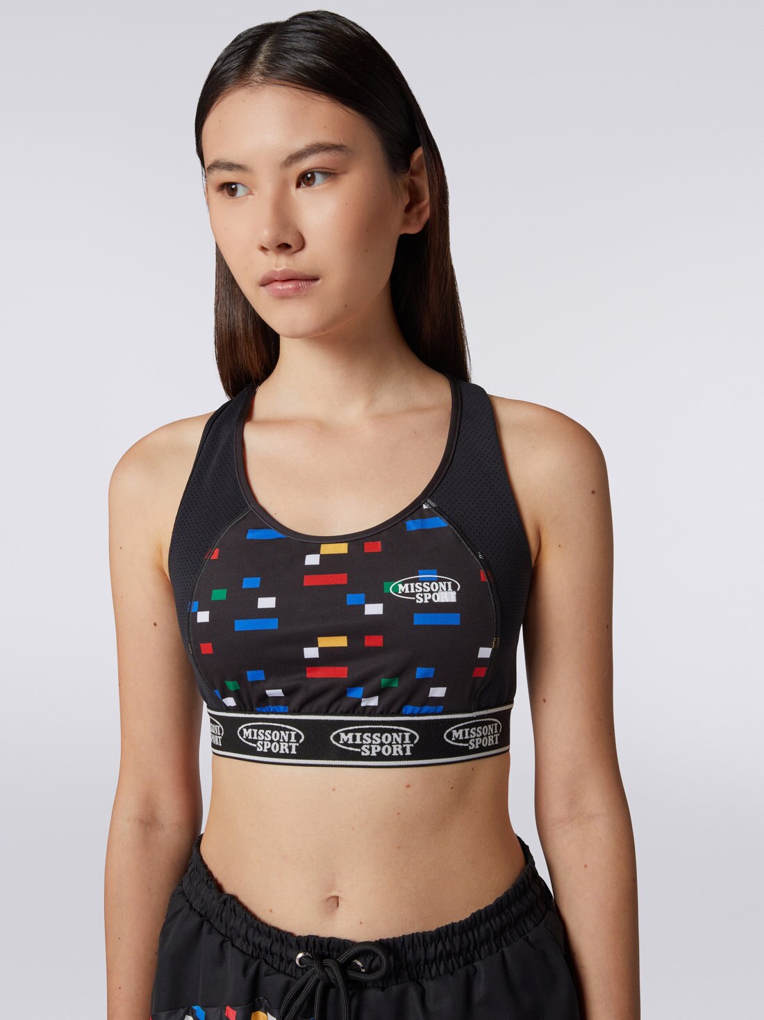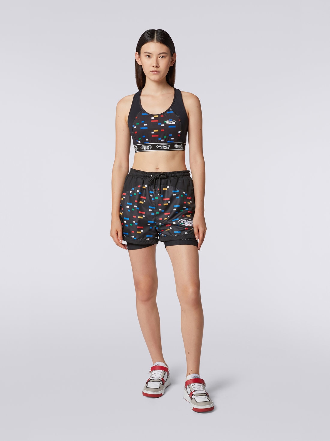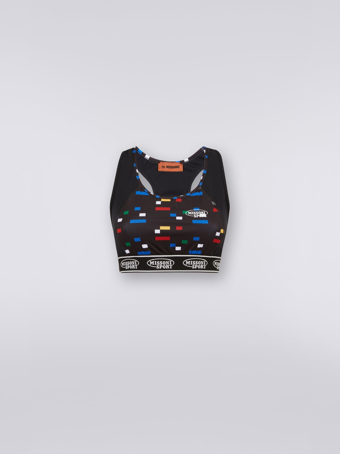 Instant recognition and grit to spare for the women’s crop top in stretch fabric. The piece is characterised by a multicoloured print with pixel effect graphics, mesh inserts and a bottom trimmed with contrasting branded elastic. The Olympic back neckline emphasises the sporty character of the garment, a clear tribute to the founder of the brand and his athletic commitment at the London 1948 Olympics.