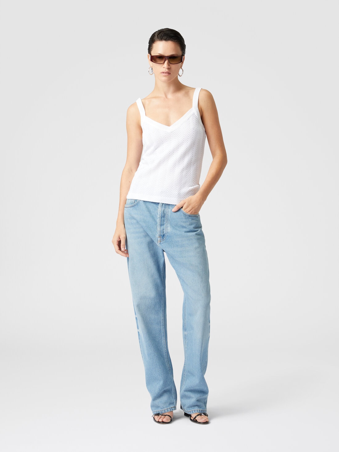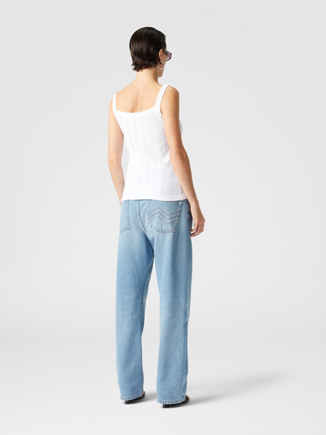 An ode to Missoni's craftsmanship, this tank top stands out for its intricate tone-on-tone zigzag and the finesse of the raschel workmanship. The cotton and viscose blend gives it an impalpable lightness, which blends with the chromatic refinement of the fabric, creating a garment that breathes the discreet and sophisticated elegance of the maison.