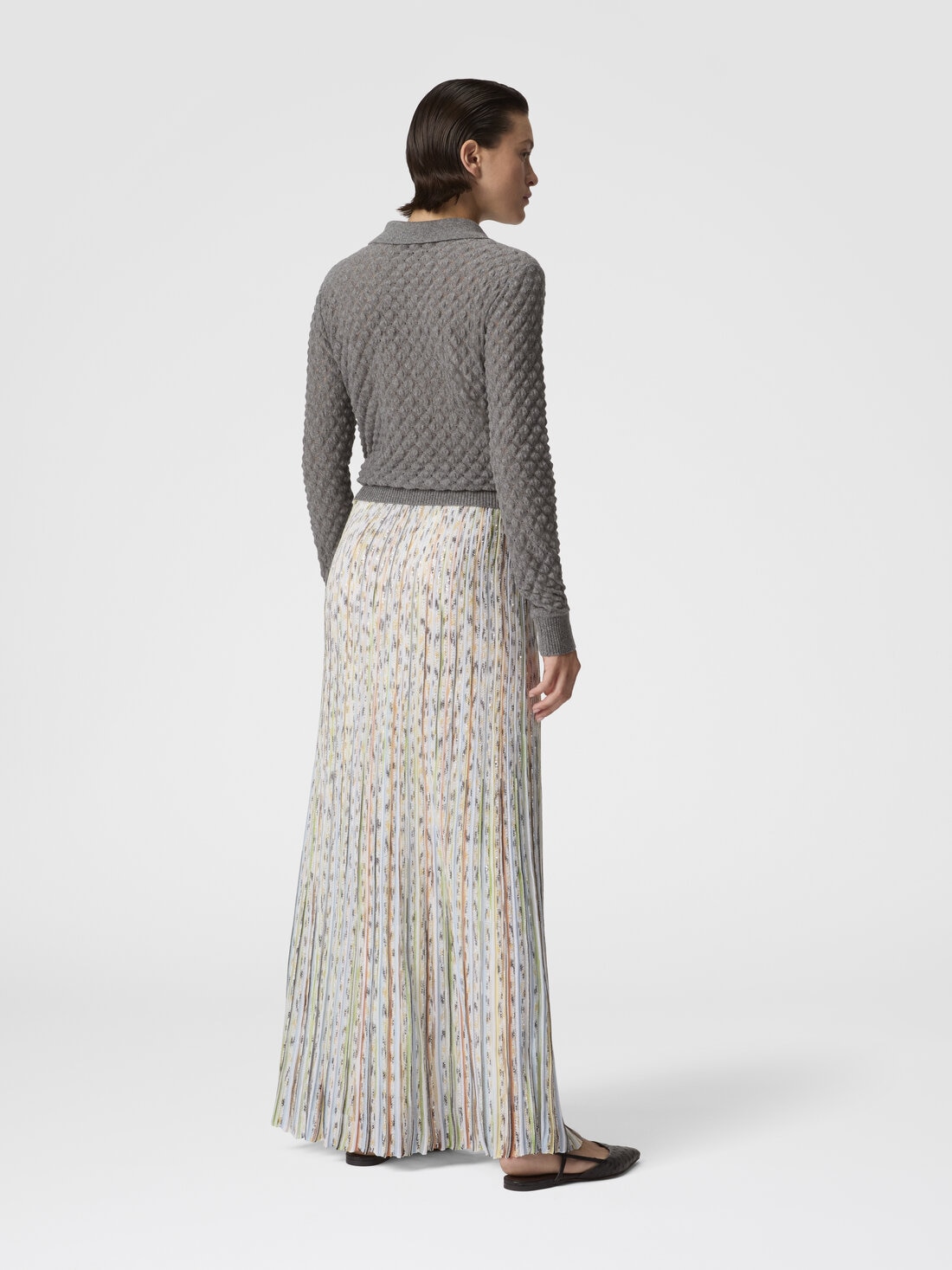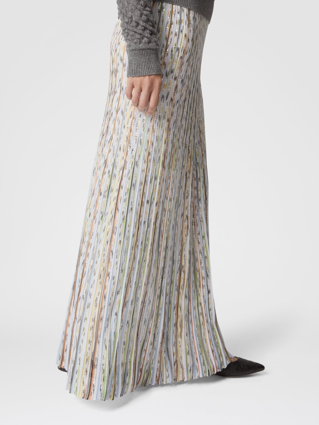 A piece of refined lightness: this long women’s skirt in ribbed slub viscose is embellished with sequins that enhance its luminosity, reflecting Missoni’s artisanal mastery and contemporary elegance.