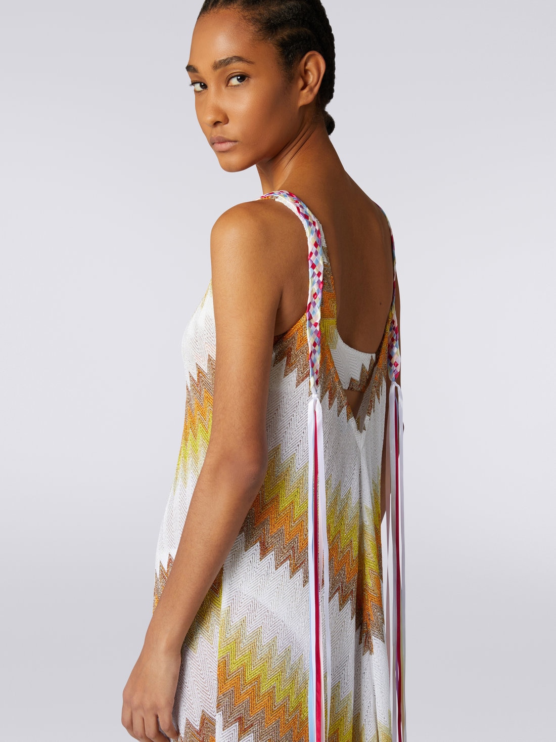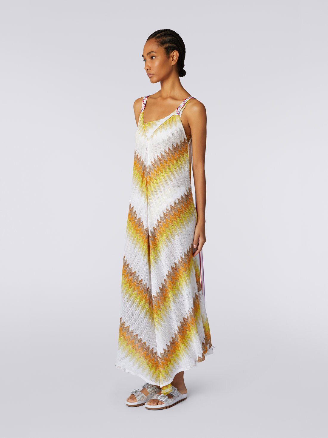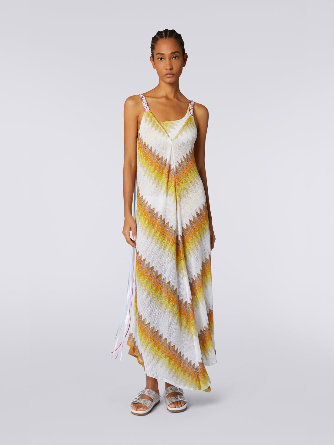 The dégradé version of the zigzag, criss-crossed with lamé thread, enriches the women’s long cover up with lunar glow. The piece with a neck scarf cut and asymmetrical bottom, alongside a plunging V neckline, features multicoloured braided ribbon straps.