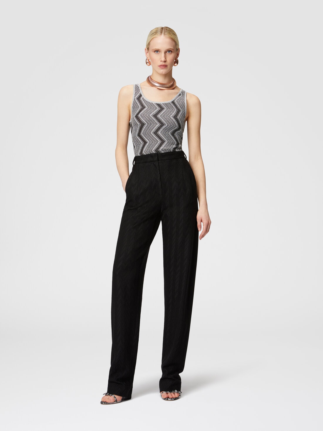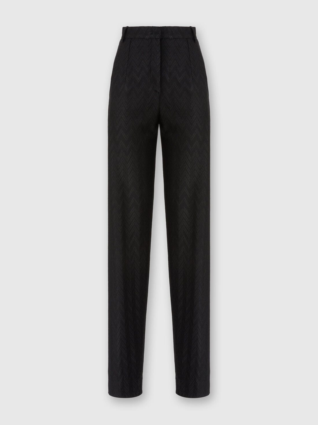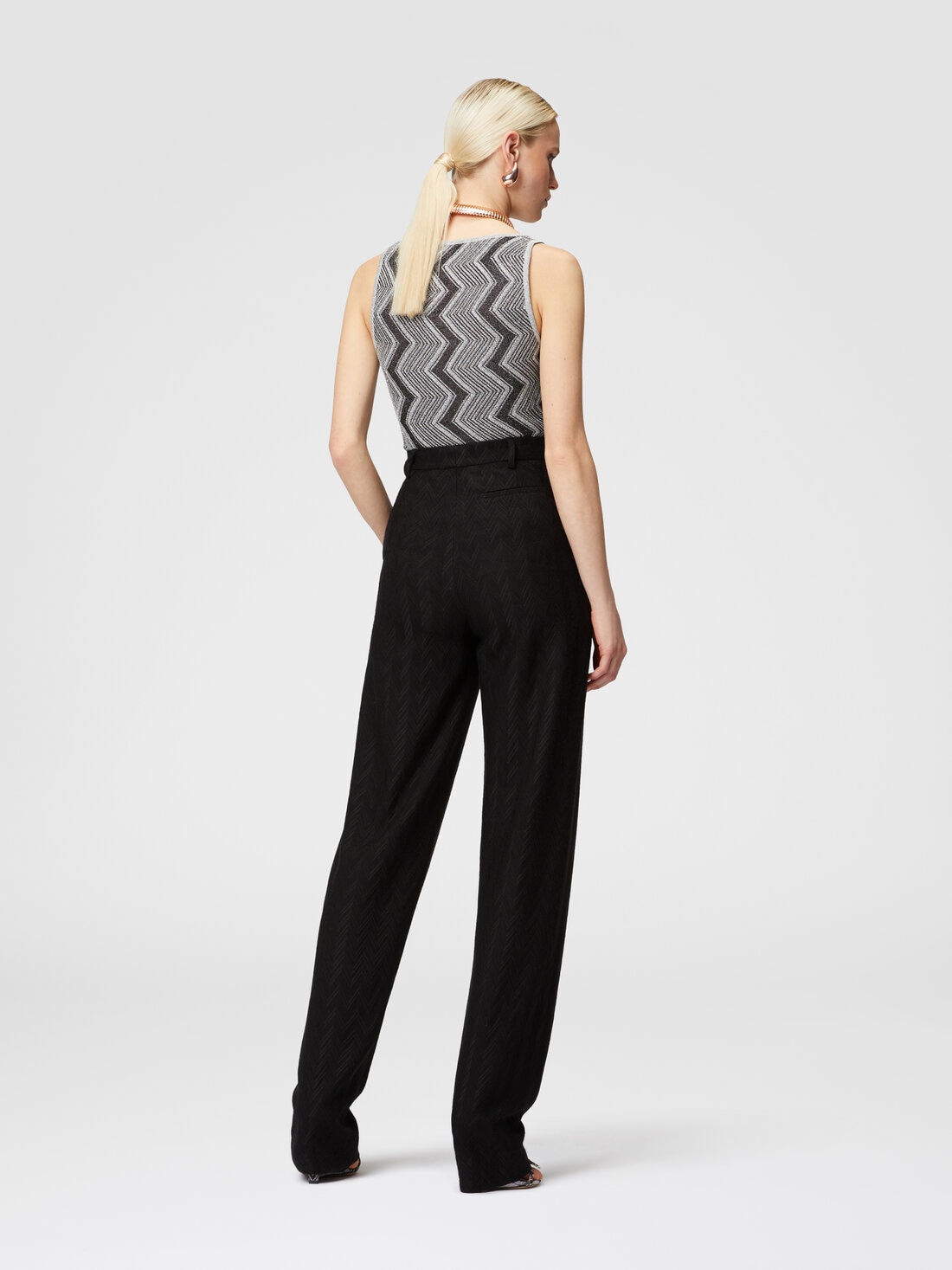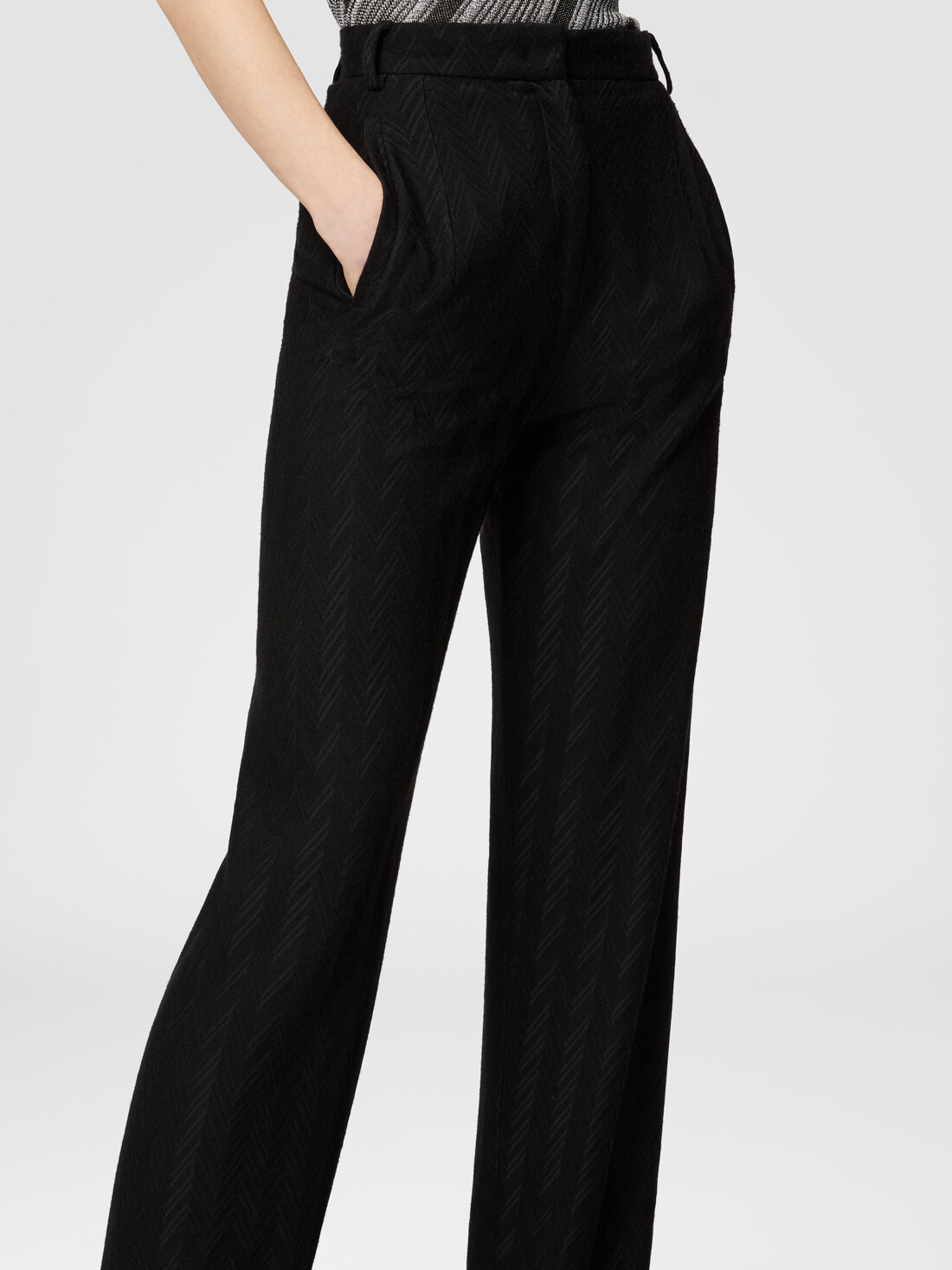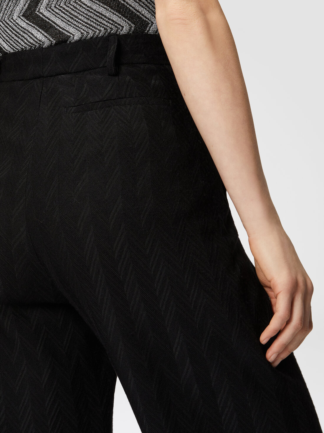 A texture with a tone-on-tone zigzag motif, alternating glossy and matte, characterizes the carrot-cut trousers, made of viscose and wool.