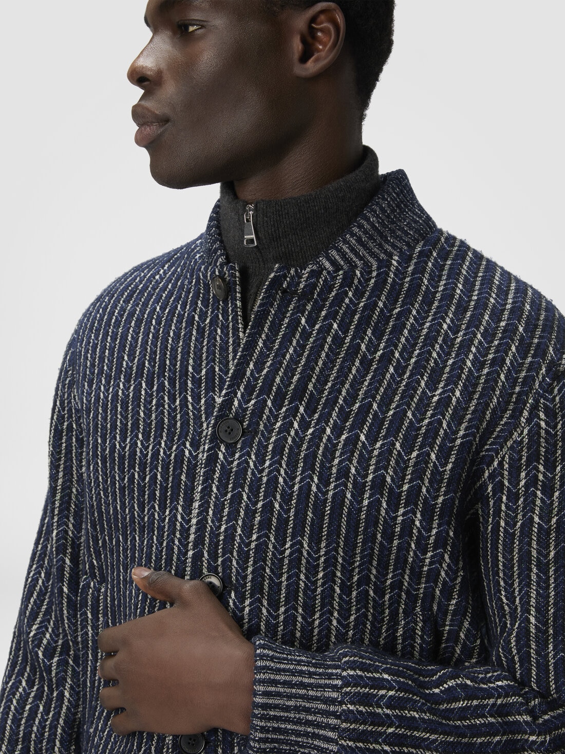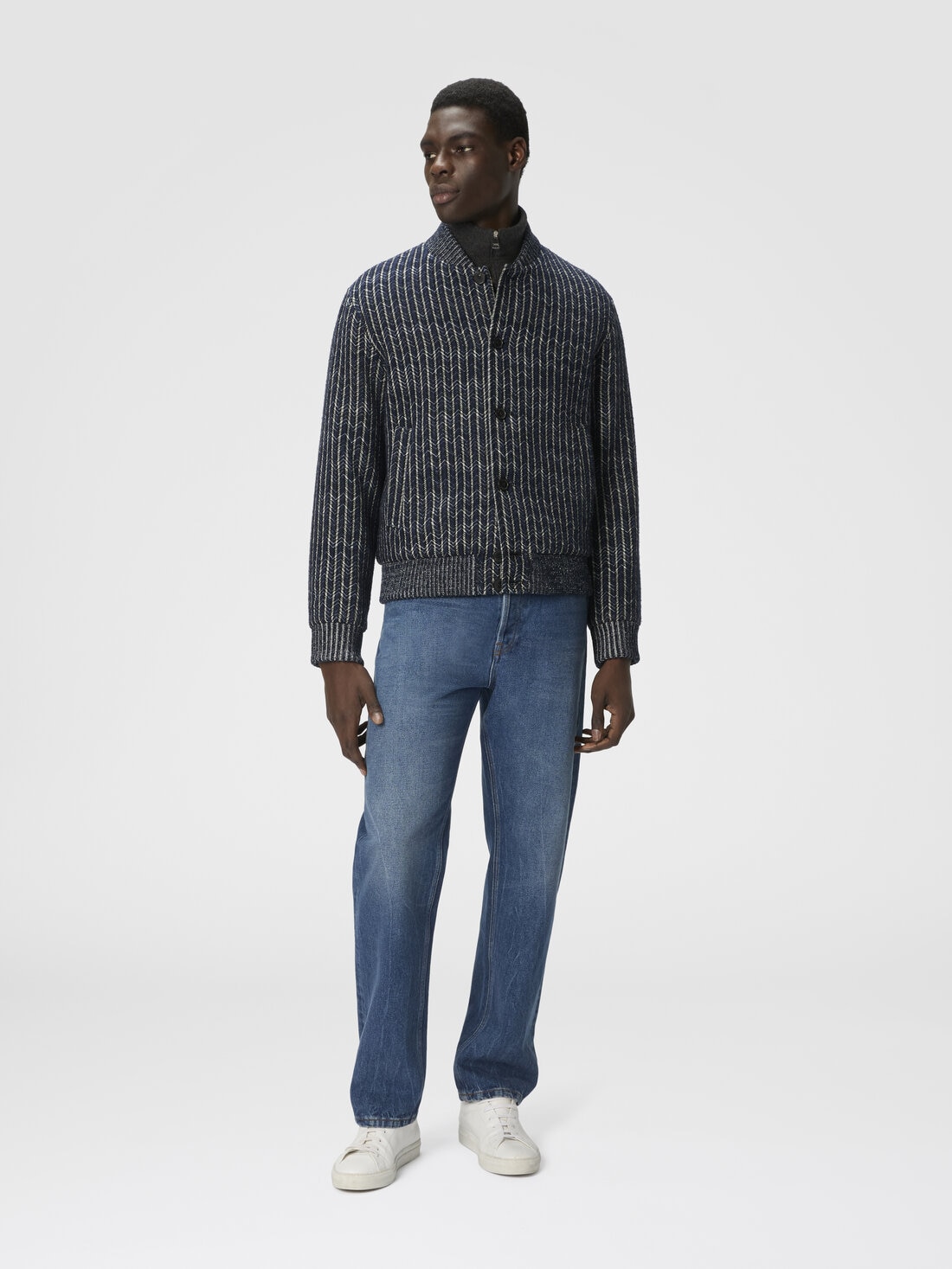 Men’s bomber jacket made on a loom from a wool and cotton blend, enriched with buttons and a distinctive zigzag pattern. A garment that merges functionality and style, with refined workmanship reflecting Missoni’s contemporary elegance for a dynamic and sophisticated look.