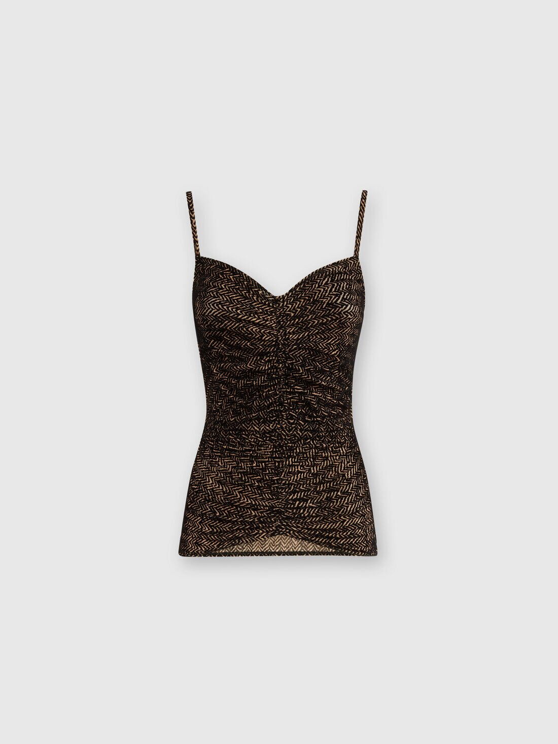 The front gathering and generous neckline characterize the tulle tank top with zigzag flocked print. Made of stretch fabric, the top emphasizes the bust with a new interpretation of the chevron.