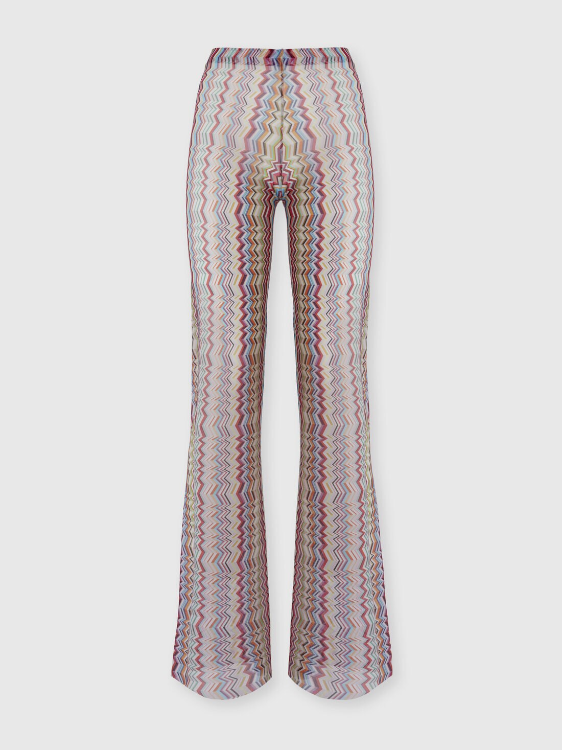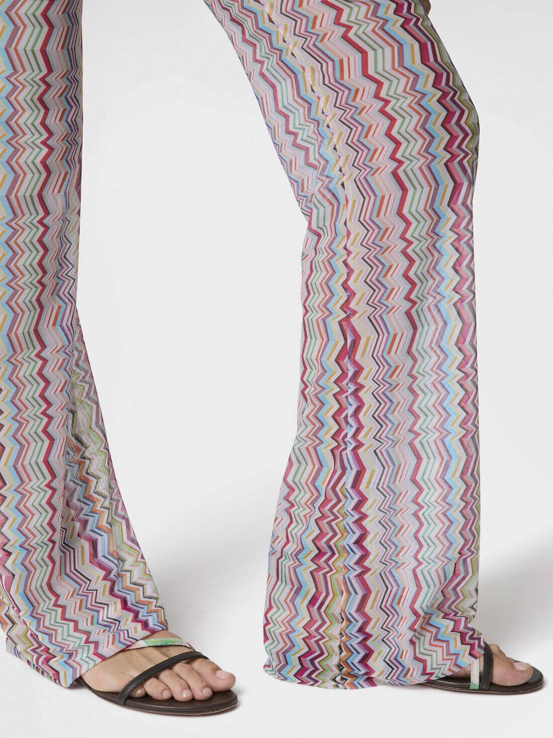 Women’s flared pants in printed zigzag tulle, where the fabric’s delicate transparency enhances the fluidity of the lines and the vibrancy of the iconic prints. A piece that naturally interprets the balance between lightness, color, and Missoni refinement.