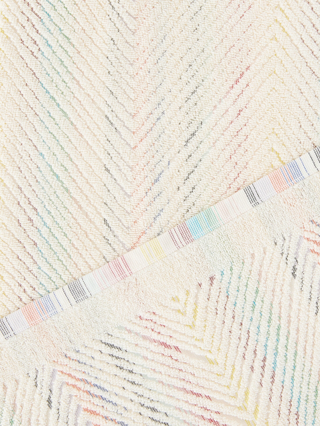 Here is the MissoniHome bathroom set: the Harmony towels, featuring a refined chevron pattern. Made of high-quality cotton terry velour, the towels offer not only softness but also a touch of elegance. The Jacquard edges add a further classy detail to this high-quality set, perfect for an indulgent and luxurious experience.