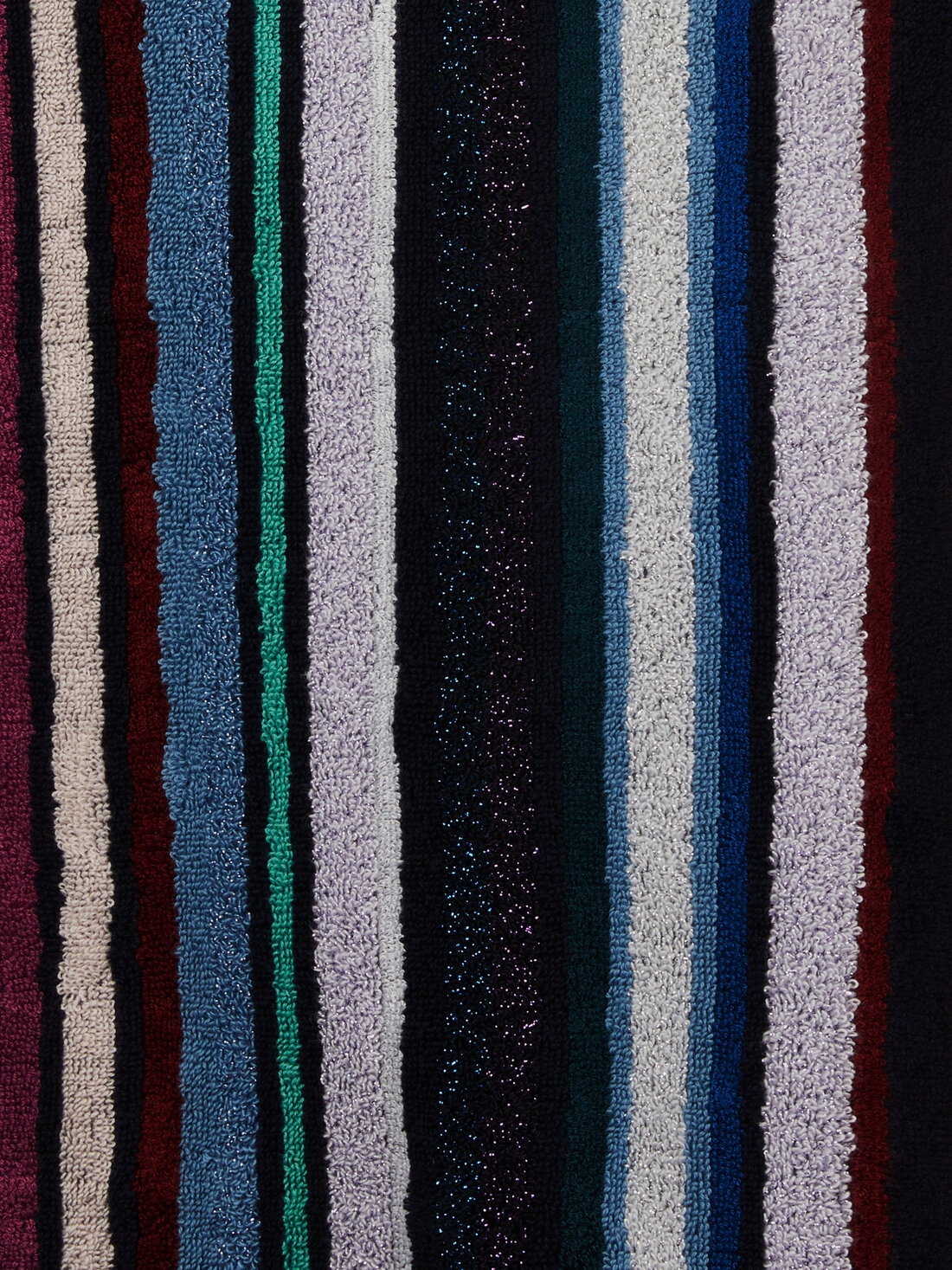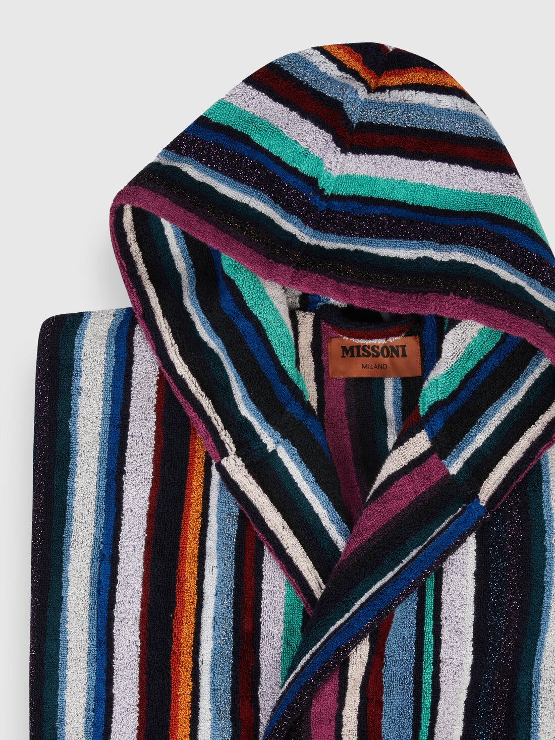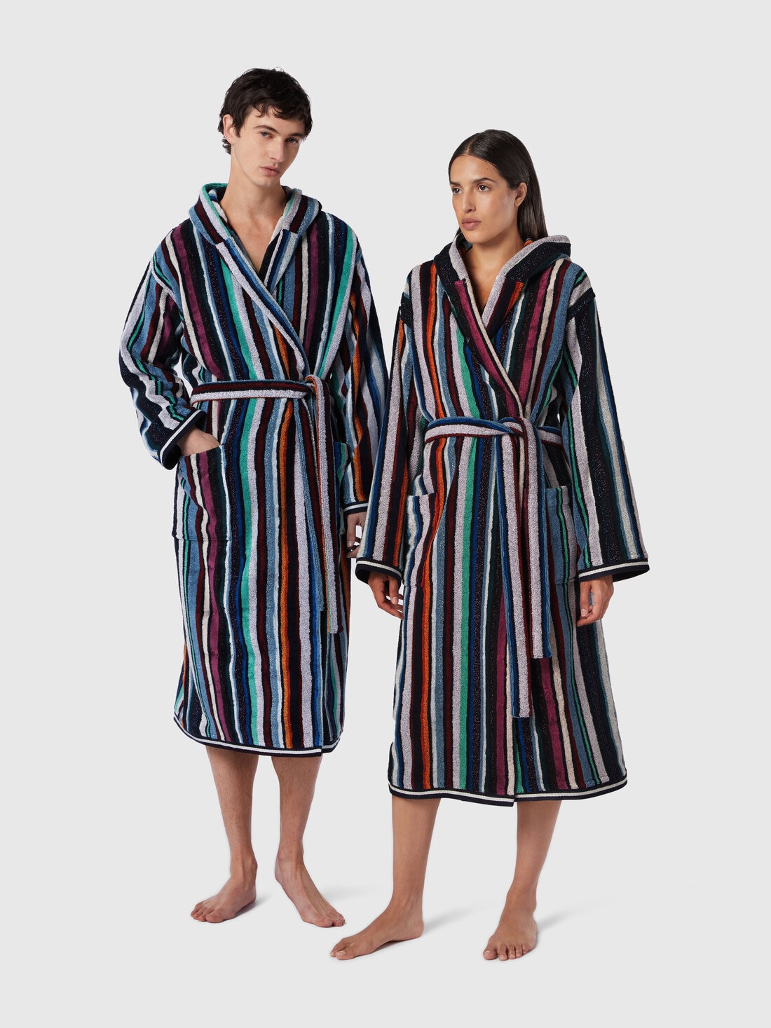 The Chandler cotton terry bathrobe combines luxury and liveliness. With its surface brightened by the glow of lurex, the garment offers a contemporary take on the classic bathing dressing gown. The vibrant stripes add a touch of colour and personality, while the waistband and patch pockets offer practicality and comfort. Suitable for both him and her, it is perfect for pampering yourself after a shower or bath in style and comfort.