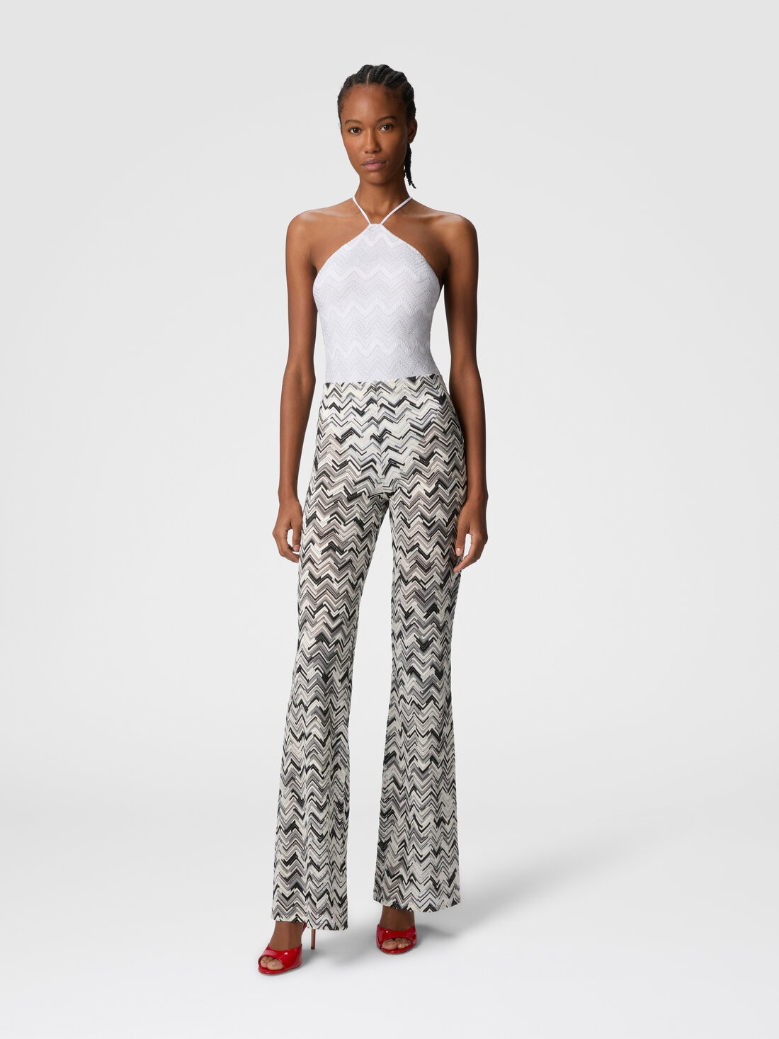Vibrant reflections run through these flared trousers for women, crafted from a viscose blend with the iconic slub zig-zag pattern. The flared cut gives a natural and slender elegance, while the play of colors creates a dynamic and sophisticated effect. Perfect for enriching any look with a distinctive touch, these trousers combine the refinement of Missoni workmanship with the versatility of a contemporary garment.