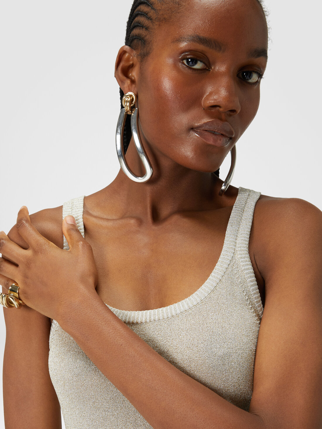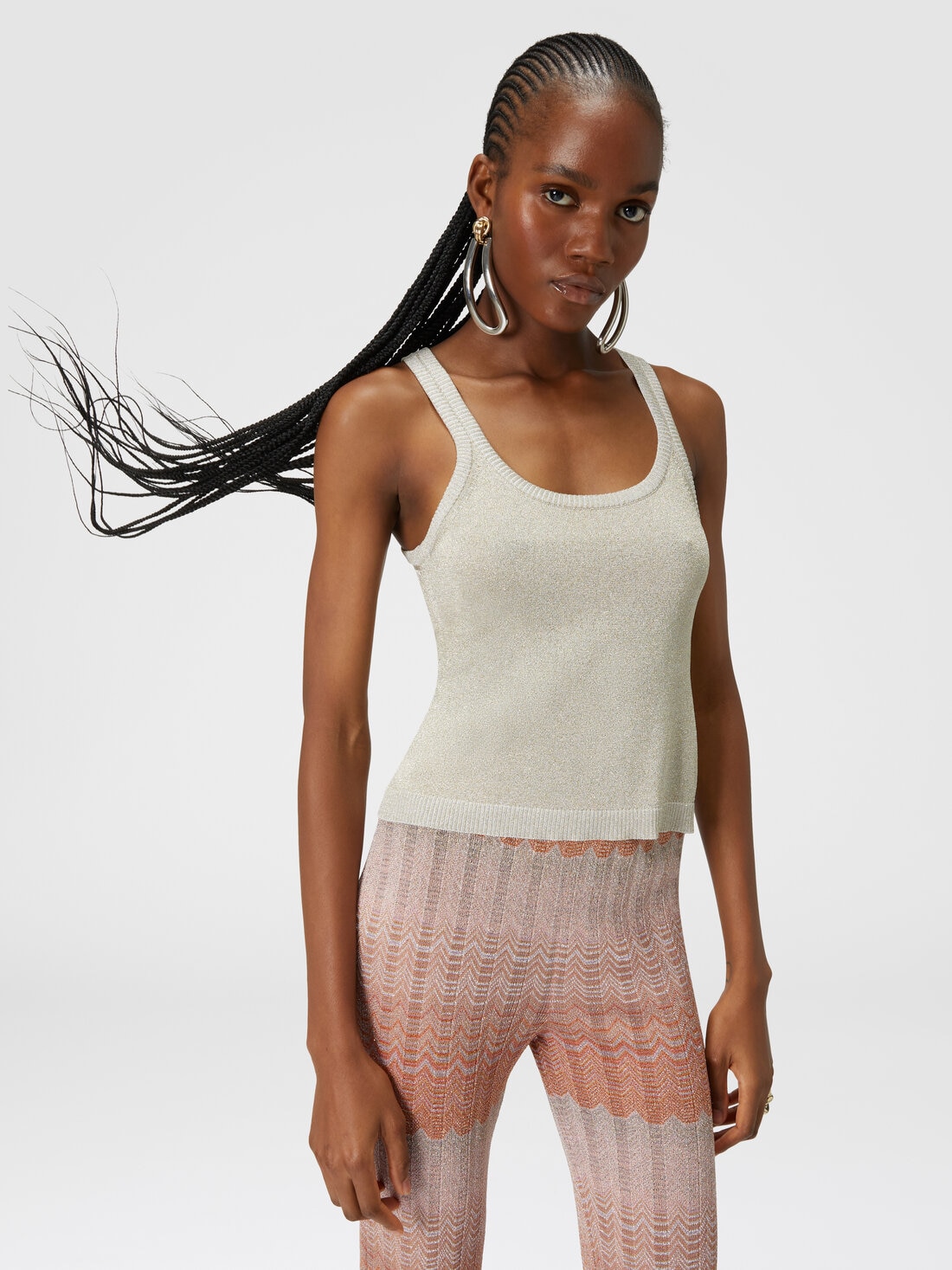 The knitted tank top, a timeless model at the base of the most disparate outfits, acquires, thanks to the Missoni touch, a precious côte: thanks to the viscose yarn lit up by the lamé.