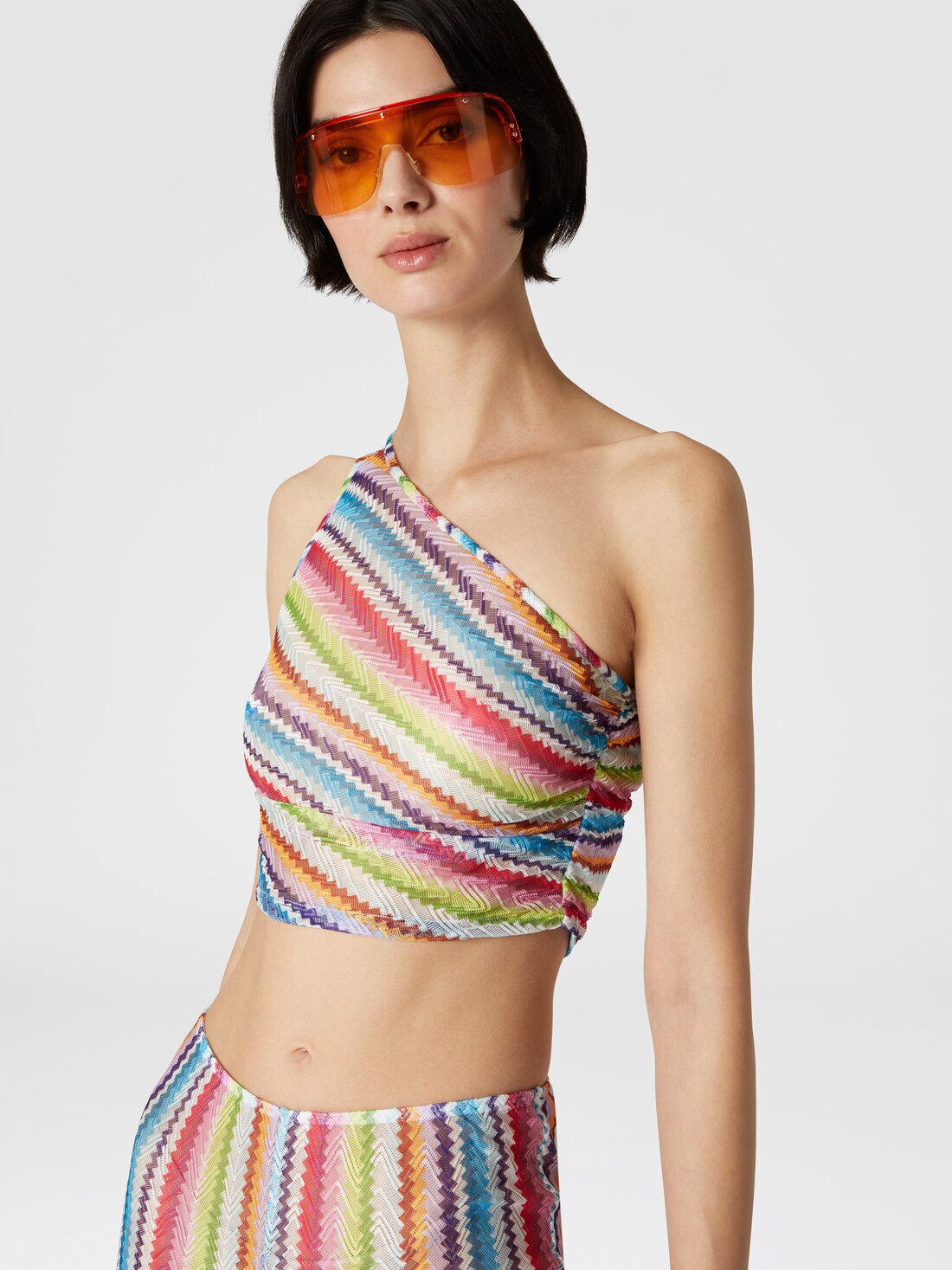 The one-shoulder crop top plays with the see-through effect of the light fabric, enlivened by the raschel workmanship with vertical zigzag print. Ruched with slight side gathers, the garment is the quintessential Missoni beach style.
