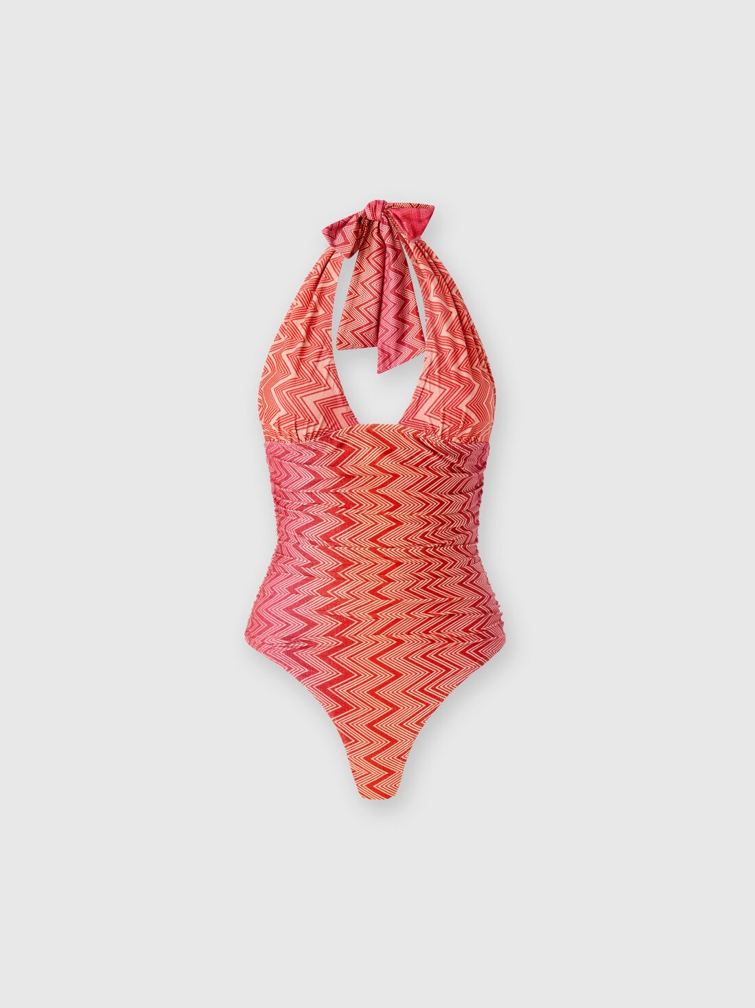 Lamé one-piece swimsuit with a vibrant zigzag pattern, adding a touch of glamour. The back neckline fastened behind the neck guarantees elegance and comfort.