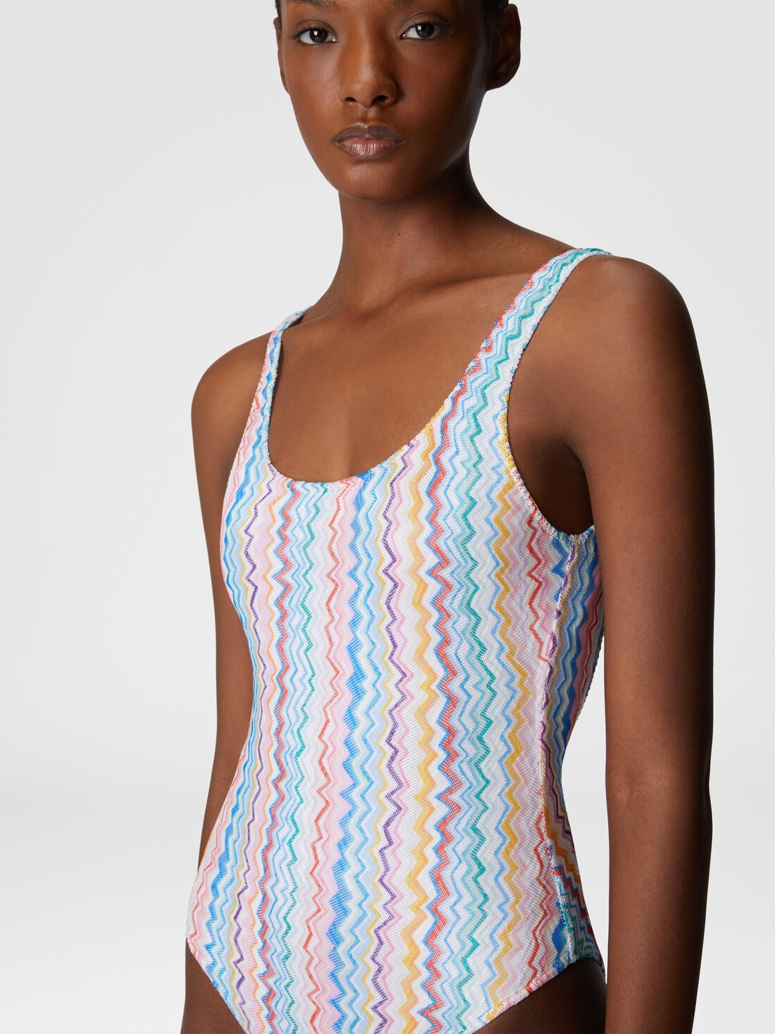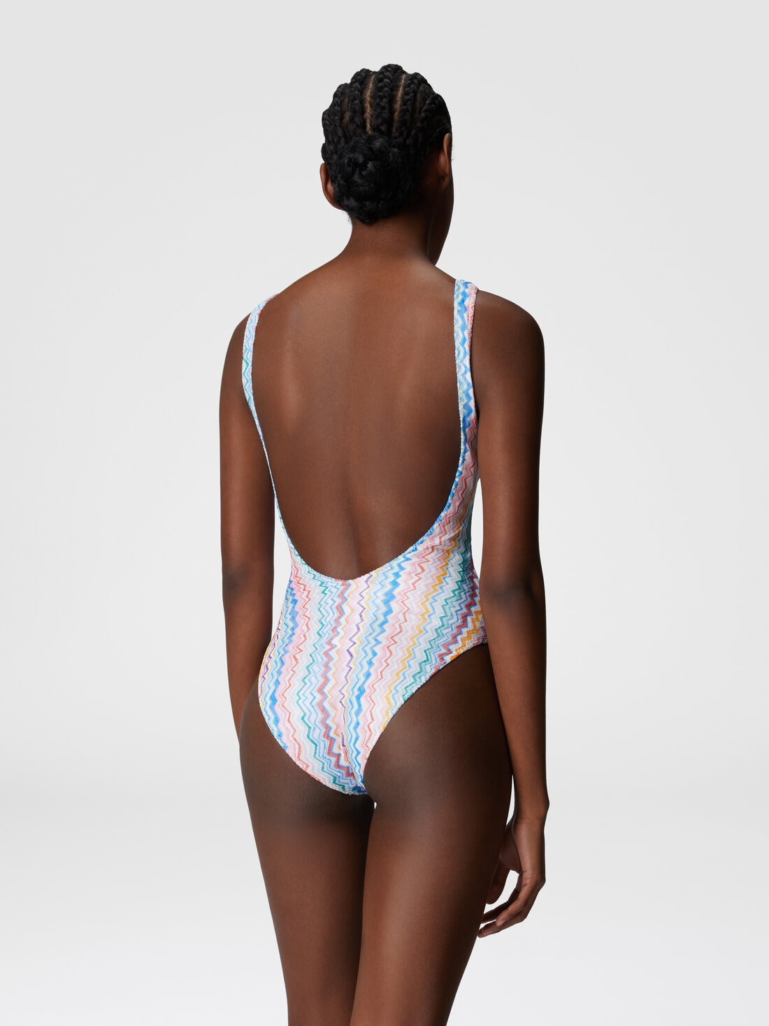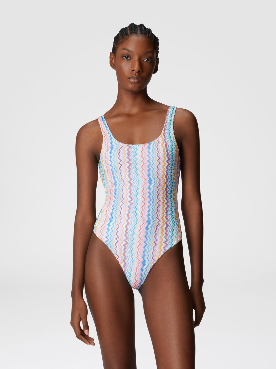 Iconic and captivating, this sporty one-piece swimsuit is made from printed Raschel fabric with Missoni’s unmistakable zigzag pattern. A piece that enhances femininity with a sporty yet glamorous touch.