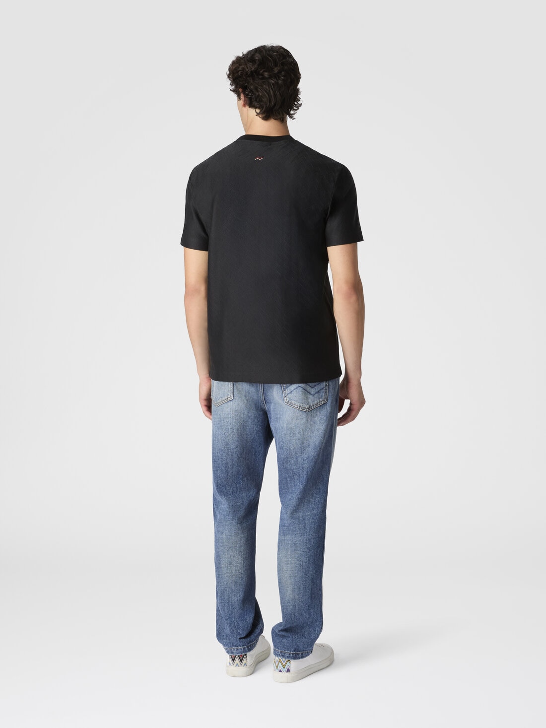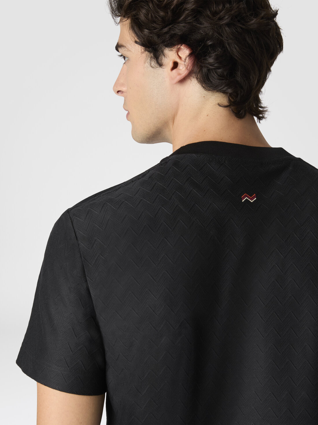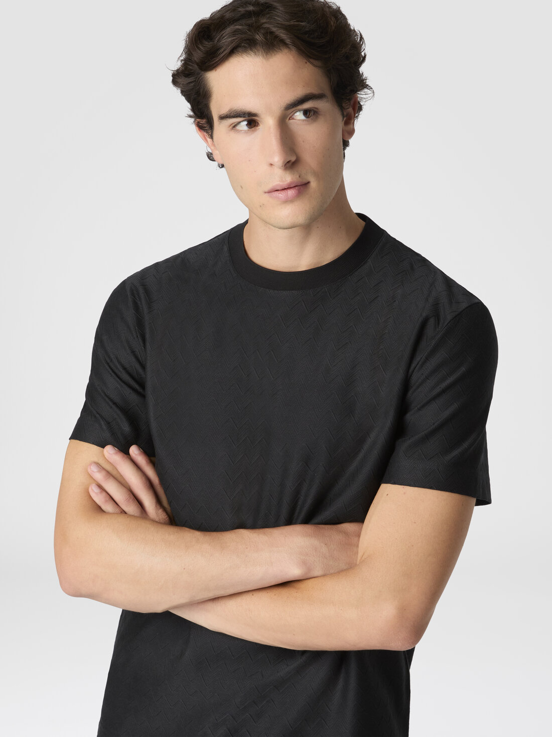 The tone-on-tone zig zag cotton jersey crewneck T-shirt stands out for its subtle but evident texture. The zigzag pattern, characteristic of the maison, gives movement to the garment, while the lightweight fabric wraps naturally, defining a sober yet refined aesthetic.