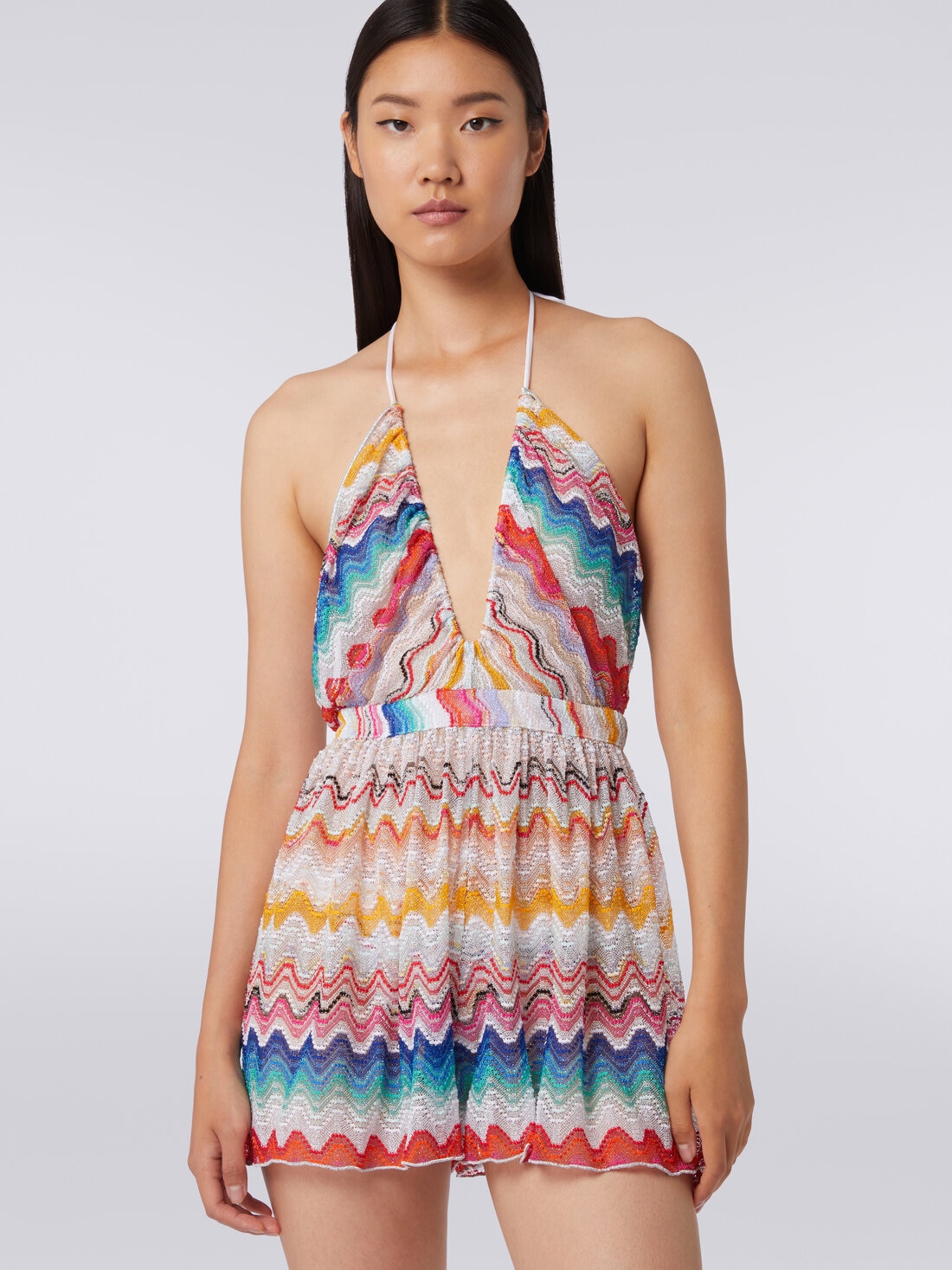 Illuminated by the reflections of lurex, Missoni’s women’s short viscose blend cover up jumpsuit offers an eclectic essay on the brand’s DNA: wave knit meets zigzag pattern in this piece with flared shorts and a plunging V neckline that leaves the back bare.