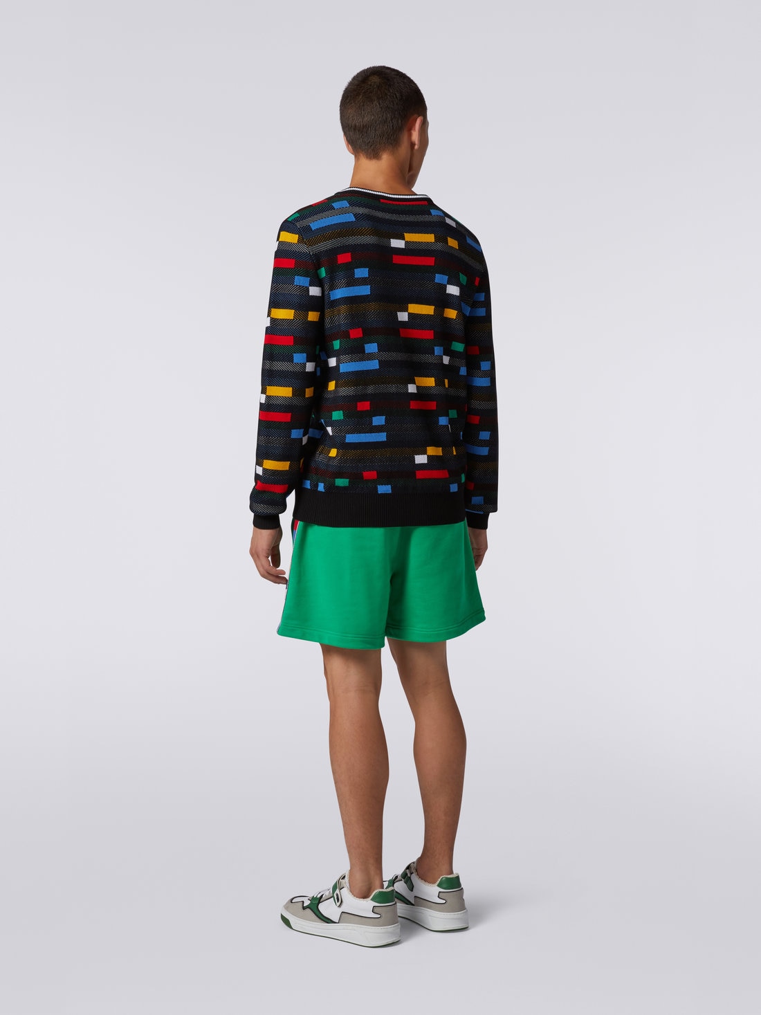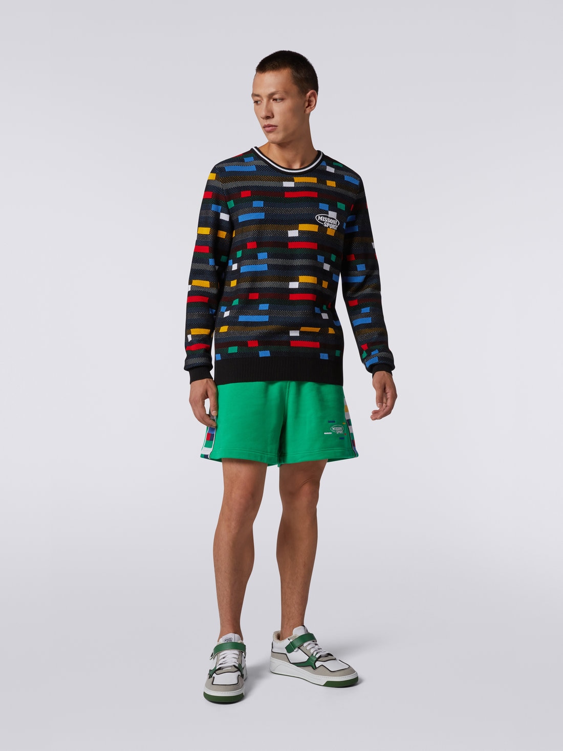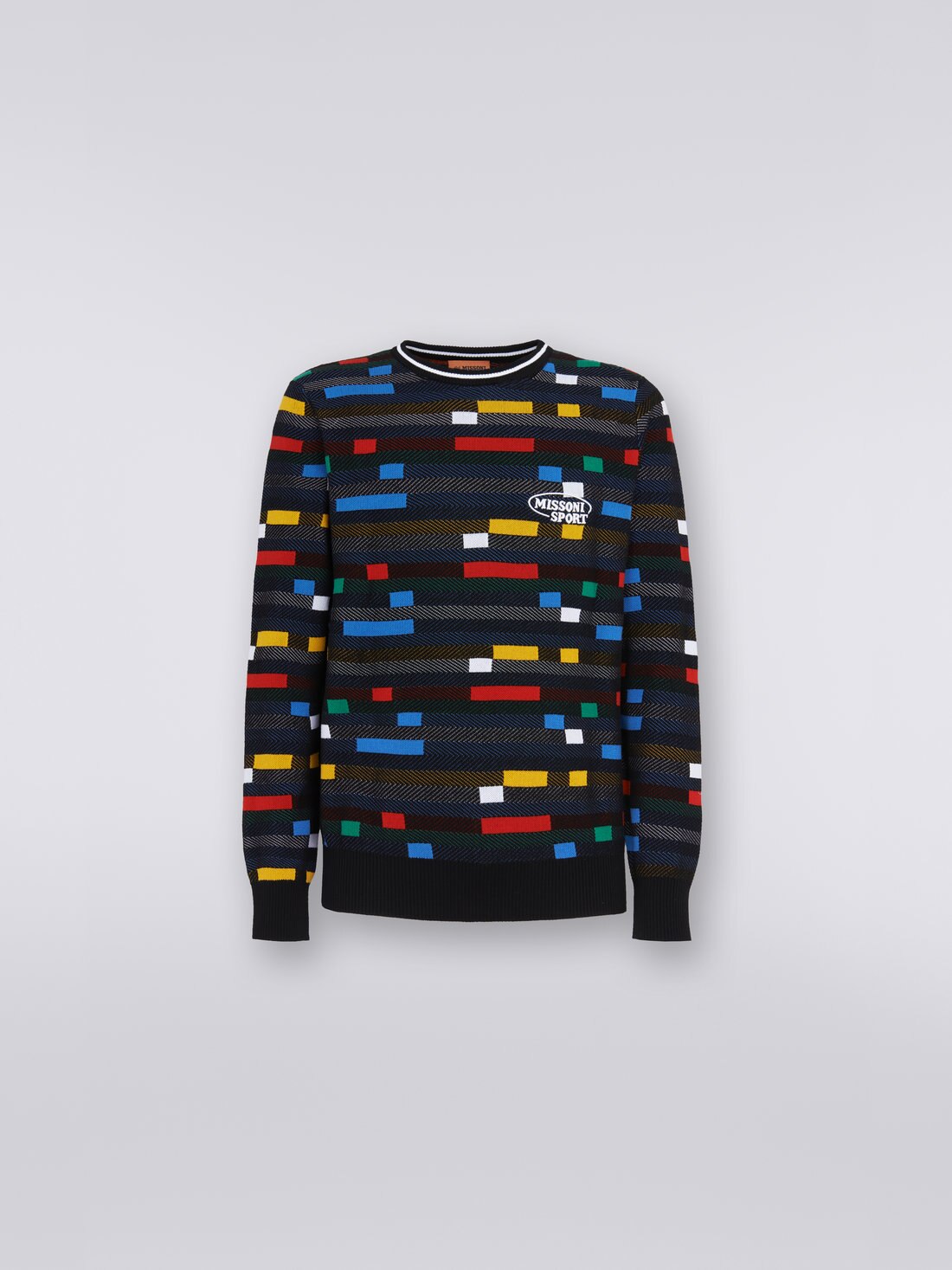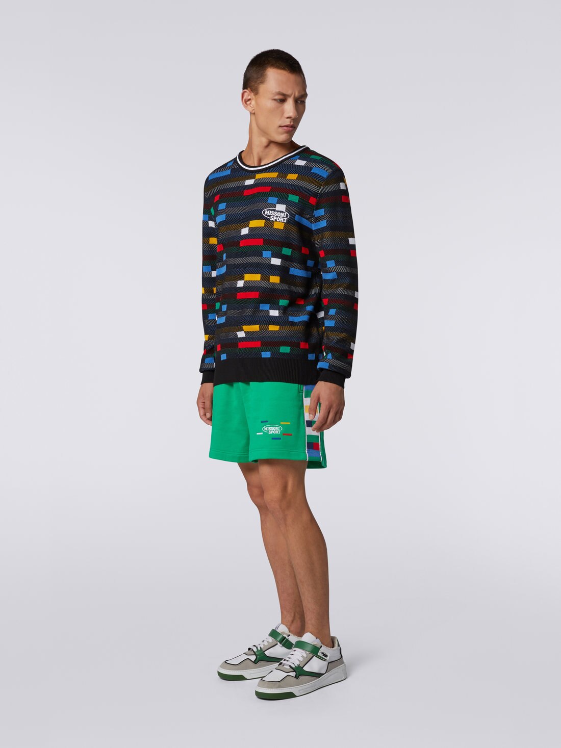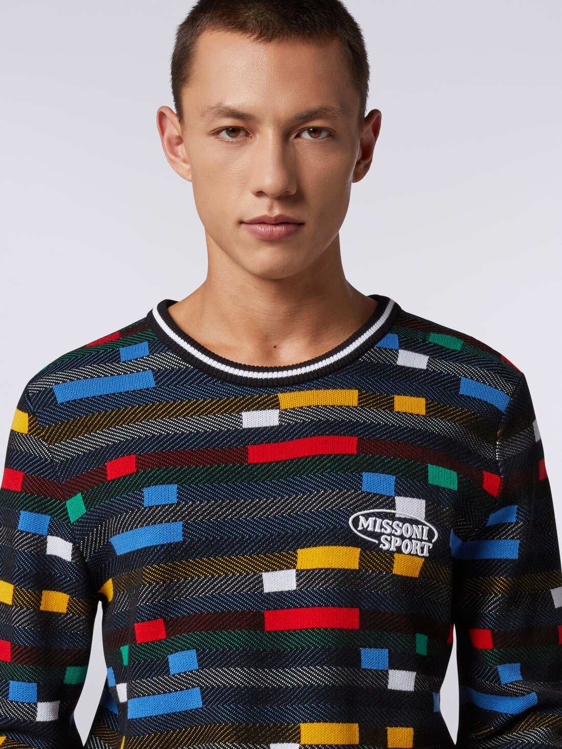 100% cotton and jacquard technique for the men’s crew-neck jumper. The garment, made of a lightweight knit that blends together textures and colours in an avowedly pop mix, is finished with a two-tone collar and ribbed trim. Personalised by the contrasting embroidered logo, this jumper is the perfect embodiment of Missoni’s sporty style.