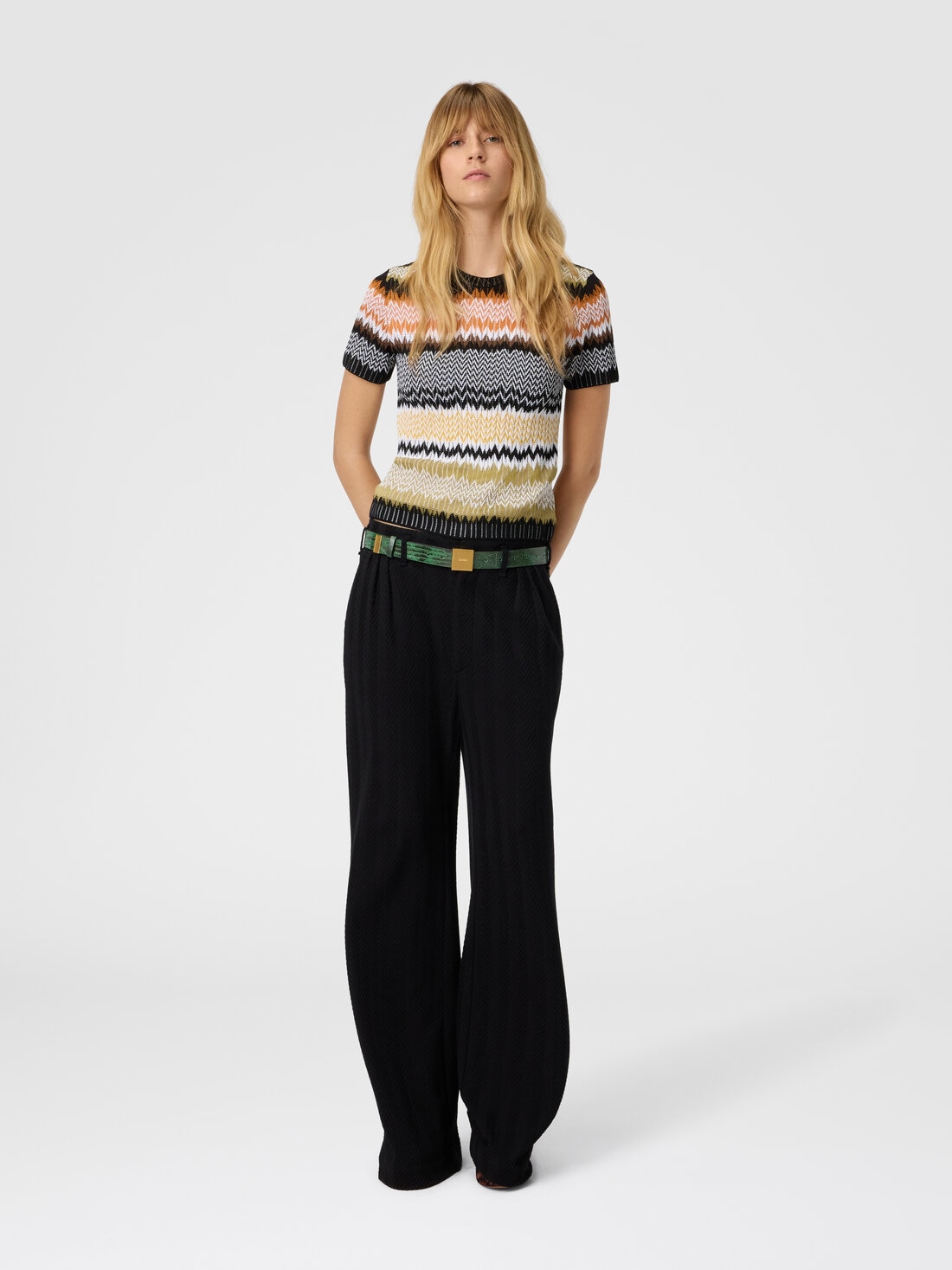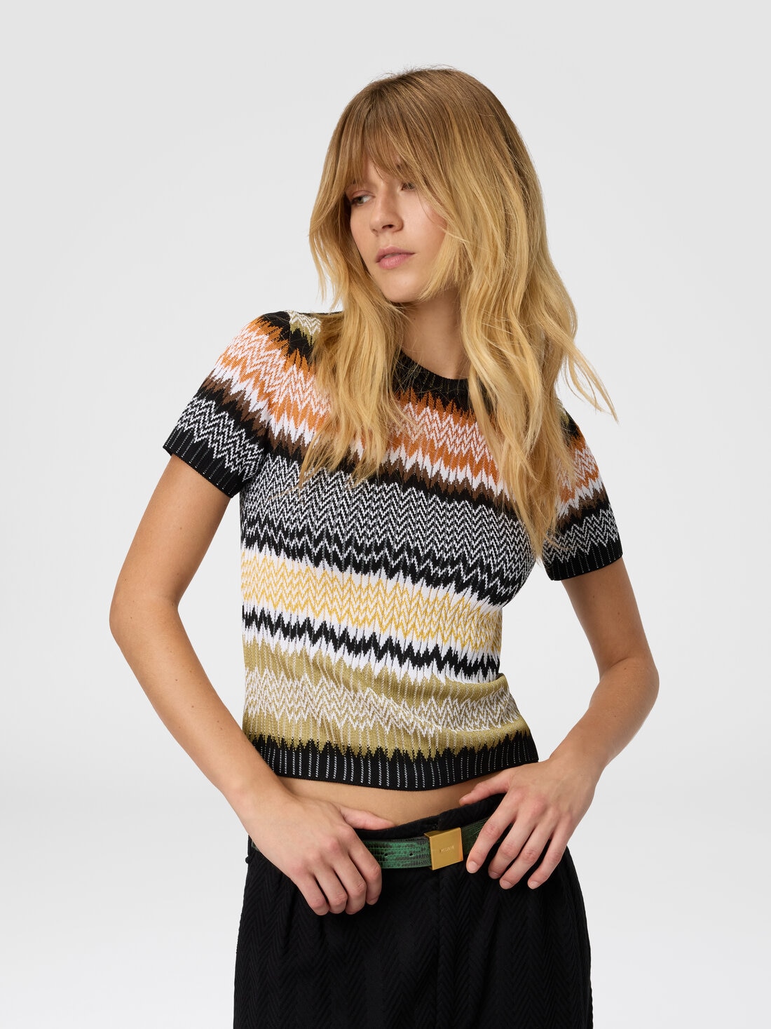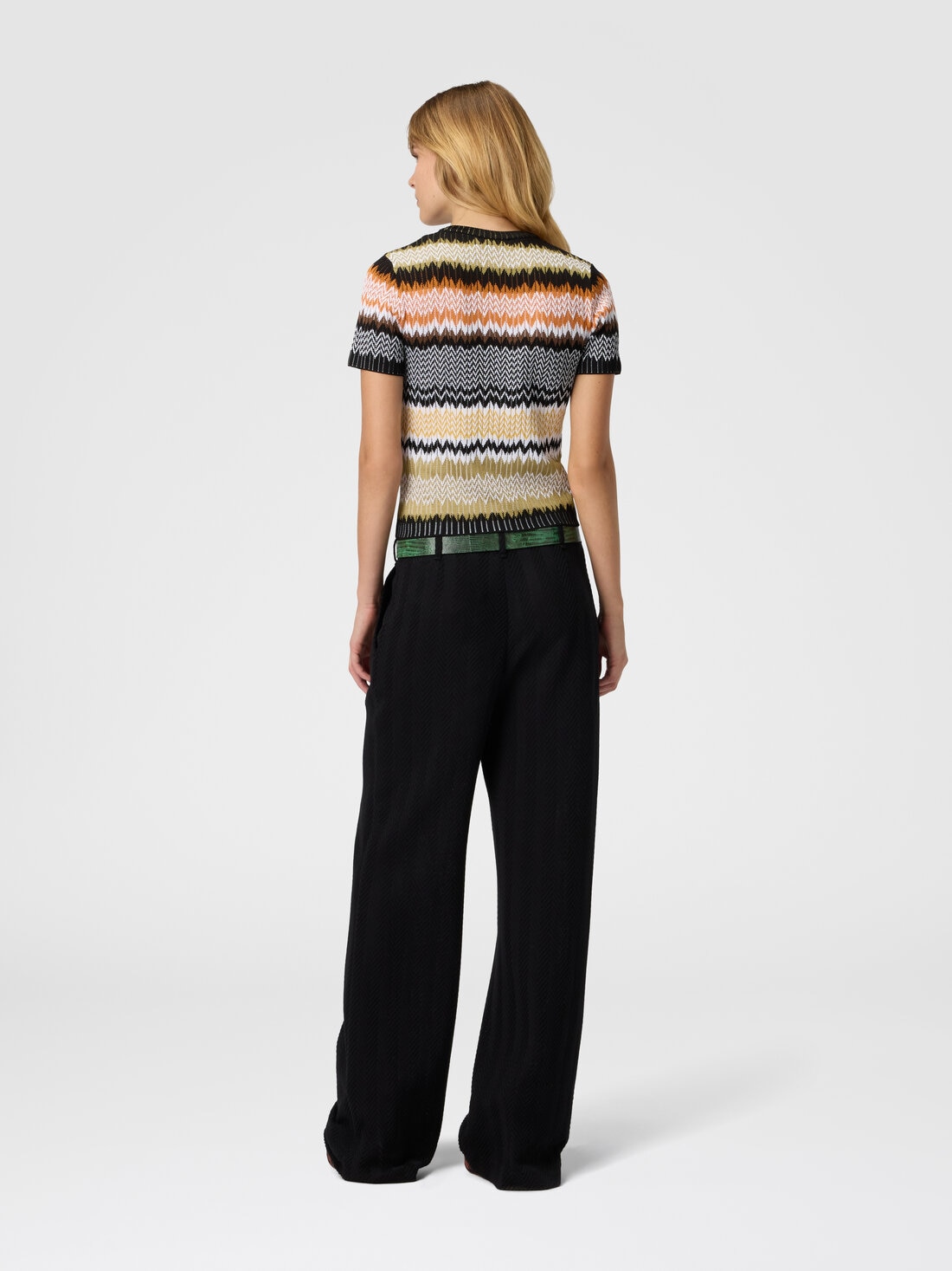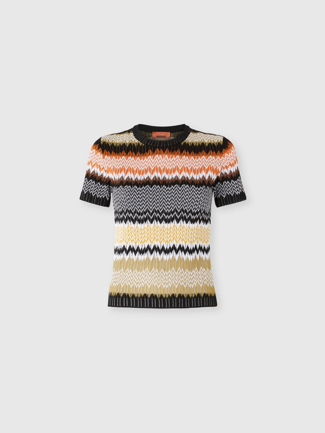 Short-sleeve crew-neck women’s sweater in cotton and viscose blend, embellished with the classic chevron jacquard motif, emblematic of Missoni’s style. The refined workmanship and light texture make it ideal for adding a distinctive and elegant touch to any look.