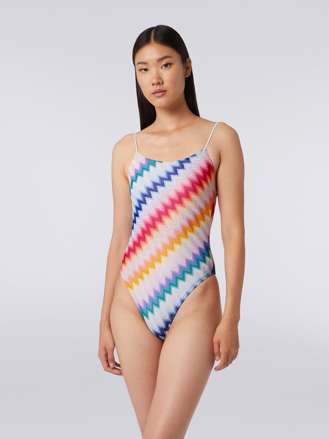 The women’s one-piece swimming costume made of lightweight viscose knit with a chevron pattern combines the practicality of beachwear with a straight neckline and thin straps to tie at the back, and the sophistication of the Missoni style. Animated by the zigzag pattern lit by the glitter of lurex, the piece is the perfect expression of the brand’s idea of beachwear.