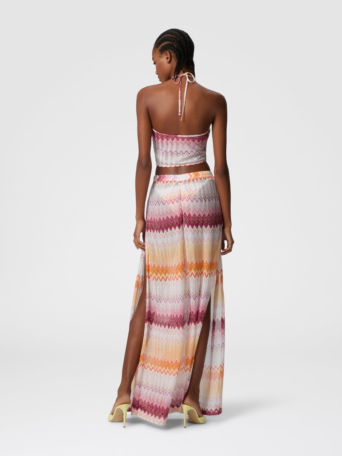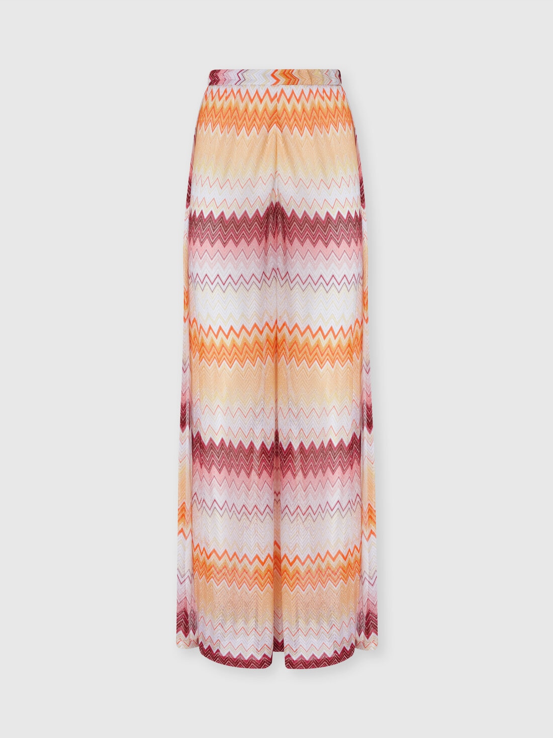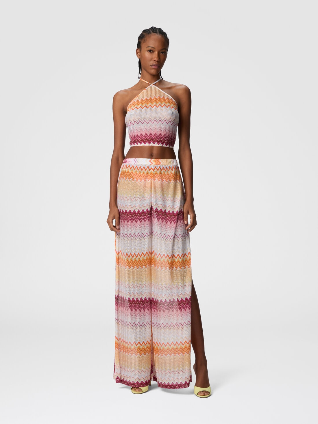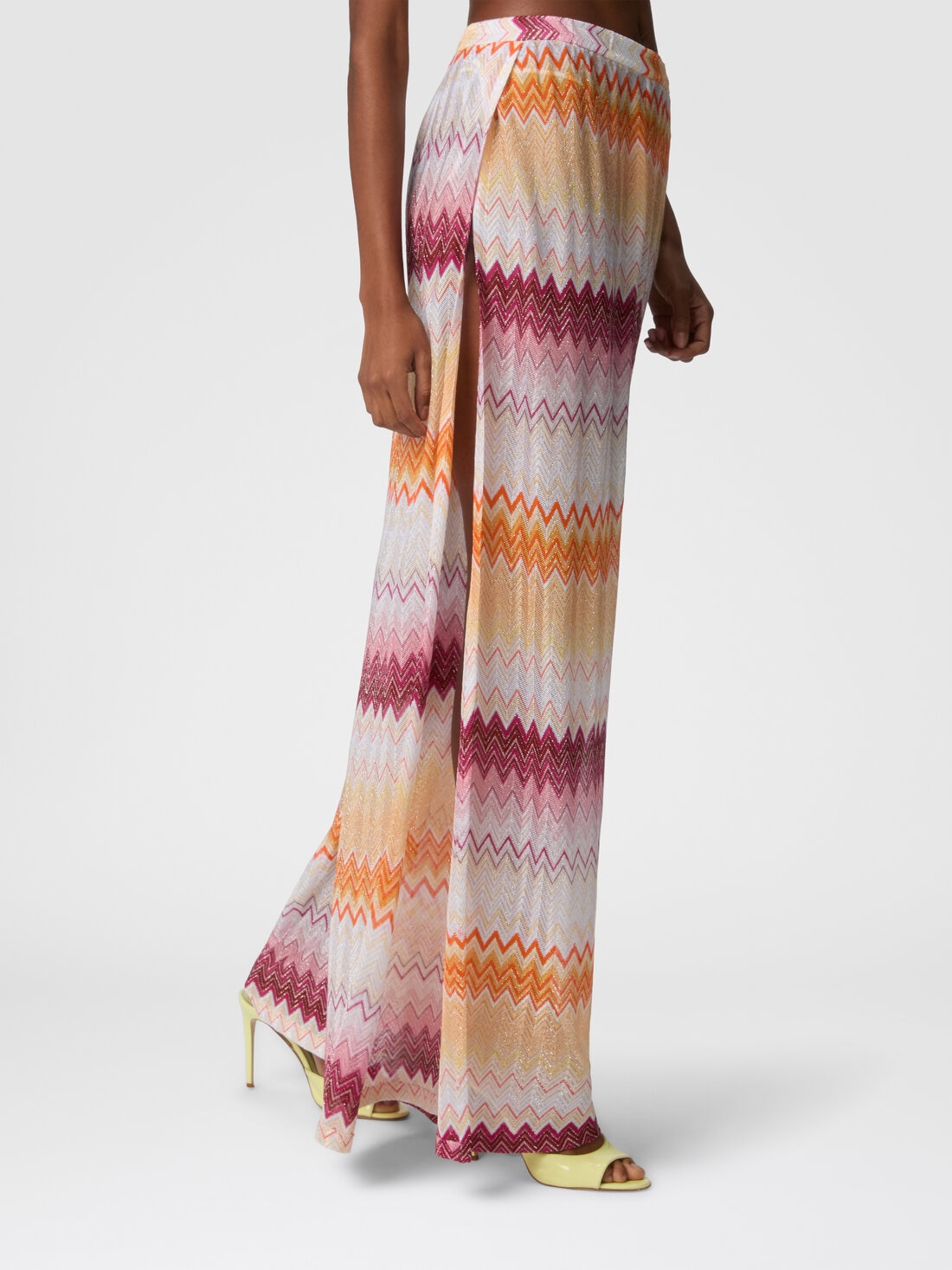 The classic viscose-blend palazzo trousers offer a dynamic elegance typical of Missoni. The loose silhouette is enhanced by a deep side slit, which gives movement and sensuality, while the reflections of the lamé illuminate the iconic multicolor zig zag shaded with a sophisticated brilliance. A distinctive garment that combines comfort and sophistication.