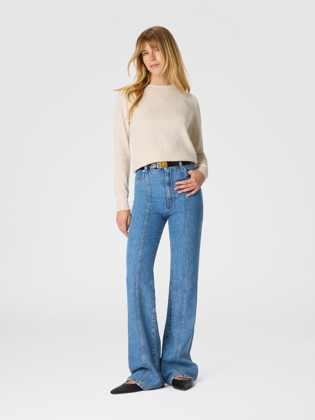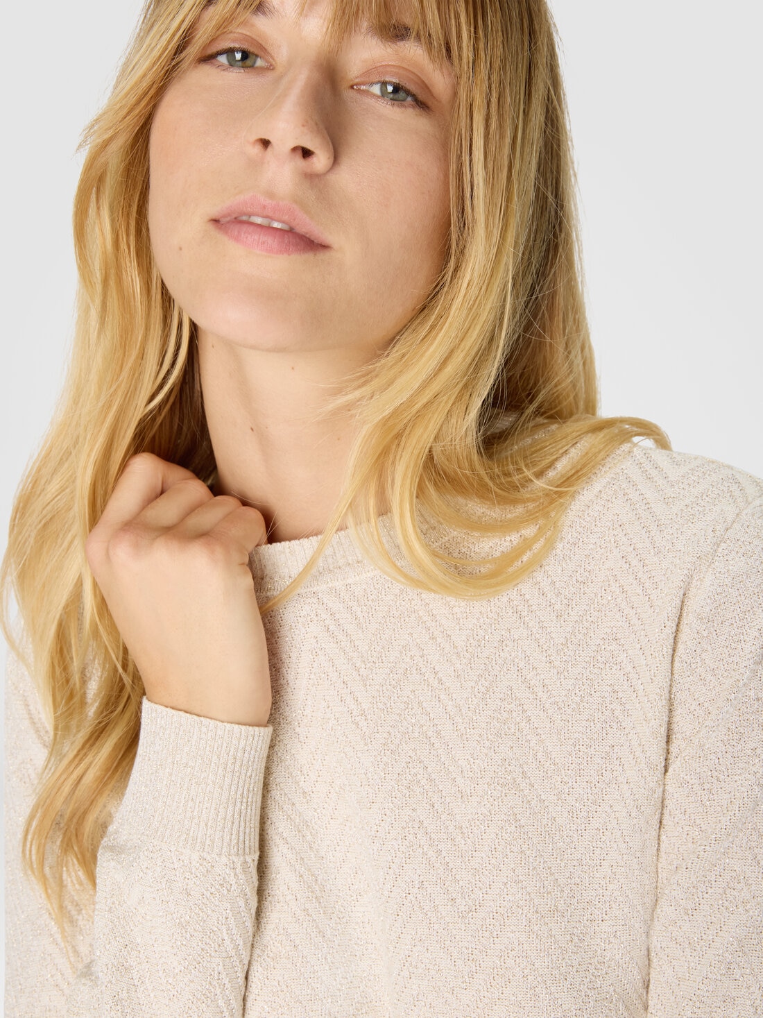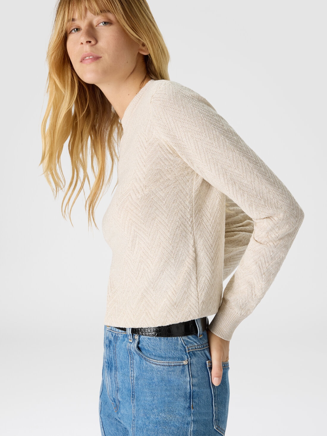 Crew neck sweater with chevron pattern and lamé filaments