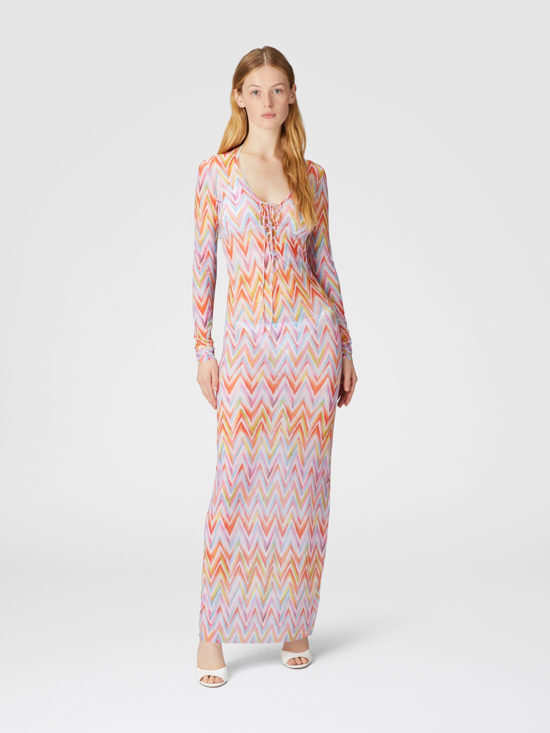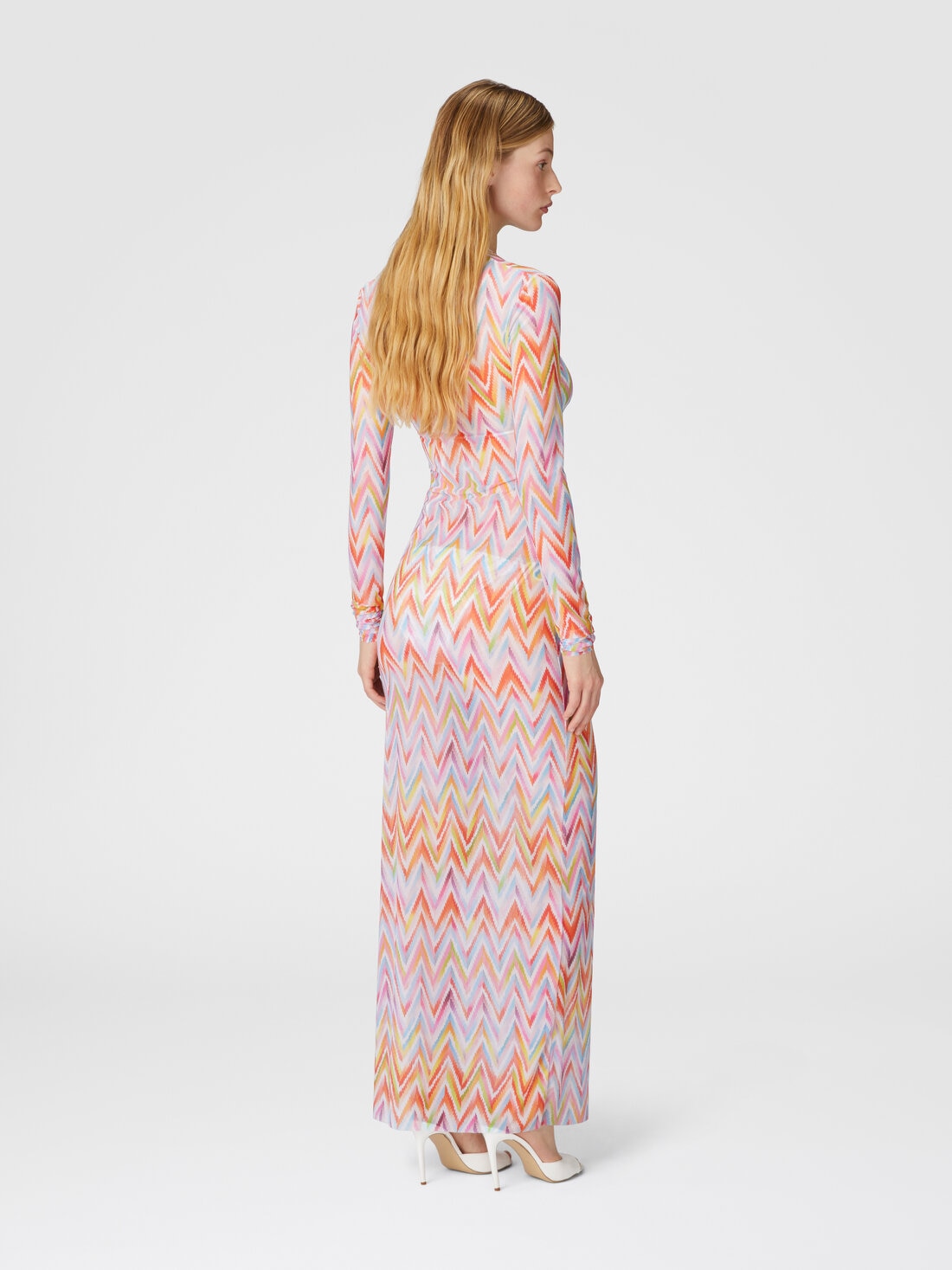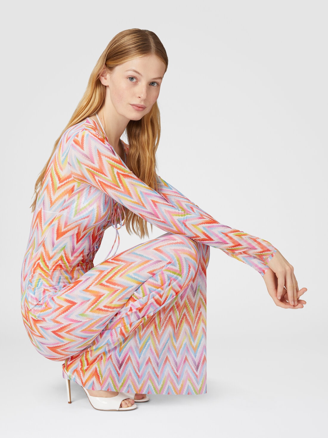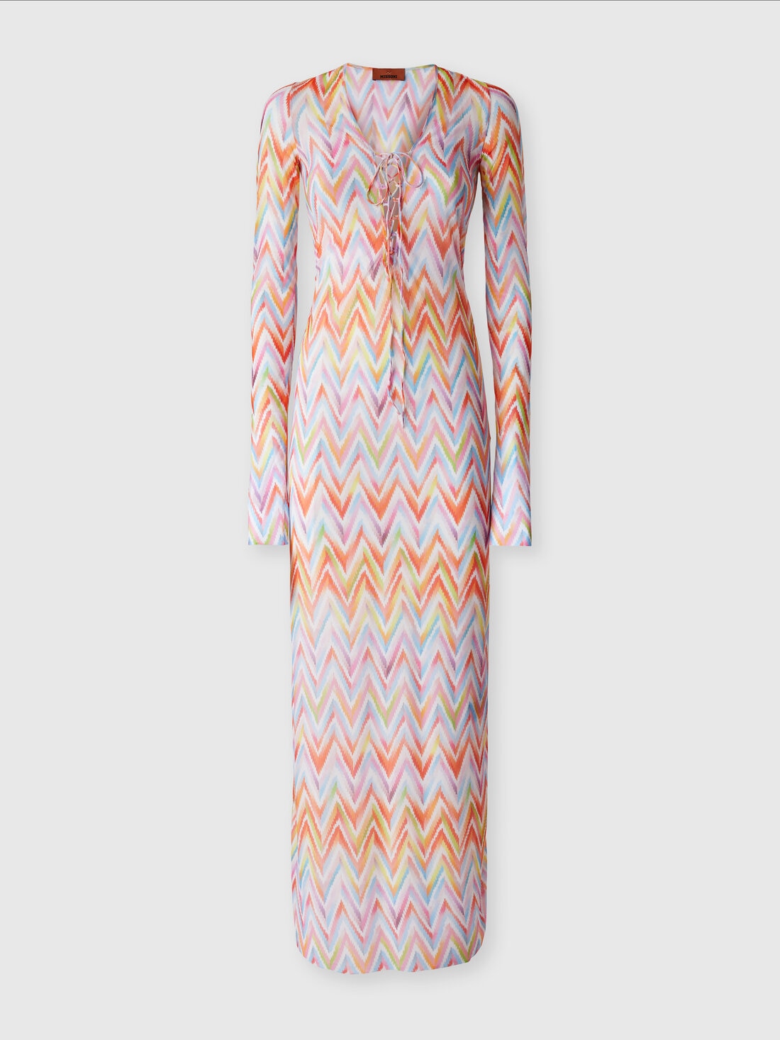 Made from printed tulle with the iconic zigzag pattern, this form-fitting long cover-up combines style and comfort. The long sleeves and adjustable neckline tie make it versatile, perfect for those who love attention-grabbing details.