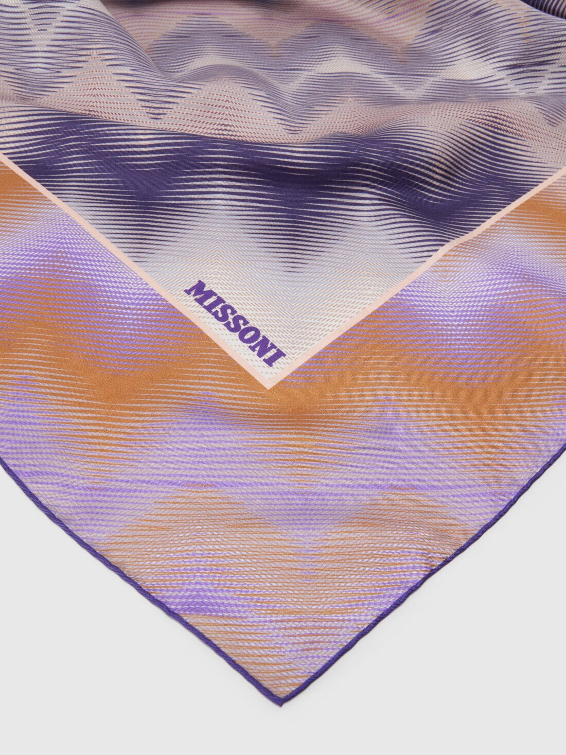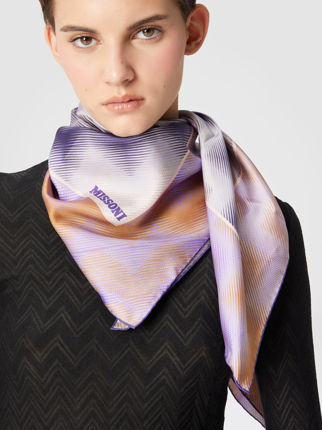 A zigzag print with a slub effect characterizes this square silk scarf. Personalized with the word logo, the accessory features contrasting piping.