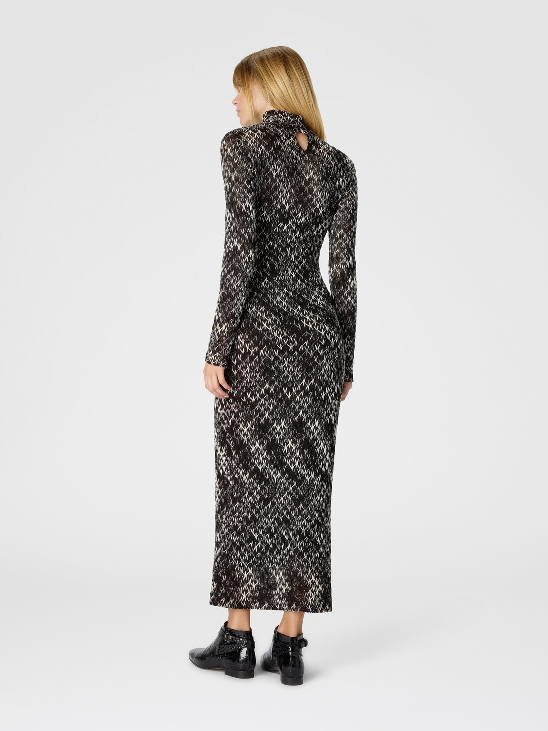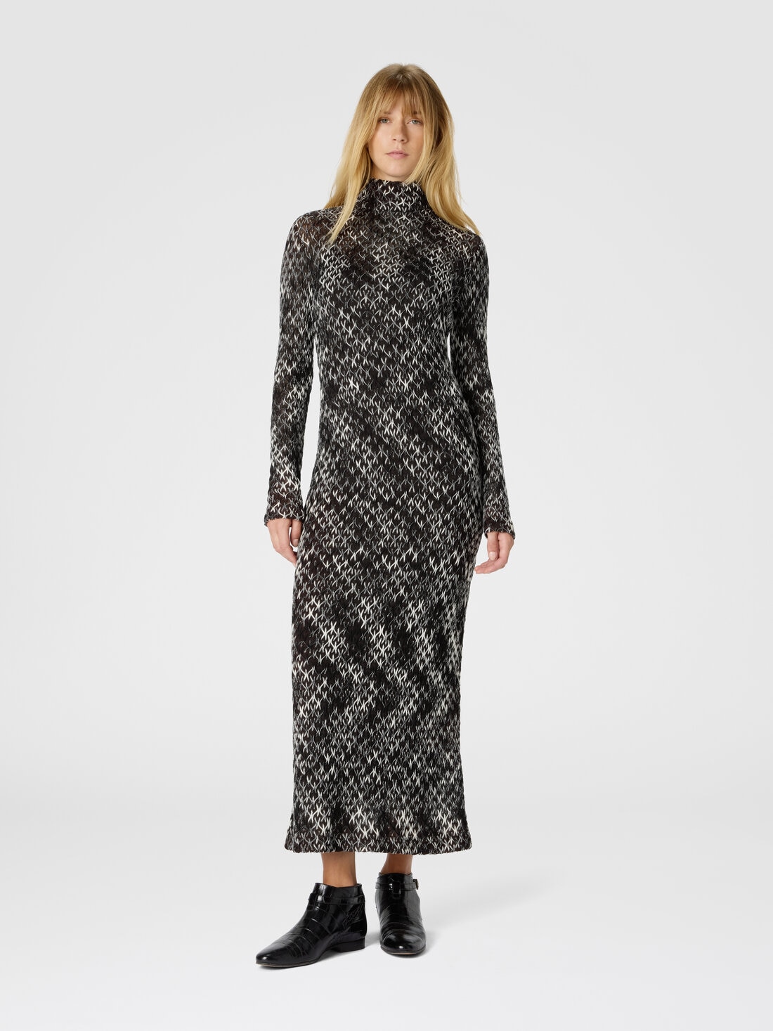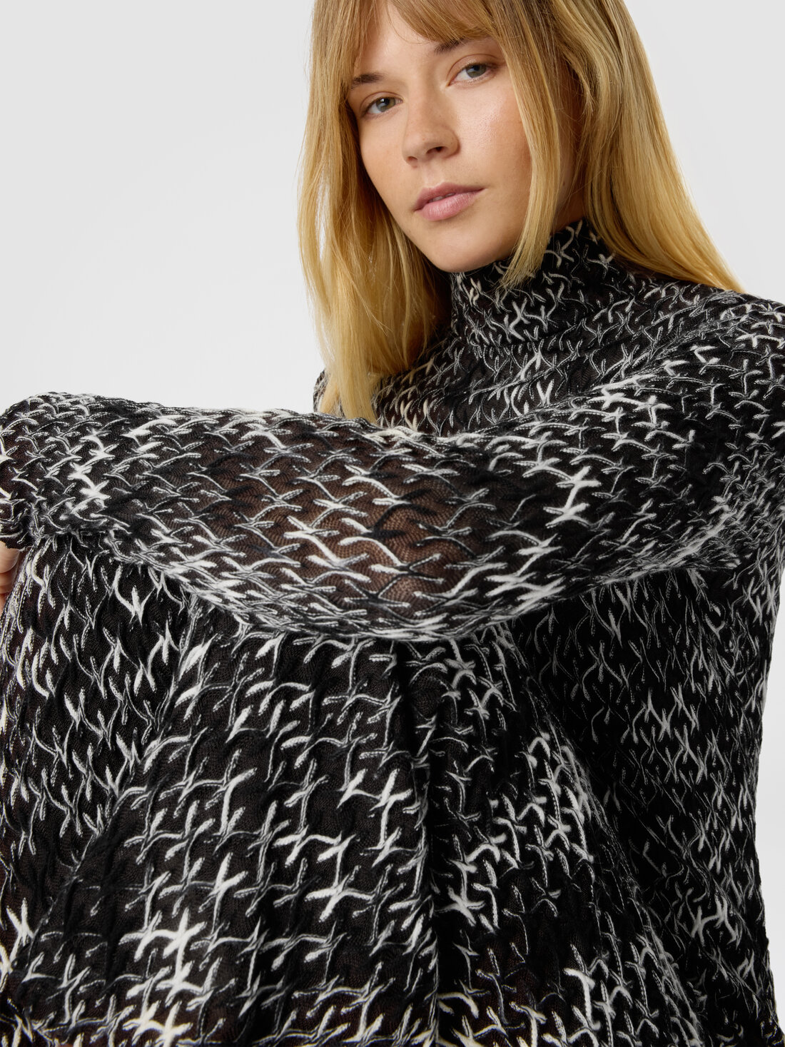 A synthesis of sophisticated elegance and textile savoir-faire, this long women’s dress with high neck and long sleeves is crafted from a refined raschel knit in flamed lace. The wool and viscose blend gives the fabric a warm yet lightweight texture, enhancing both the richness of the pattern and the flow of the silhouette.