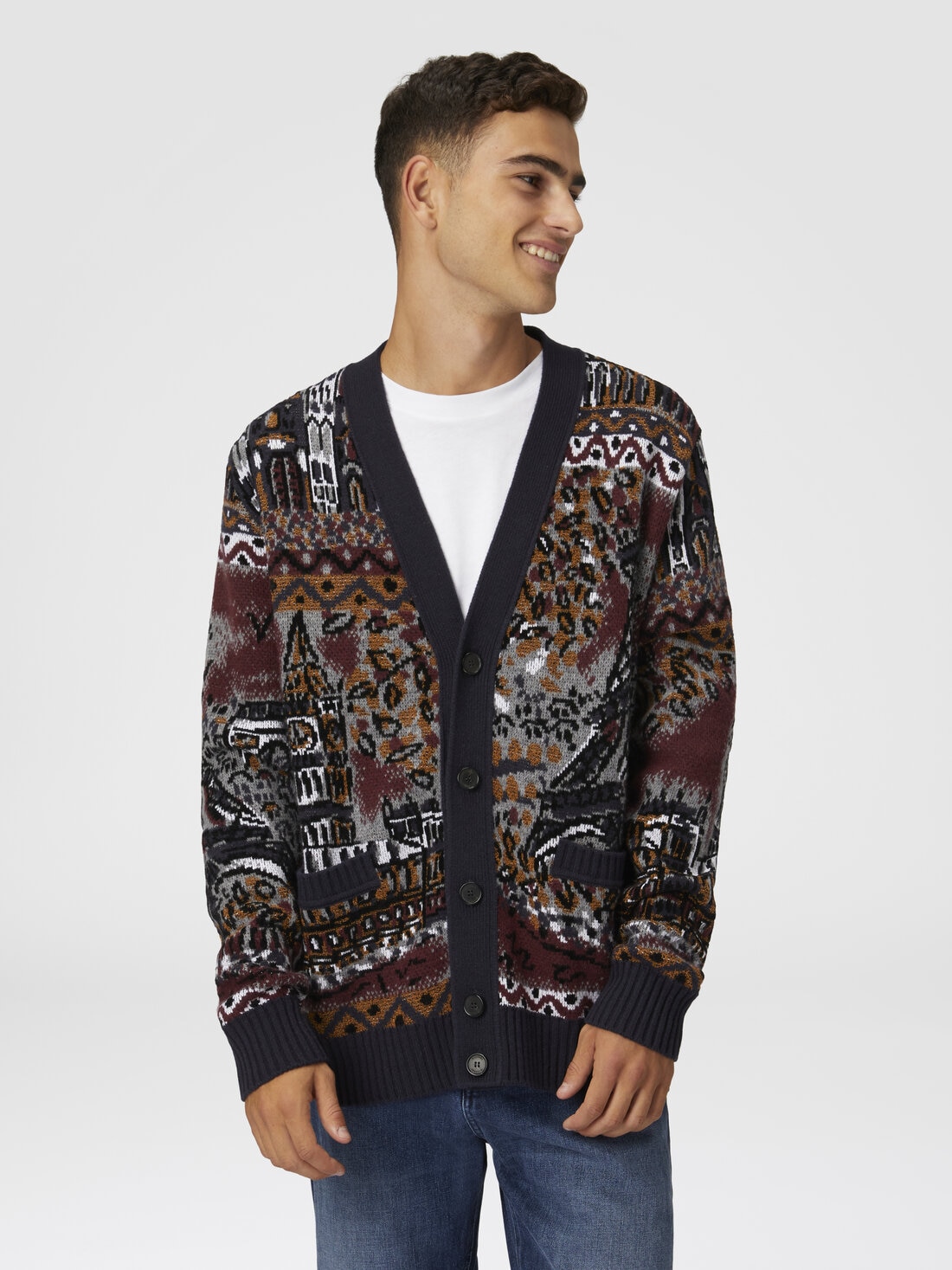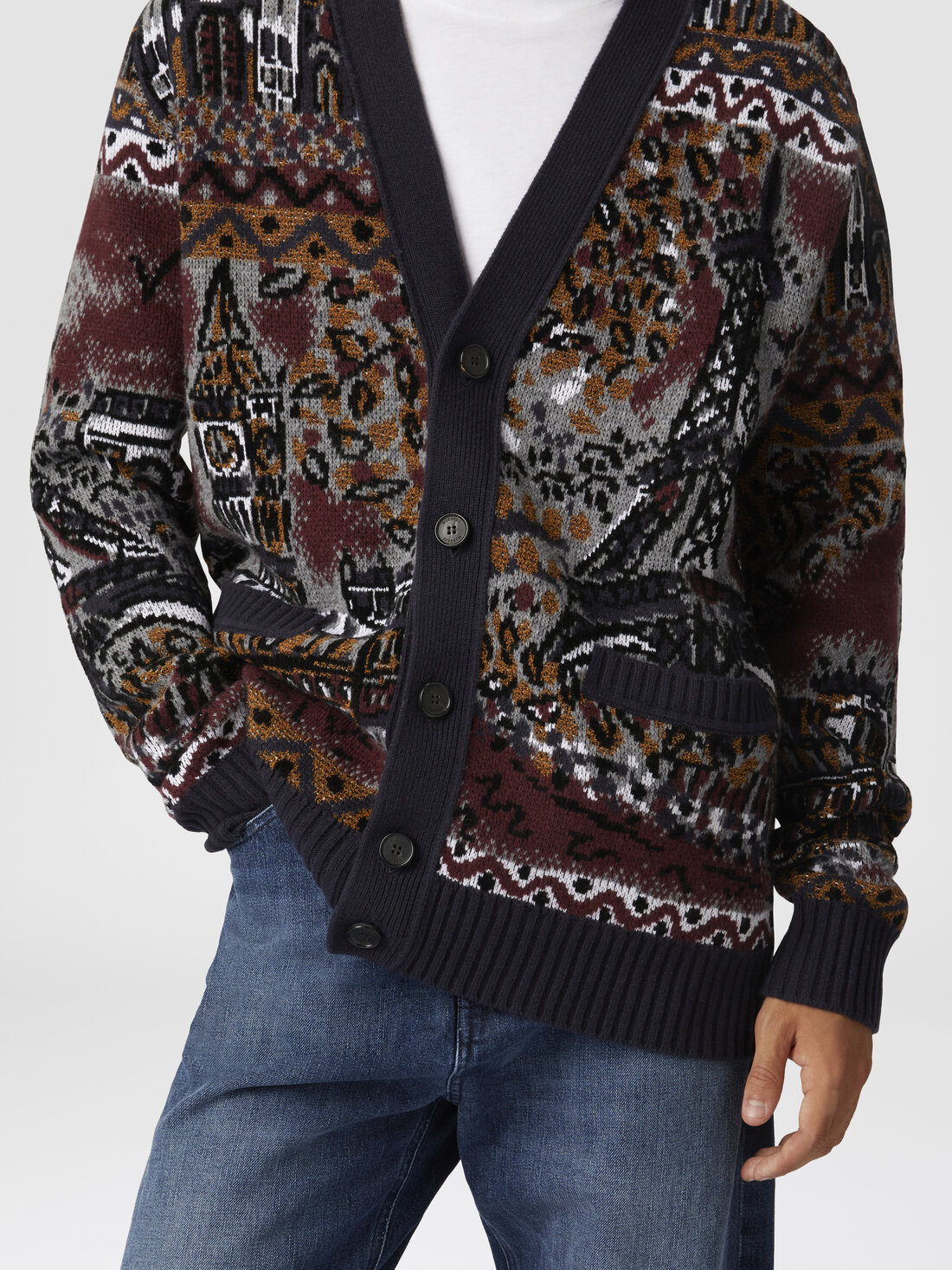 A new pattern of the season, the jacquard postcard motif animates the knitted surface of the wool and viscose blend of the cardigan with contrasting piping. A garment that emphasizes the skilful treatment of Missoni's knitwear.