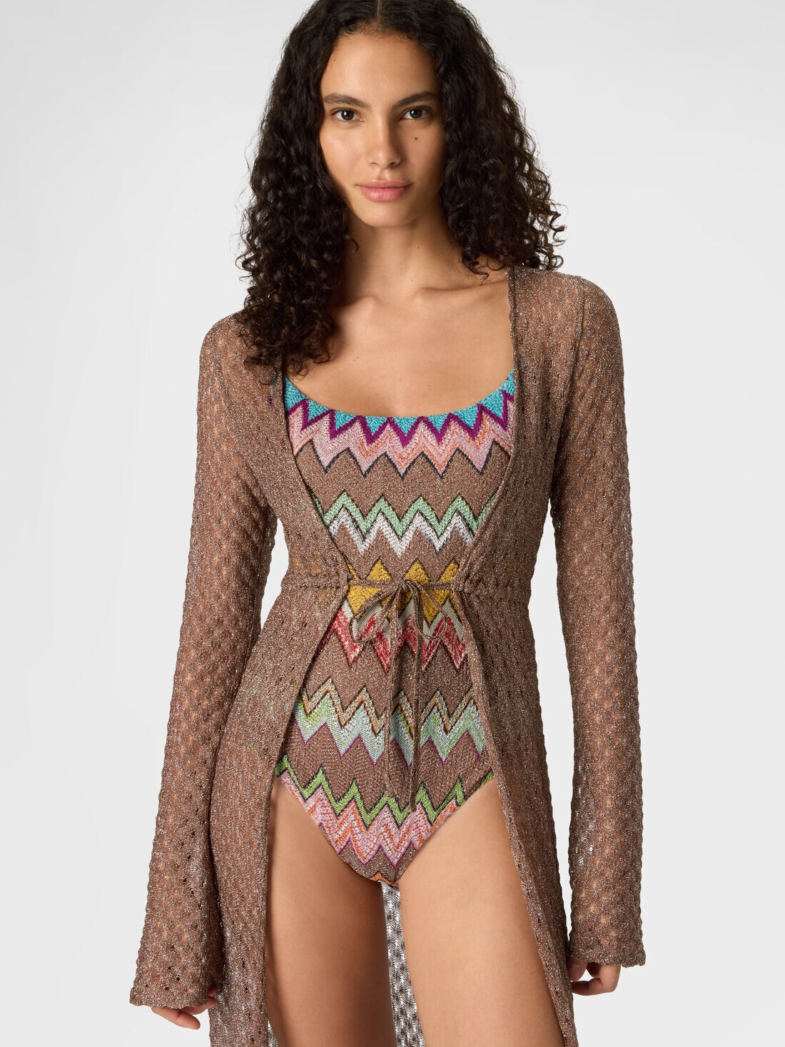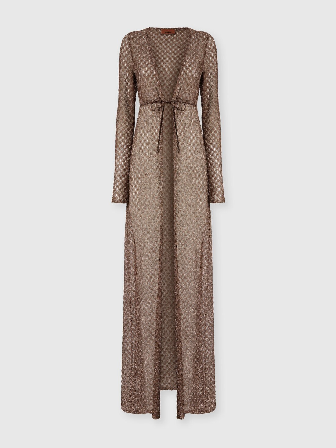 To complete summer looks with sophistication, this long lamé viscose cover-up cardigan with raschel lace in a spiderweb motif embodies the luminous elegance and artisanal mastery typical of the maison.