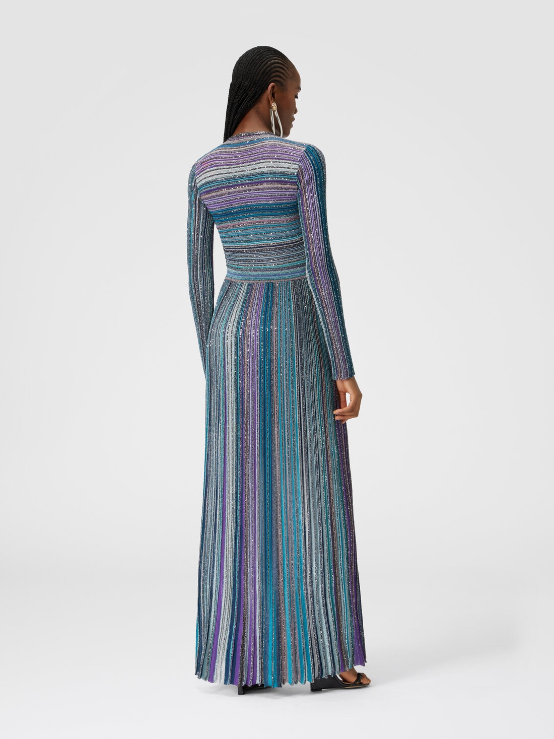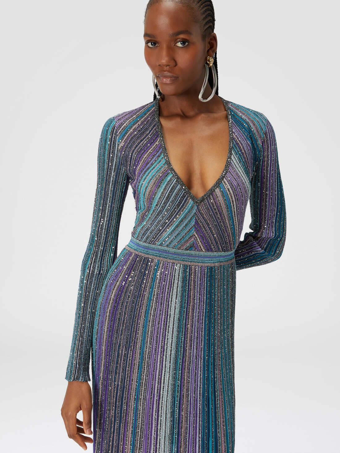 The particular partialized workmanship, which infuses the sweater with a pleated effect, embellishes the long dress with a deep V-neckline. Made of a lamé viscose blend, the garment is illuminated by a shower of applied sequins.