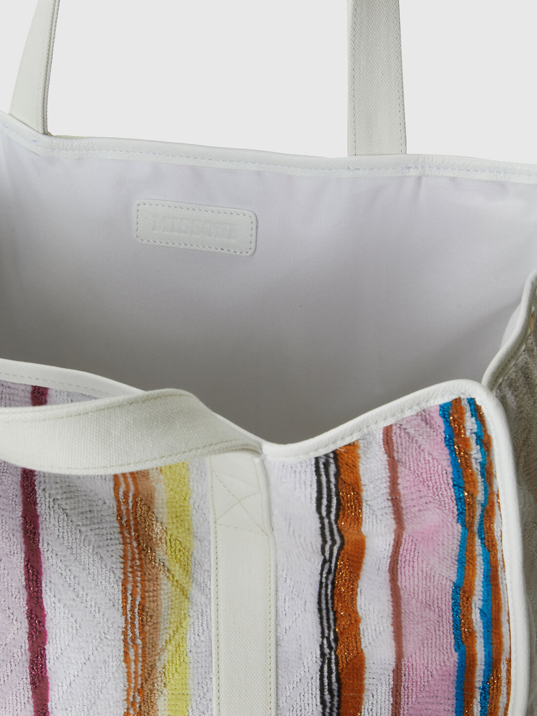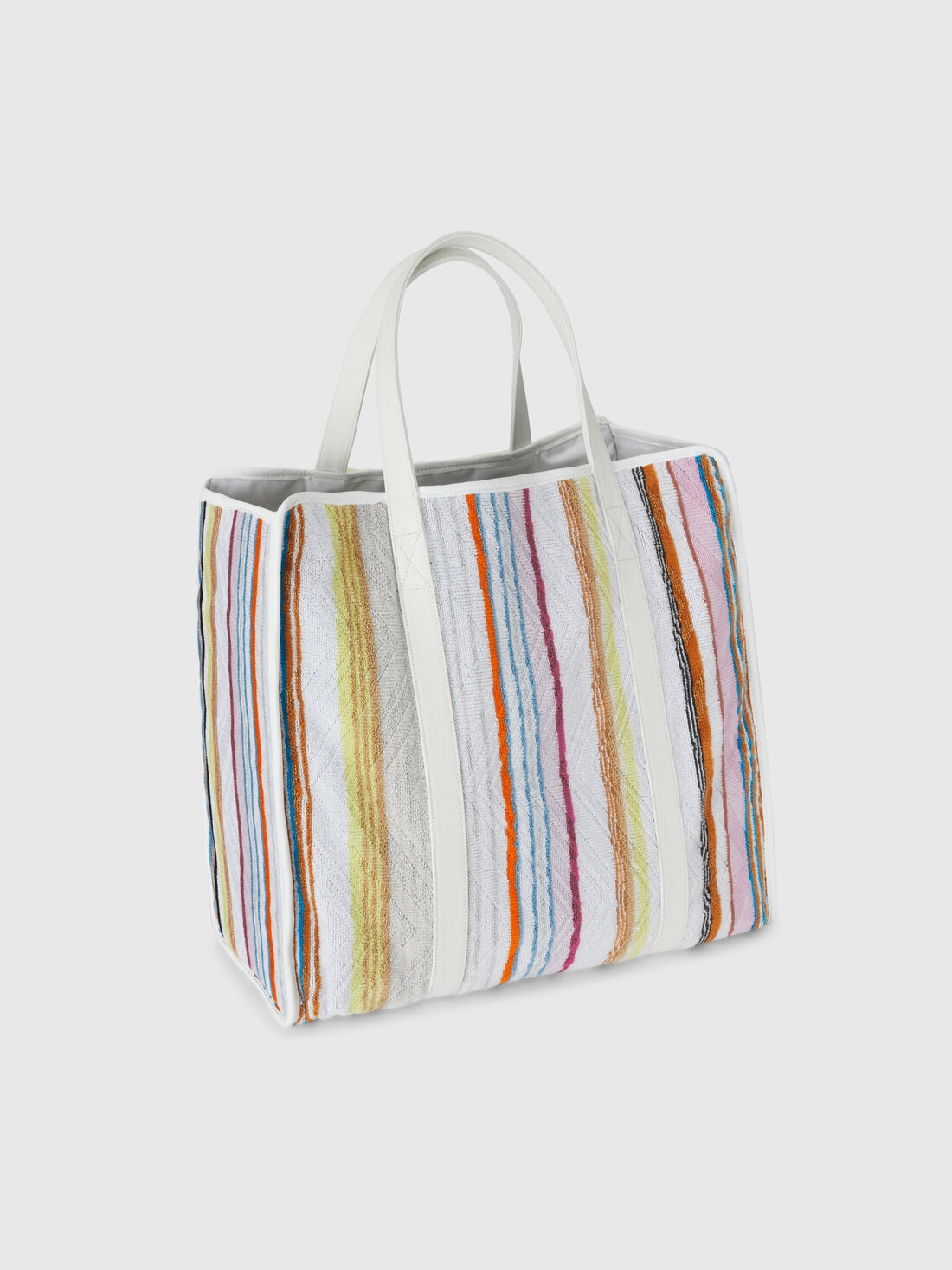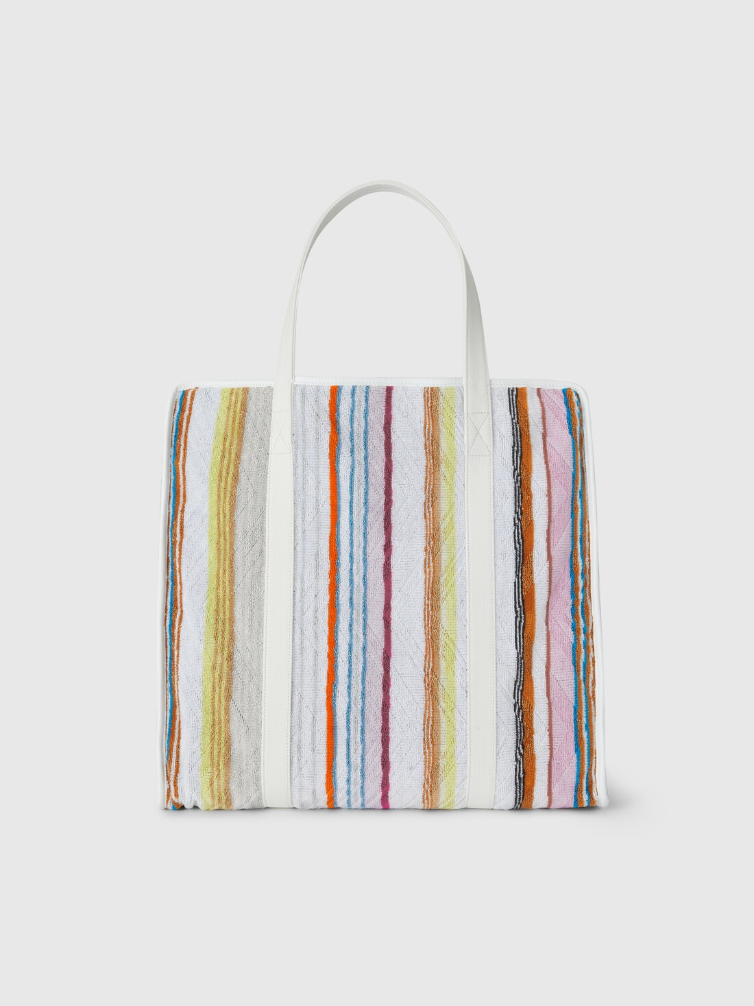 Perfect for enriching living spaces, here is the Moonshadow home bag measuring 40x40 cm. Made of cotton terry and enriched with shiny lurex inserts, the bag stands out for its refined striped pattern in different thicknesses. Every detail, from the high-quality fabric to the sophisticated touch of lurex, reflects Missoni's elegance and textile craftsmanship, ensuring a practical yet elegant accessory.