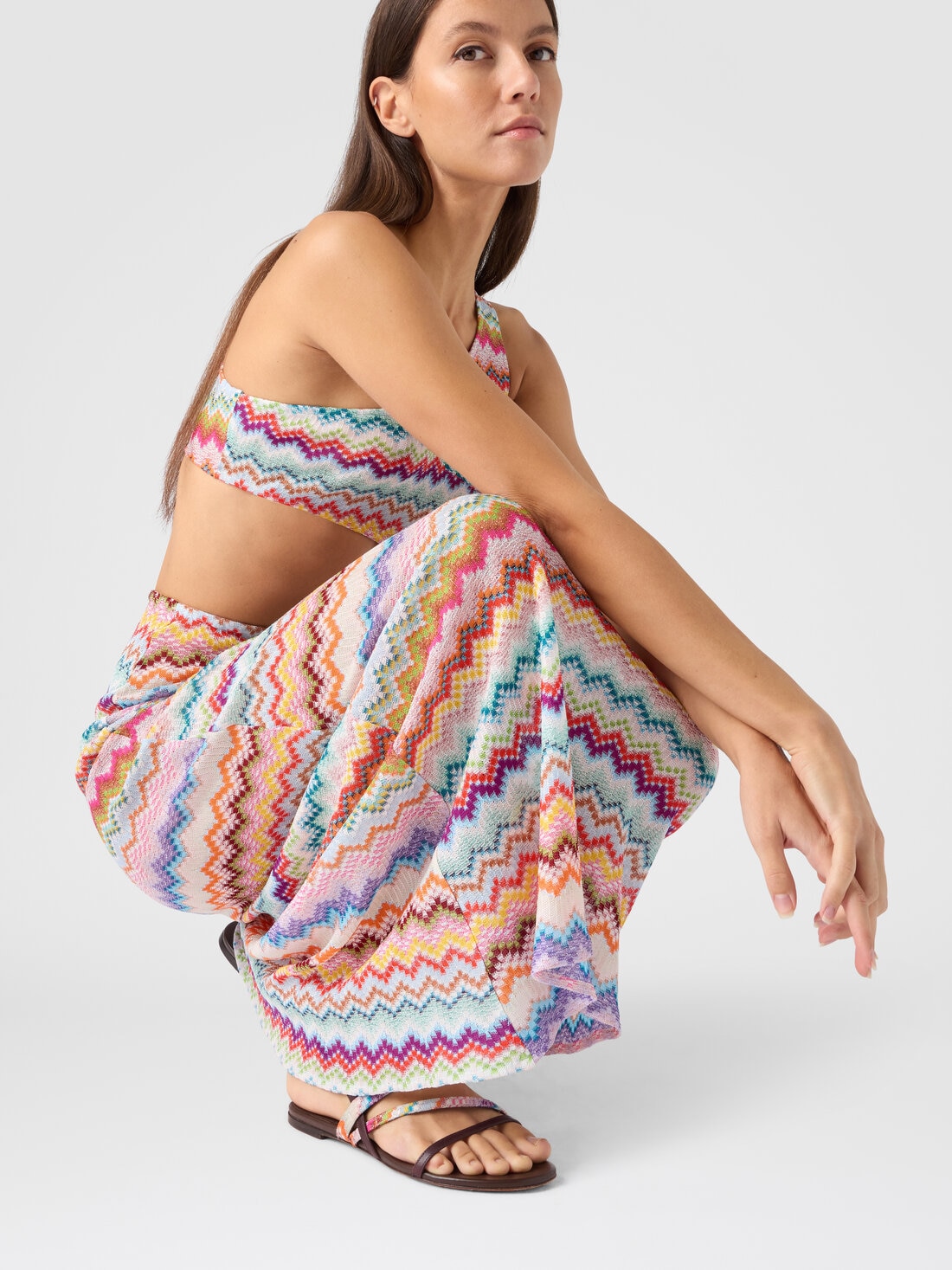 The micro zigzag pixel-effect motif illuminates the viscose lamé of this women’s long one-shoulder beach cover-up, enriched with a cut-out detail that subtly reveals the skin, balancing sensuality and sophistication.