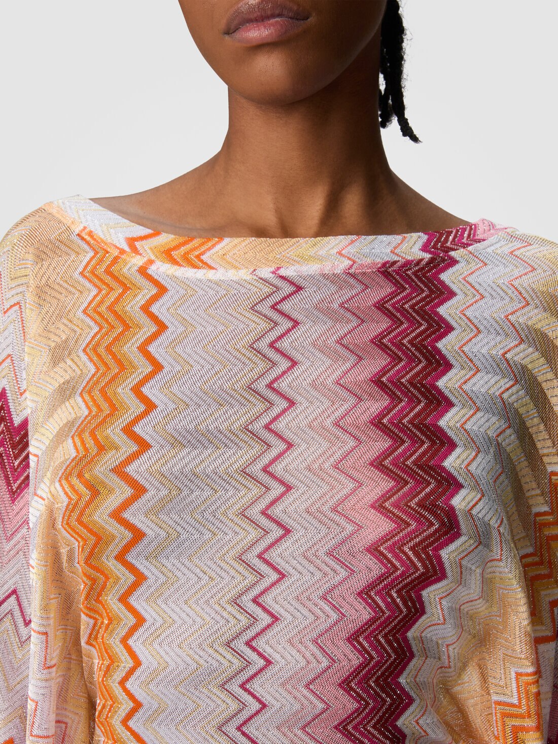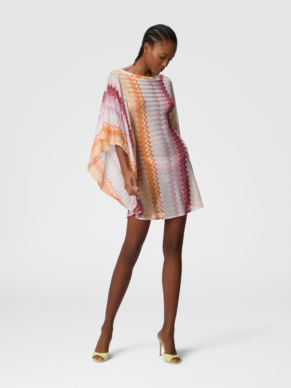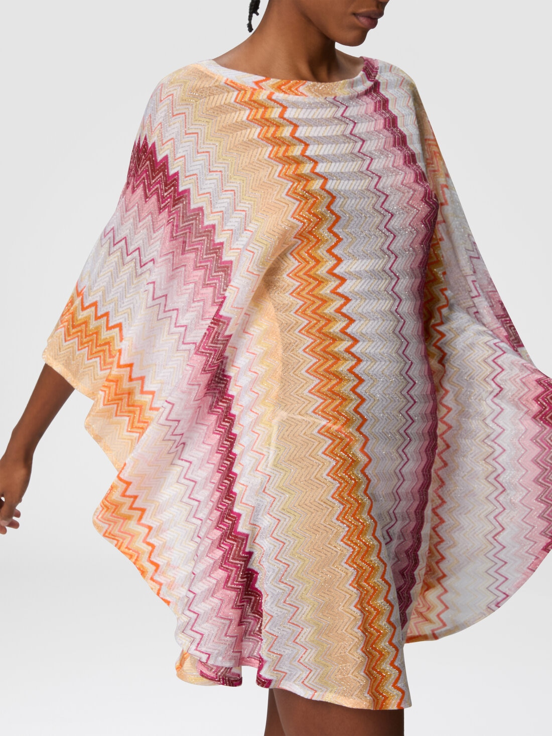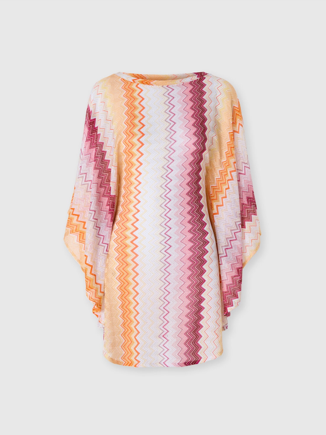 Play with transparencies and metallic reflections in this short cover-up caftan in viscose and lamé blend, enriched with the classic zigzag motif. The wide batwing sleeves give a fluid elegance, while the V-neckline and the soft line give lightness and refinement. A garment that embodies the heritage of the maison, bringing the unmistakable sophisticated and timeless aesthetic of Missoni to the beach.
