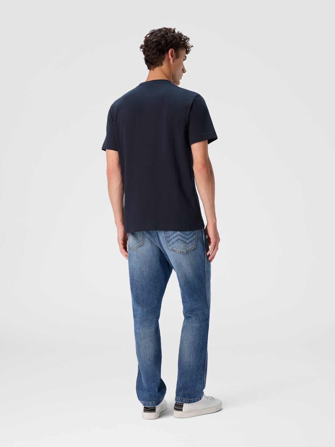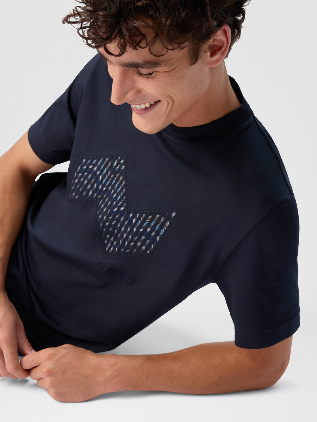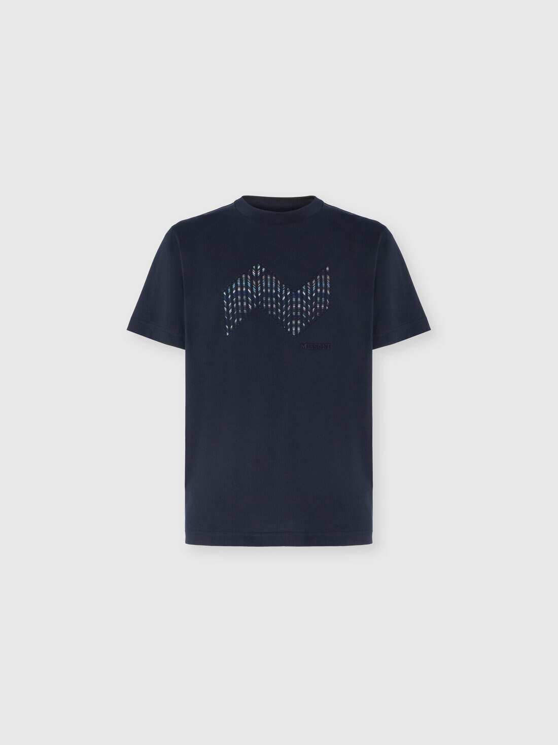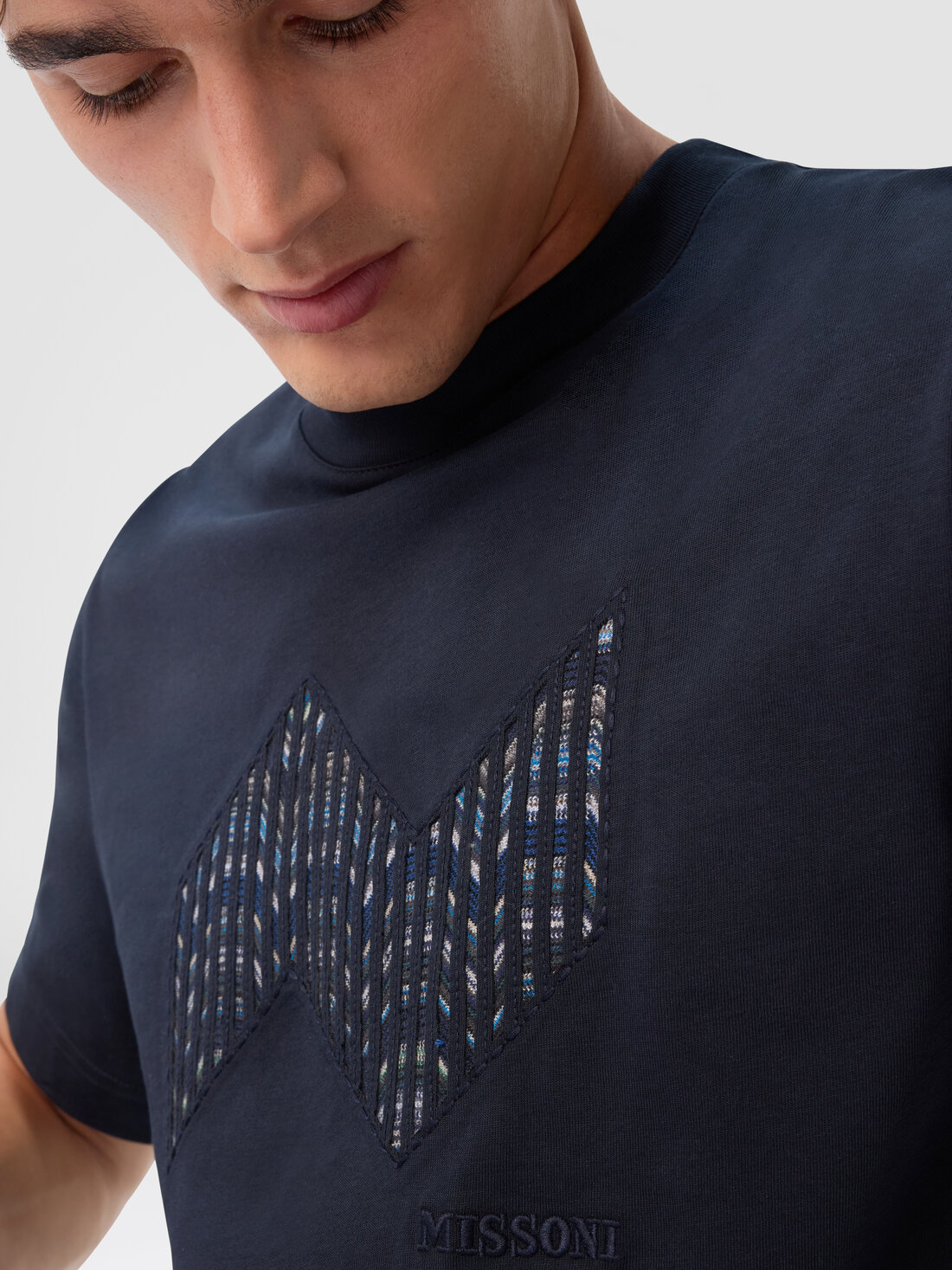 Clean lines and bold graphics define this men’s short-sleeve T-shirt in cotton jersey, offered in a regular fit. The raschel insert highlights an elegant geometric zigzag, reinterpreting one of Missoni’s most iconic patterns with a textural edge. The tone-on-tone embroidered logo adds a subtle yet distinctive touch, signing the garment with elegance.
