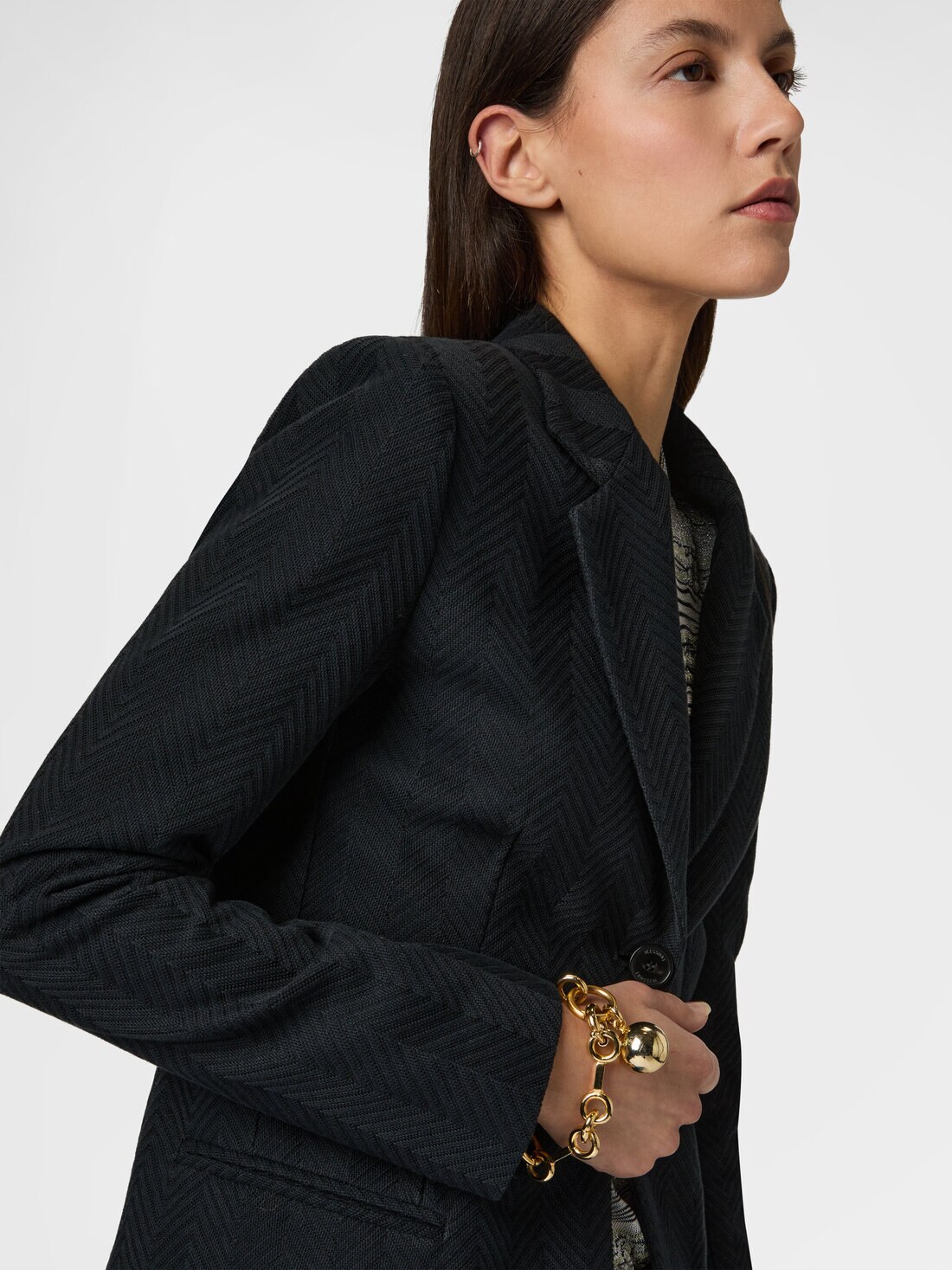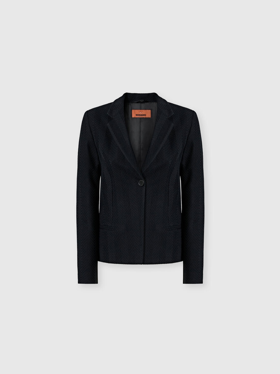 A single-breasted women’s blazer in cotton and viscose blend, animated by the tone-on-tone zigzag motif, a graphic icon of Missoni. The structured cut and slim fit define the silhouette, while the fabric’s texture adds movement and character to the piece.