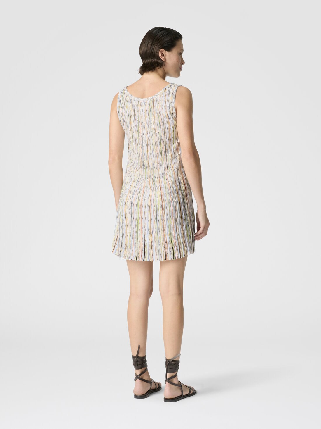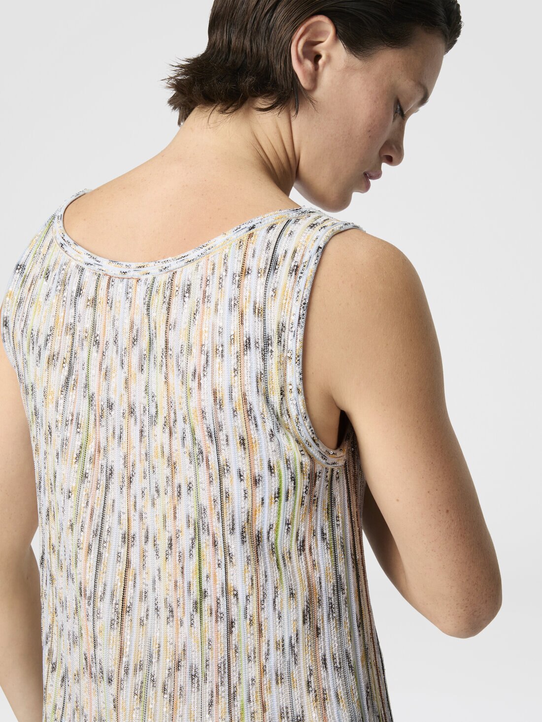 A sleeveless women’s mini dress in ribbed viscose blend, embellished with sequins and finished with a clean crew neckline. The balance between the pure design and luminous details expresses Missoni’s refined creativity.