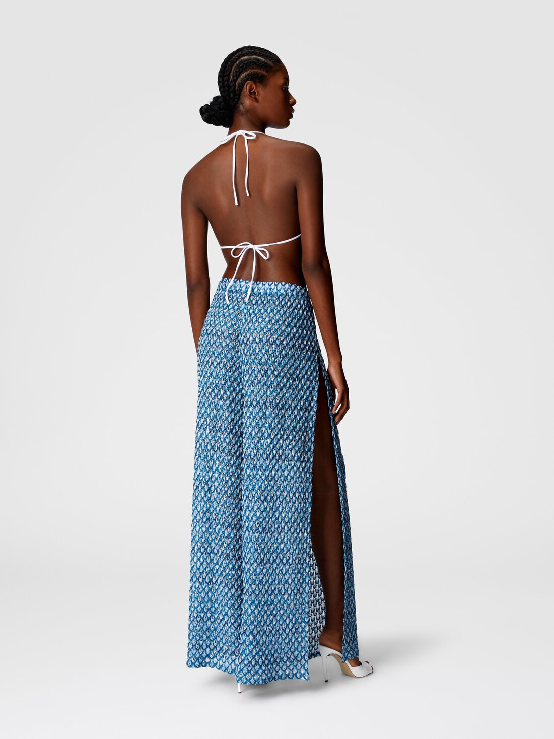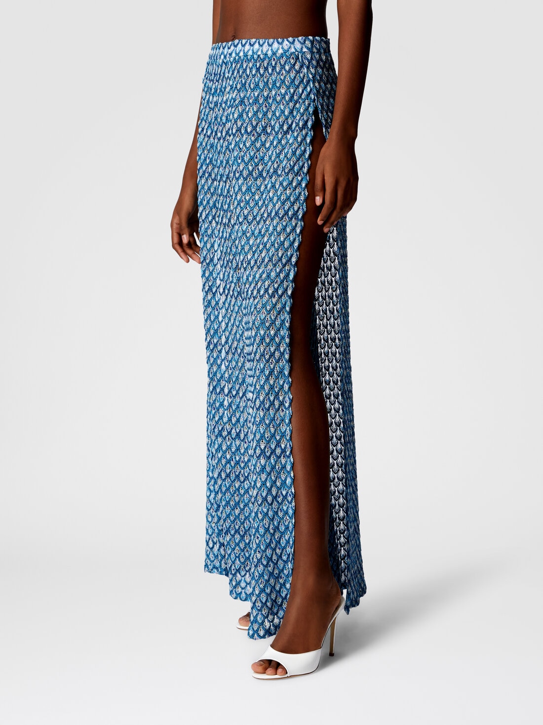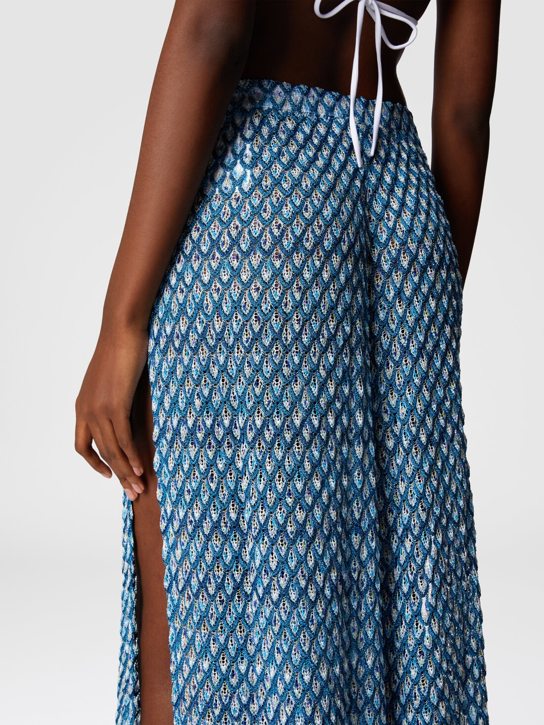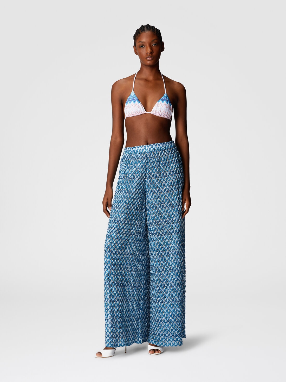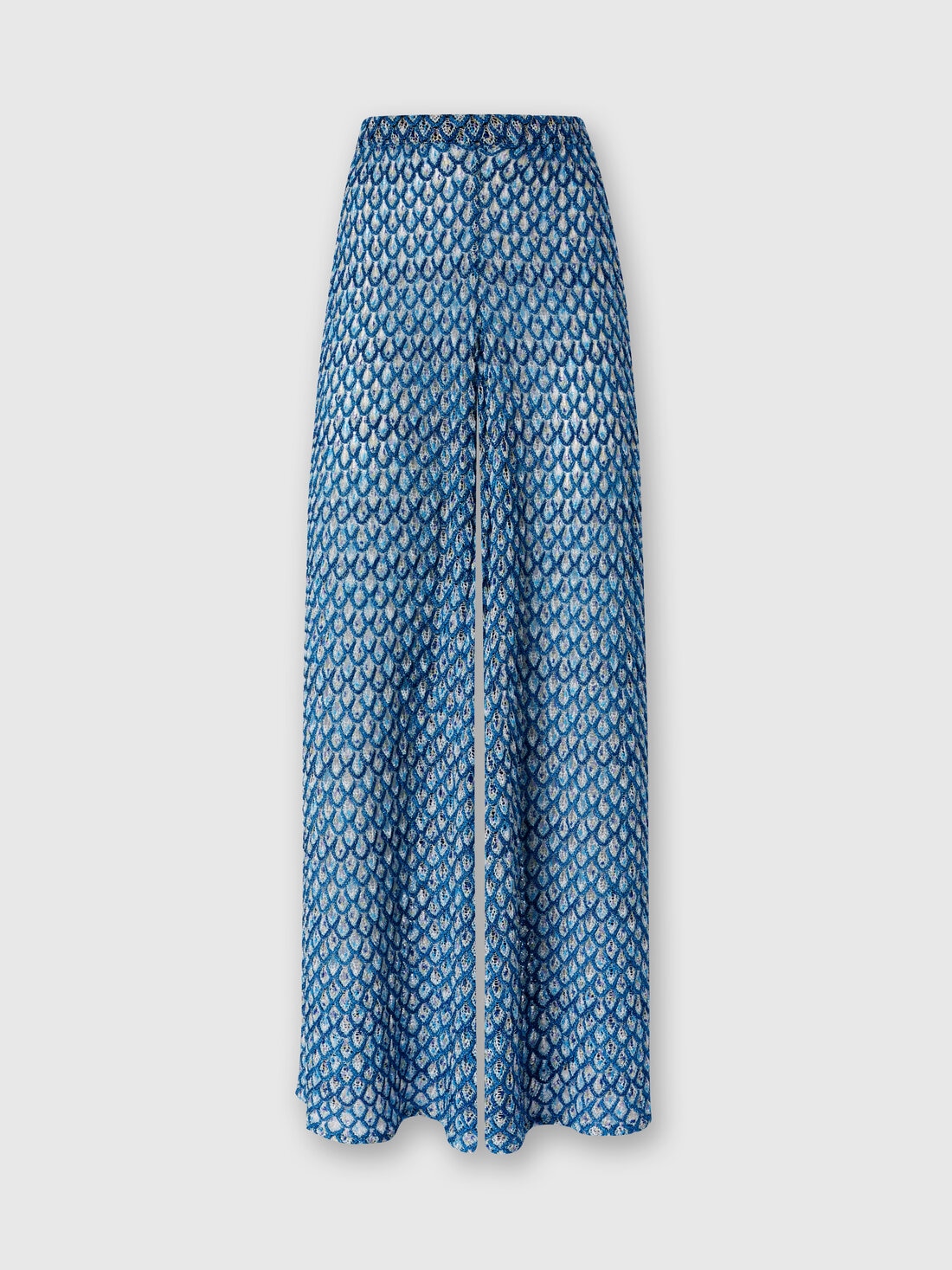 Viscose palazzo trousers with shell motif and lamé accents. The wide and fluid silhouette combines with the decorative texture, creating a refined and luminous visual effect, perfect for a contemporary and elegant look.