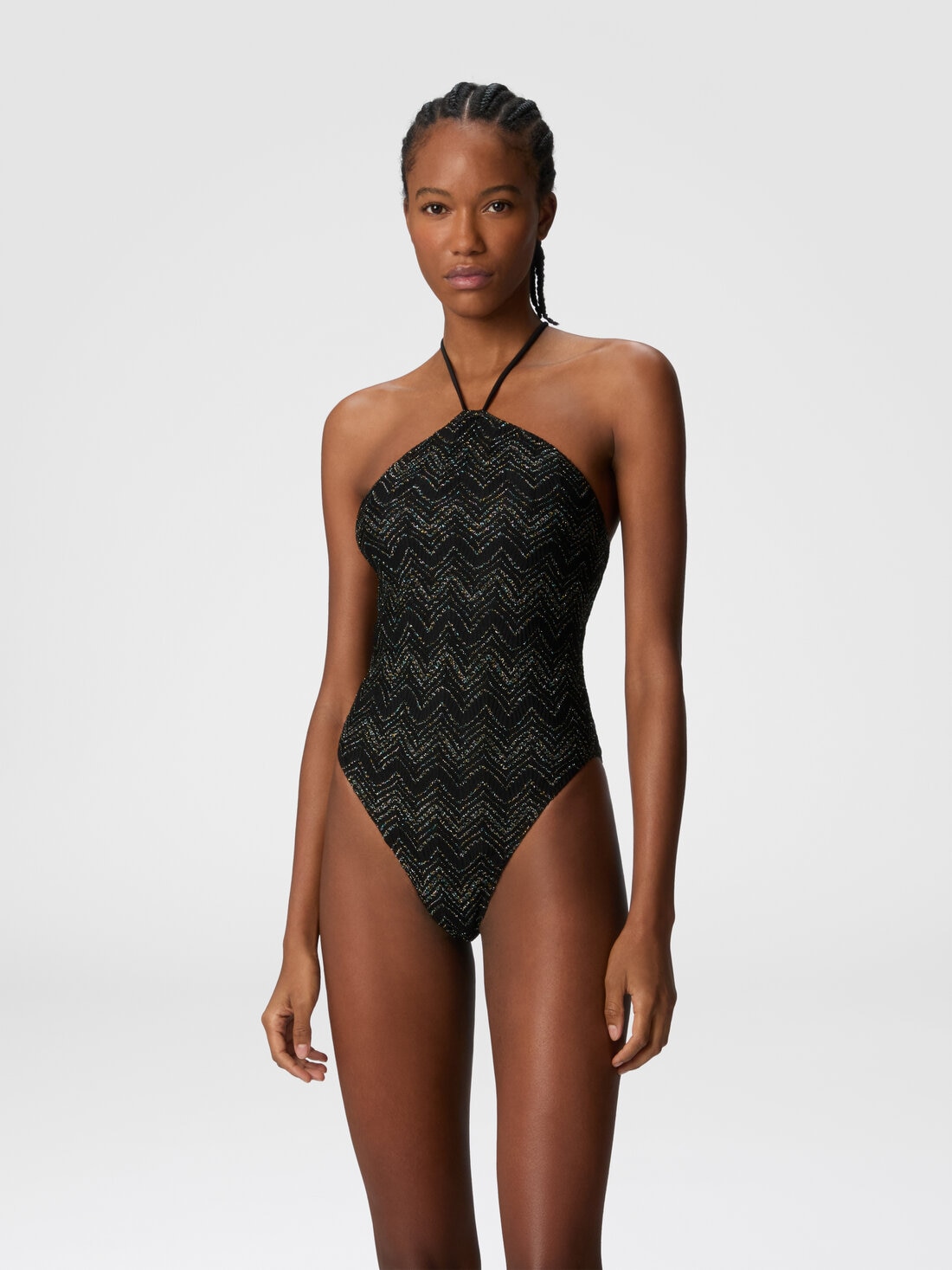 Zig zag lamé viscose one-piece swimsuit with halter neck