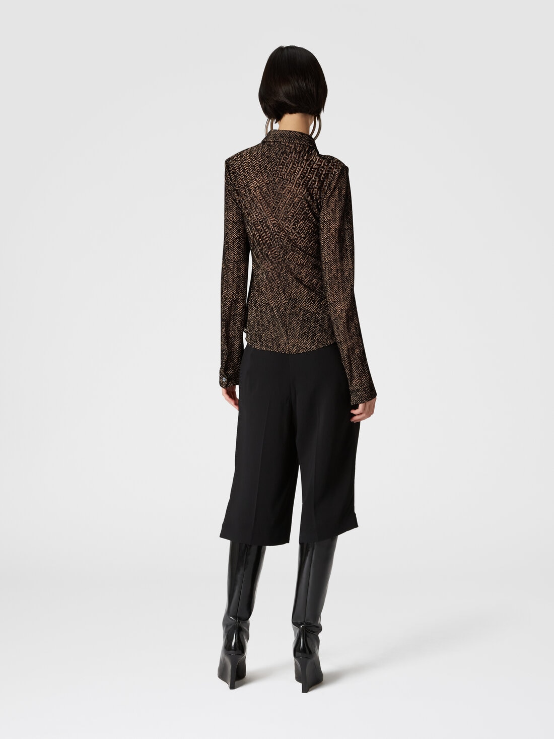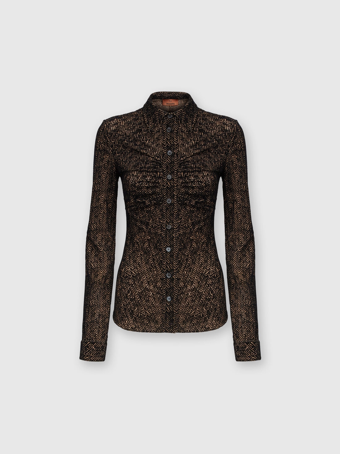 The front gathering and fitted sleeves characterize the tulle shirt with zigzag flocked print. Made of stretch fabric, the garment emphasizes the bust with a new interpretation of the chevron.
