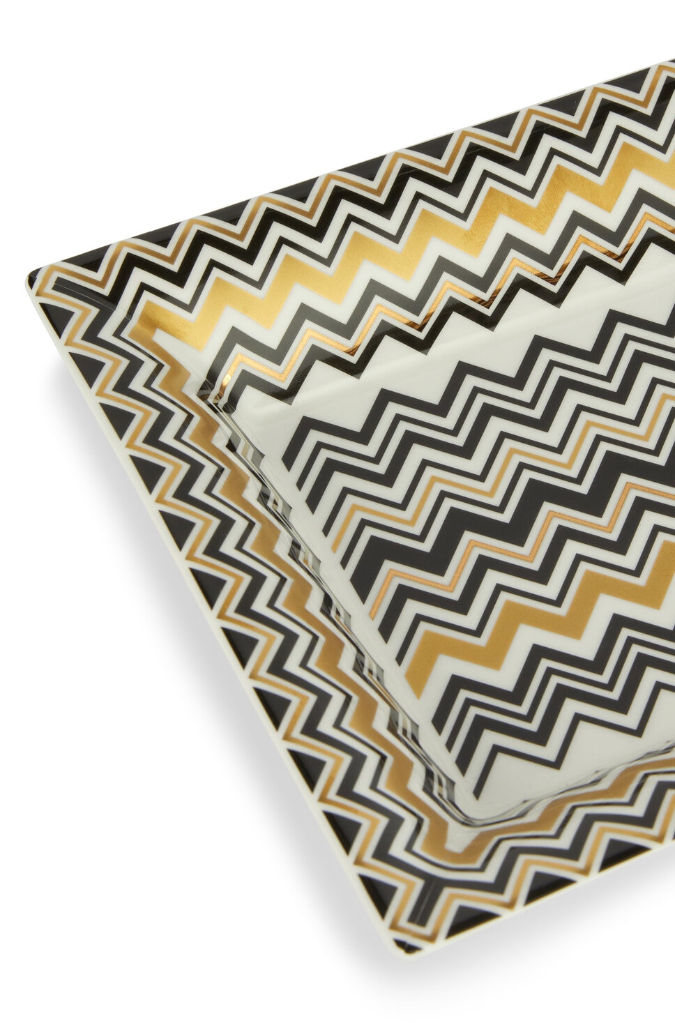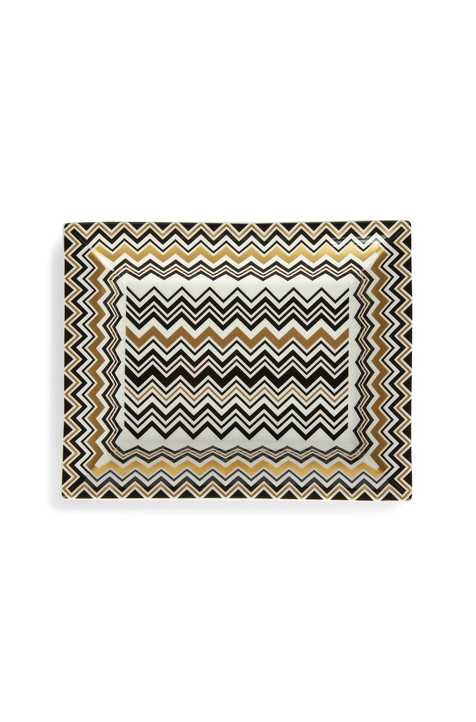 Adding a touch of refined luxury to any home, the rectangular change tray is embellished by the conic Zigzag Gold pattern. This 20x16 cm porcelain accessory is packaged in a branded gift box.