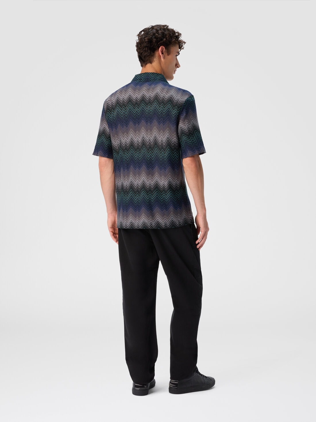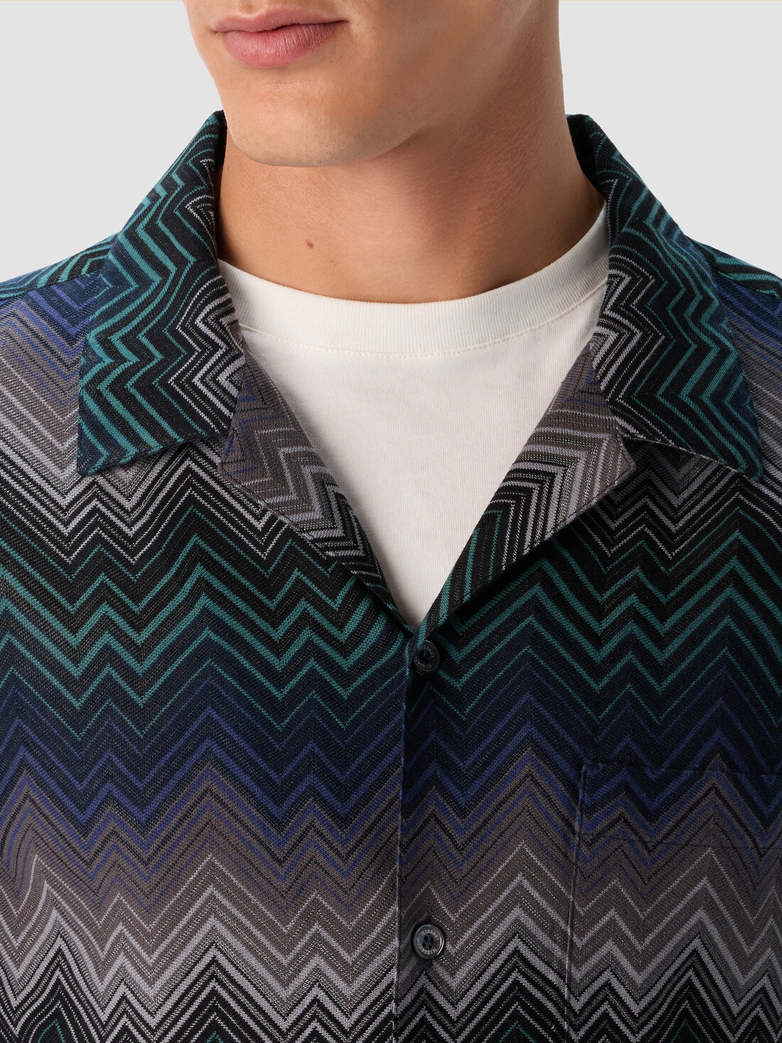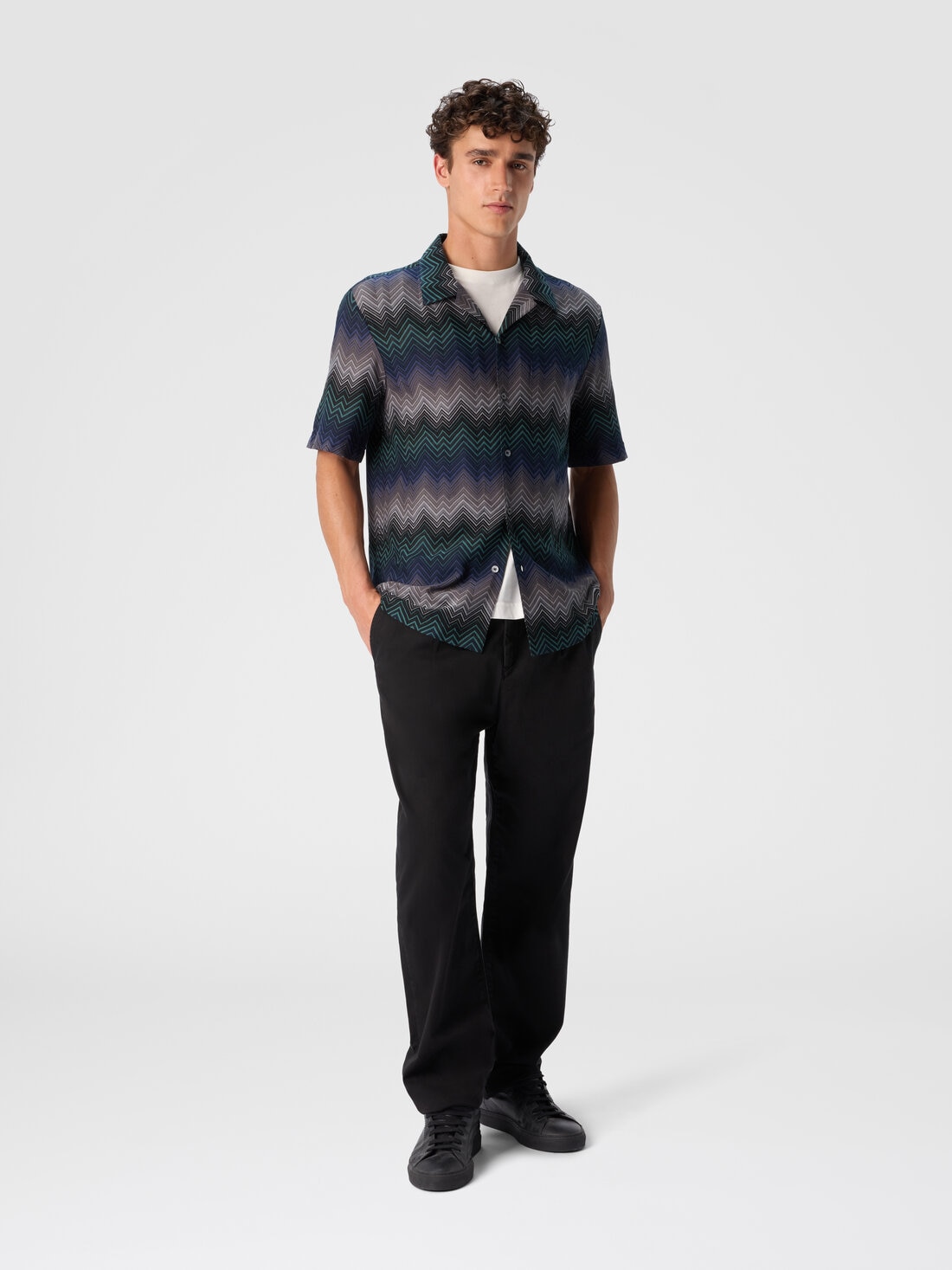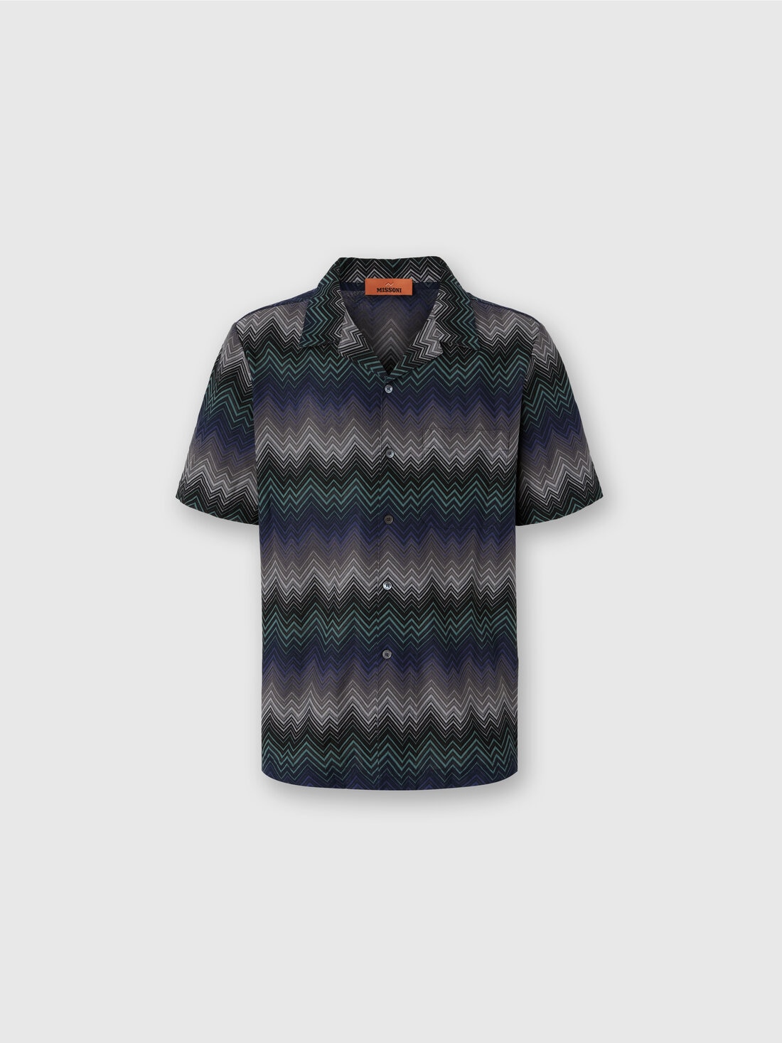 This men’s short-sleeve bowling shirt, made in a cotton blend, is characterized by Missoni’s signature irregular zigzag. Featuring a front pocket and contrasting buttons, it combines the brand’s distinctive design with a modern and versatile silhouette, perfect for adding a touch of elegance to any look.