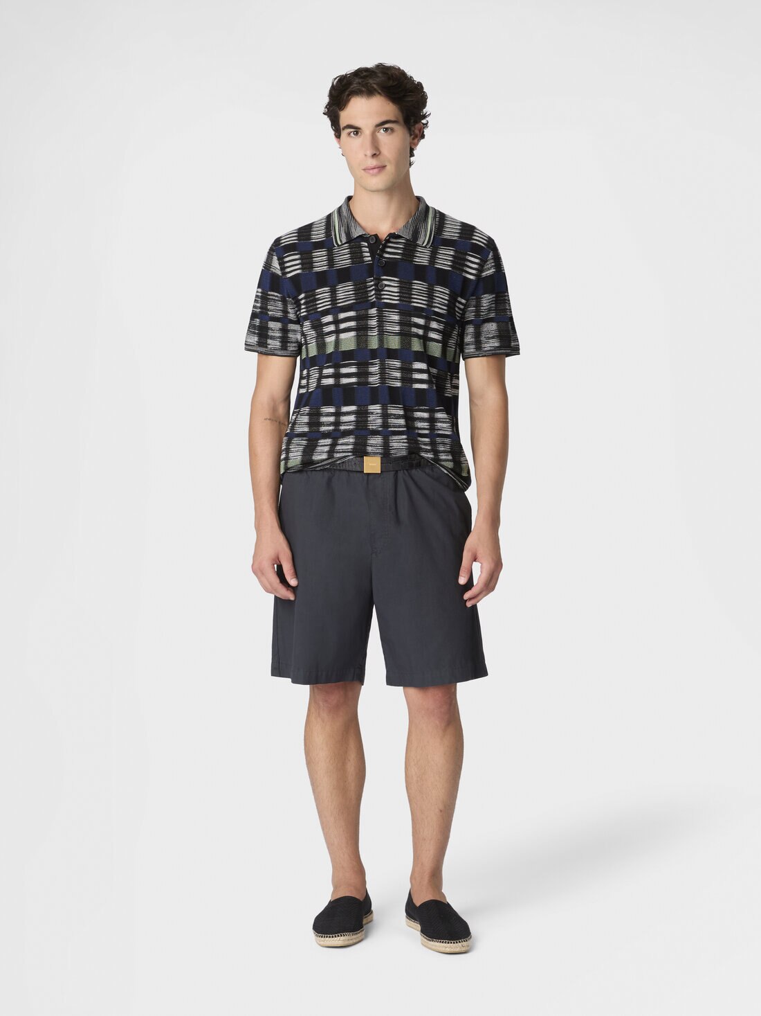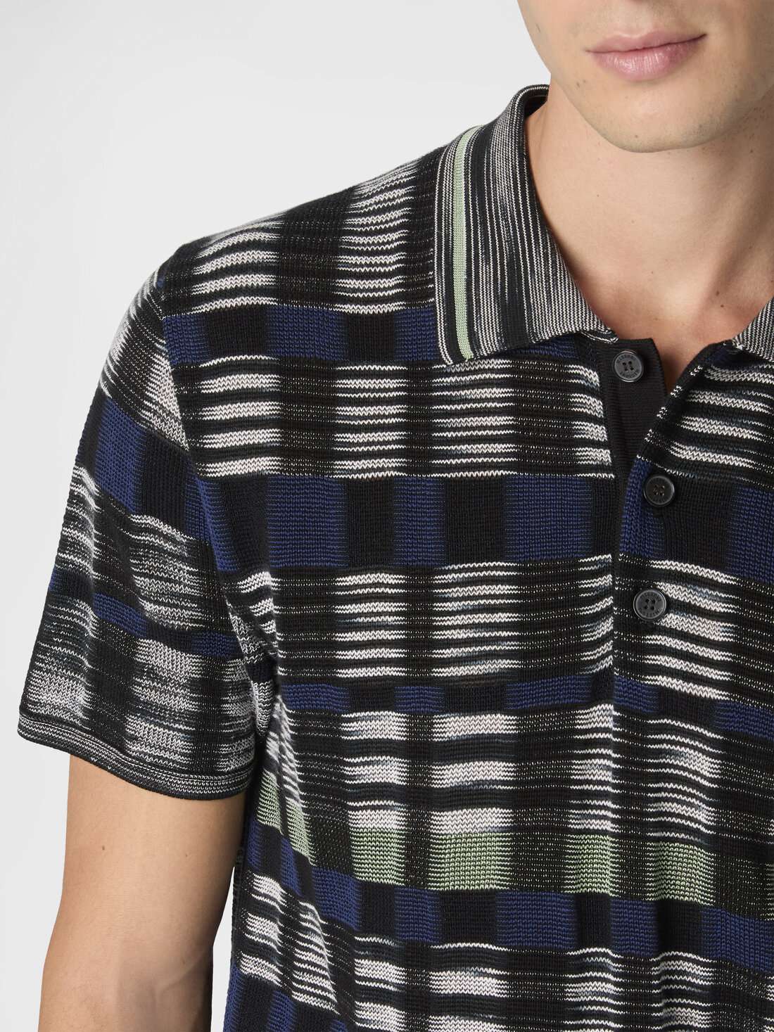 The check pattern adds rhythm and structure to this short-sleeved men’s polo shirt in cotton and viscose, an expression of a refined, contemporary style. The striped collar introduces a sophisticated graphic contrast, completing a garment with the distinctive identity of the Maison.