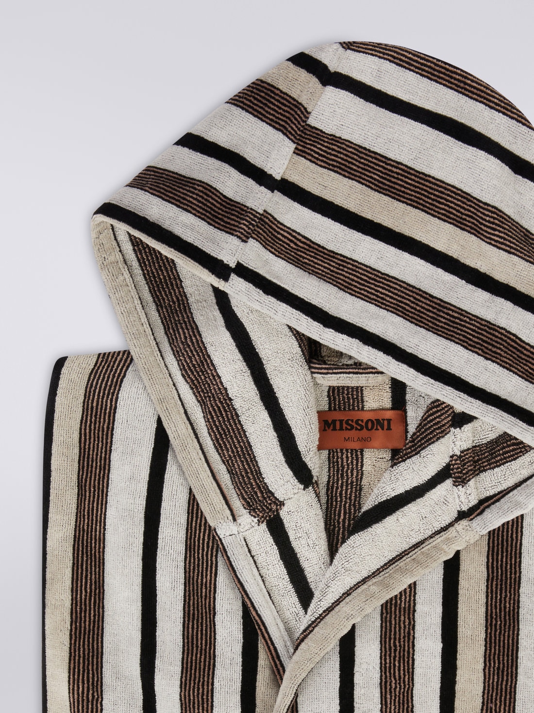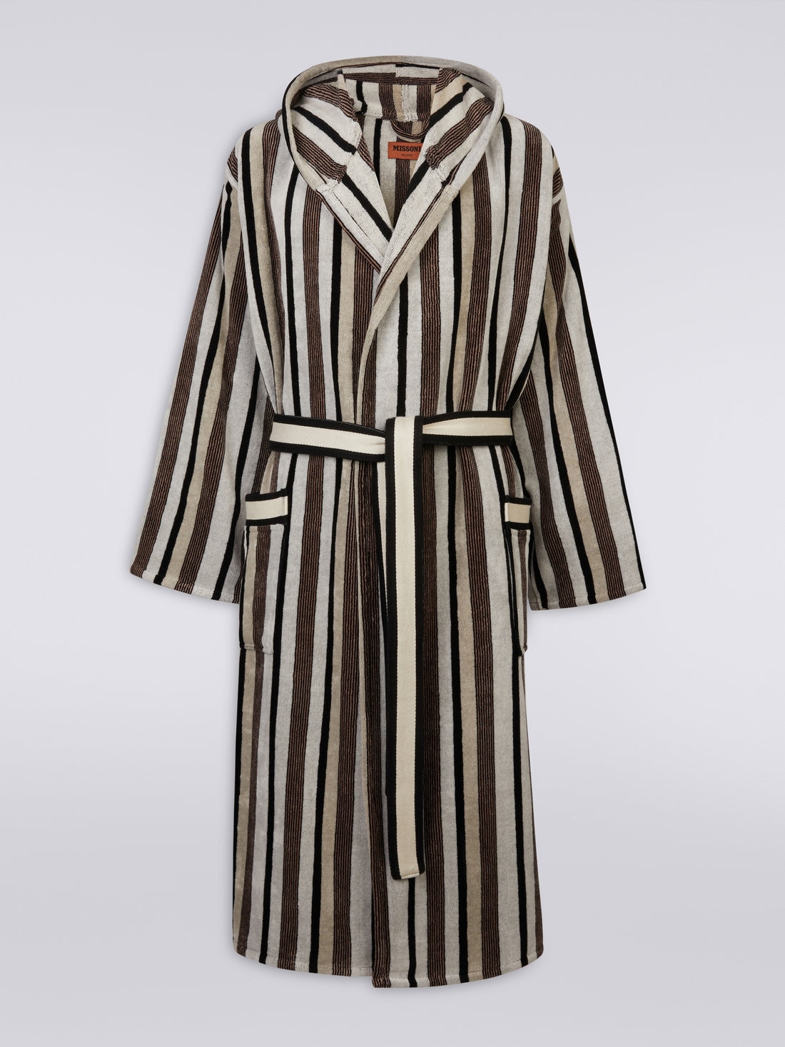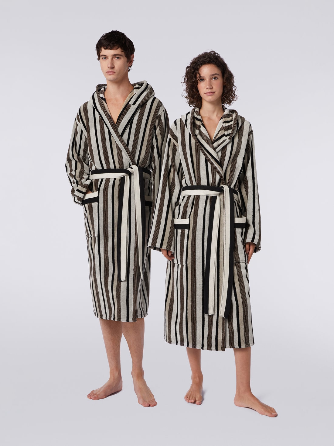 Craig features a refined alternation of vertical stripes in natural tones. Crafted in soft cotton terry, as always, this new bathrobe features a wrap-around hood, waist belt and patch pockets.