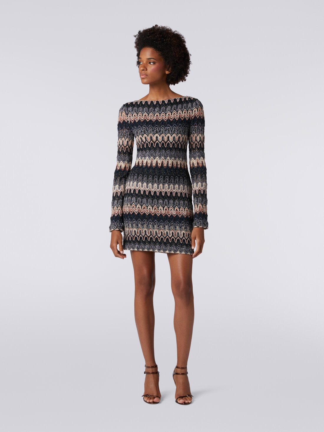 Adorned with a wave motif throughout, the long-sleeved minidress with boat neckline gracefully follows the body’s silhouette. A classic piece, interpreted in a new version embellished with unmistakable details such as lace-effect raschel knit and lamé threads.