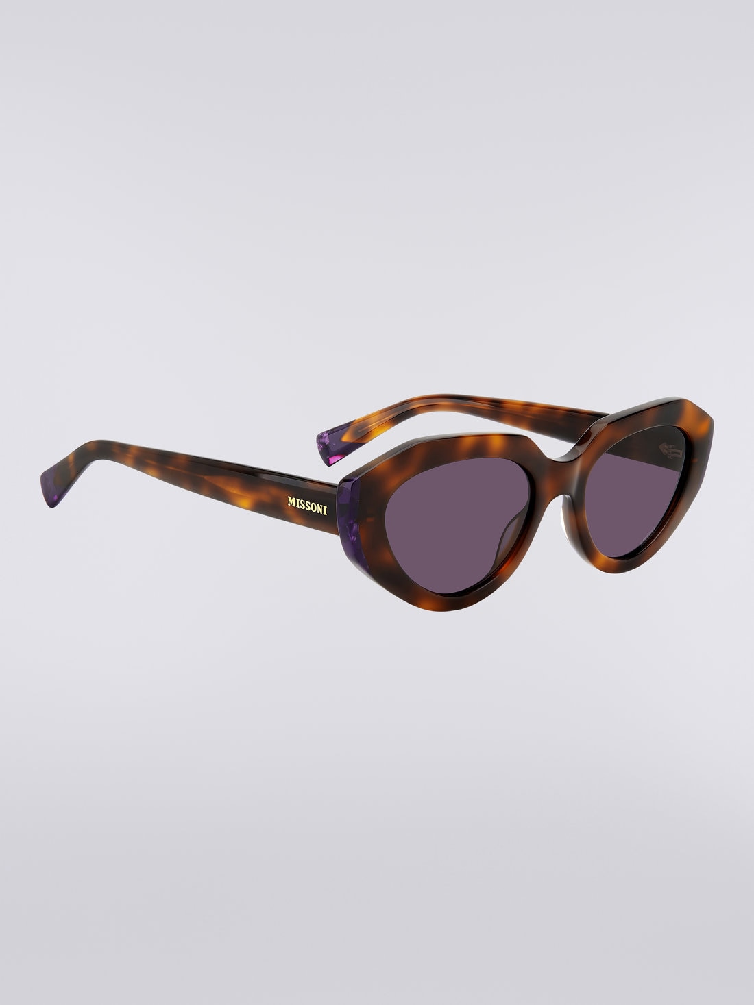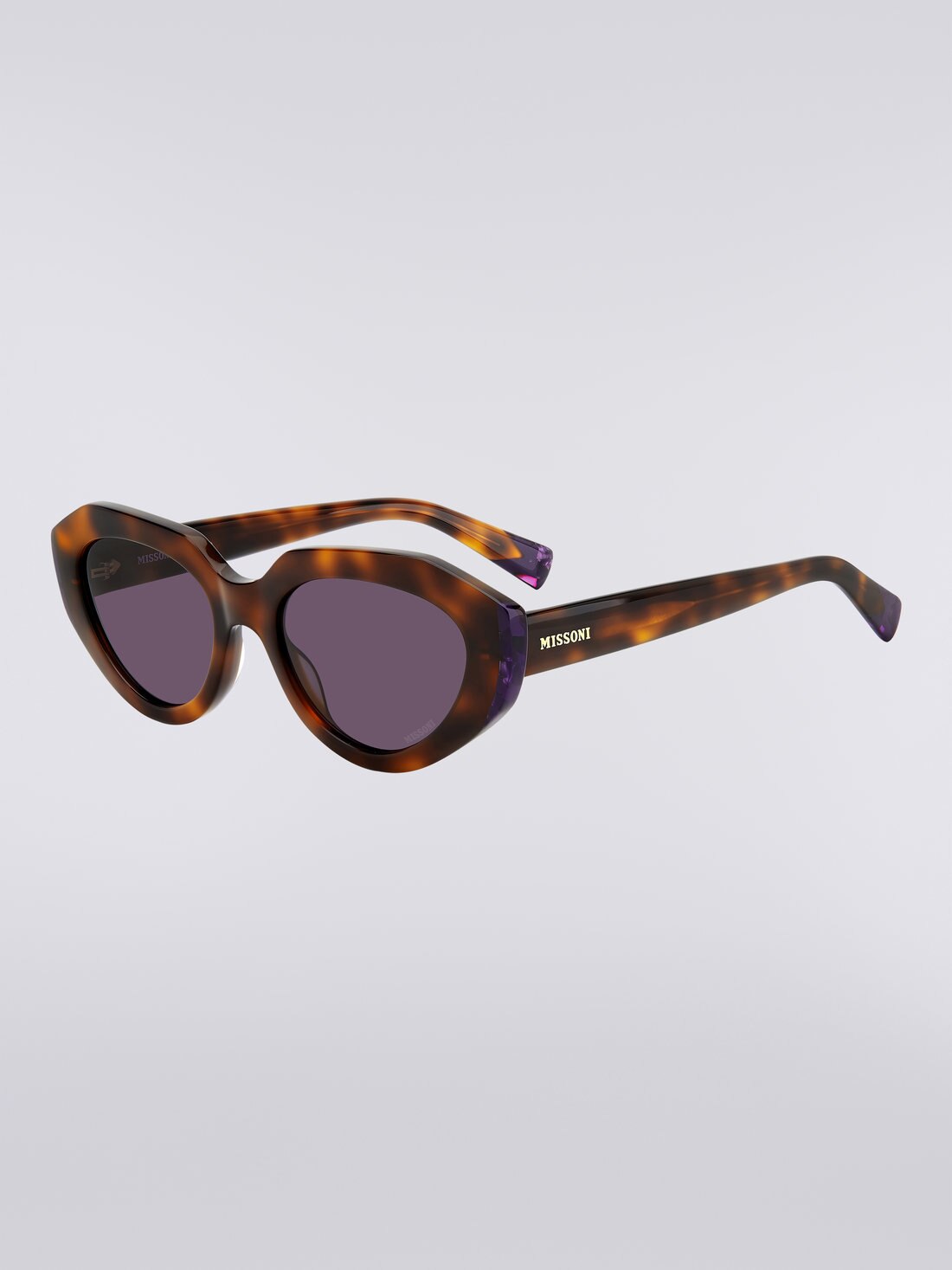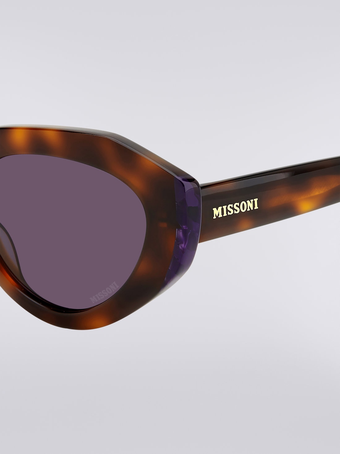 Eclectic colour combinations and the brand's unapologetic attitude to pattern fall centre stage in the Missoni Seasonal eyewear collection, presenting a selection of one-of-a-kind acetate frames guaranteed to turn heads. An ultra-chic oval silhouette elevates these sunglasses, featuring glued lug accents and matching zig zag temple tips in true Missoni style. Complete with lasered zig zag metal temple cores, hot-stamped Missoni lettering and a logo on the lens.