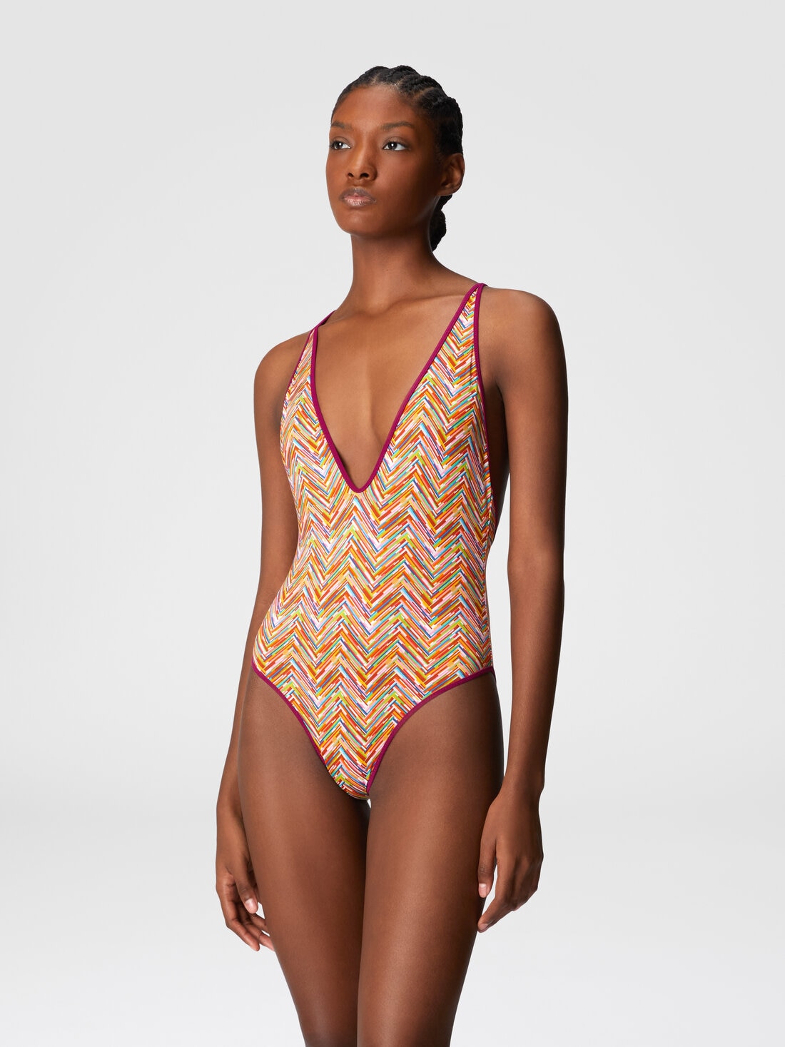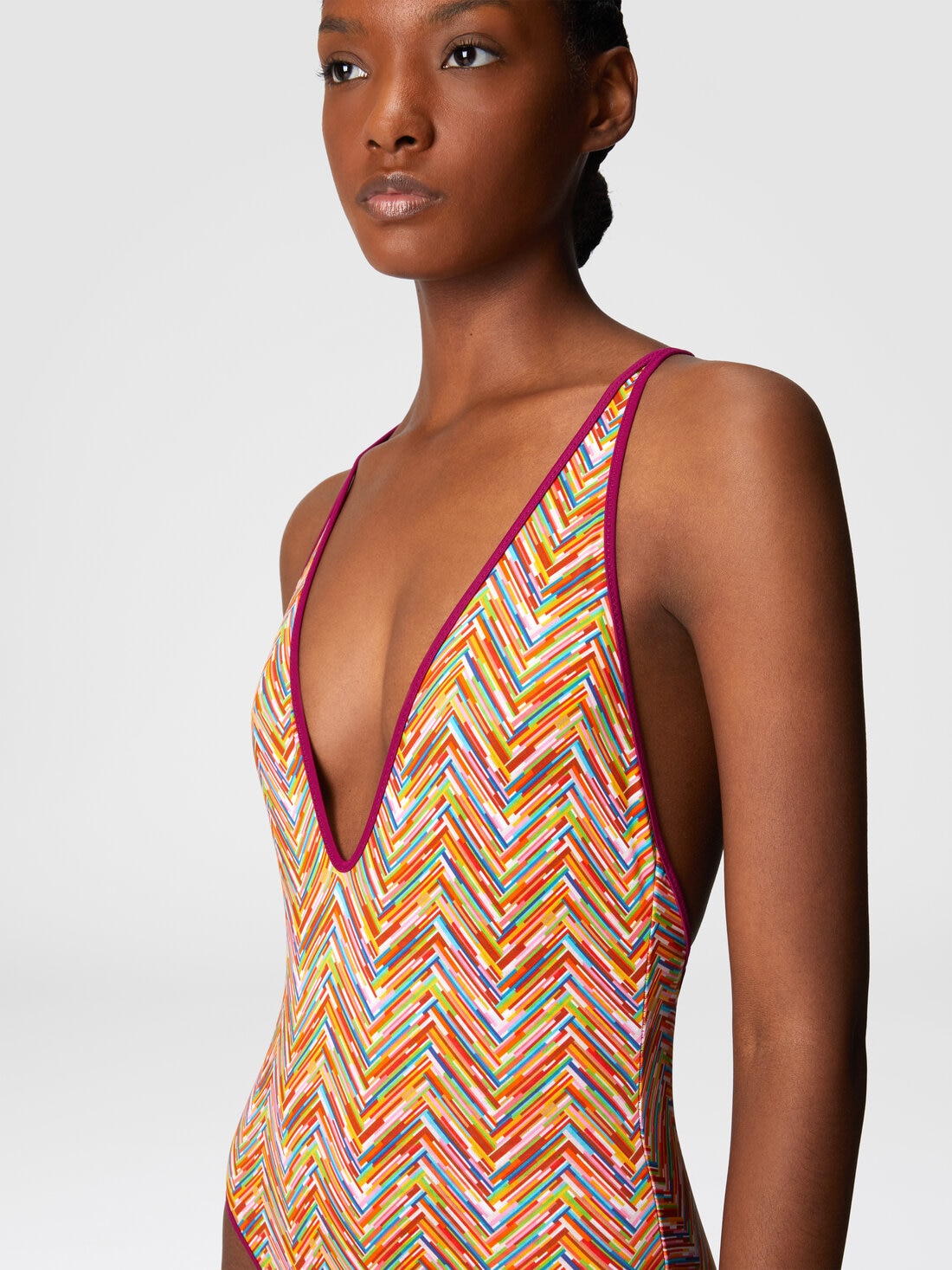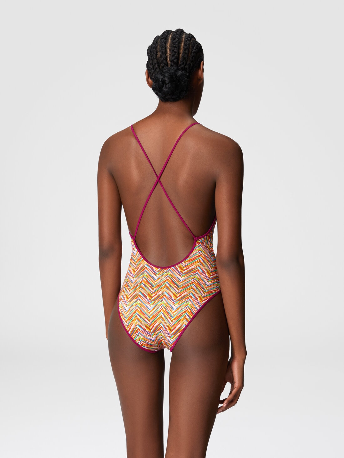A one-piece swimsuit with clean lines and a V-neck, characterized by its reversible functionality. Two distinct designs come together in a single garment, with a graphic print that gives dynamism and versatility, allowing you to change your look in an instant without sacrificing style.